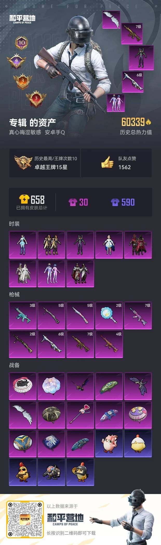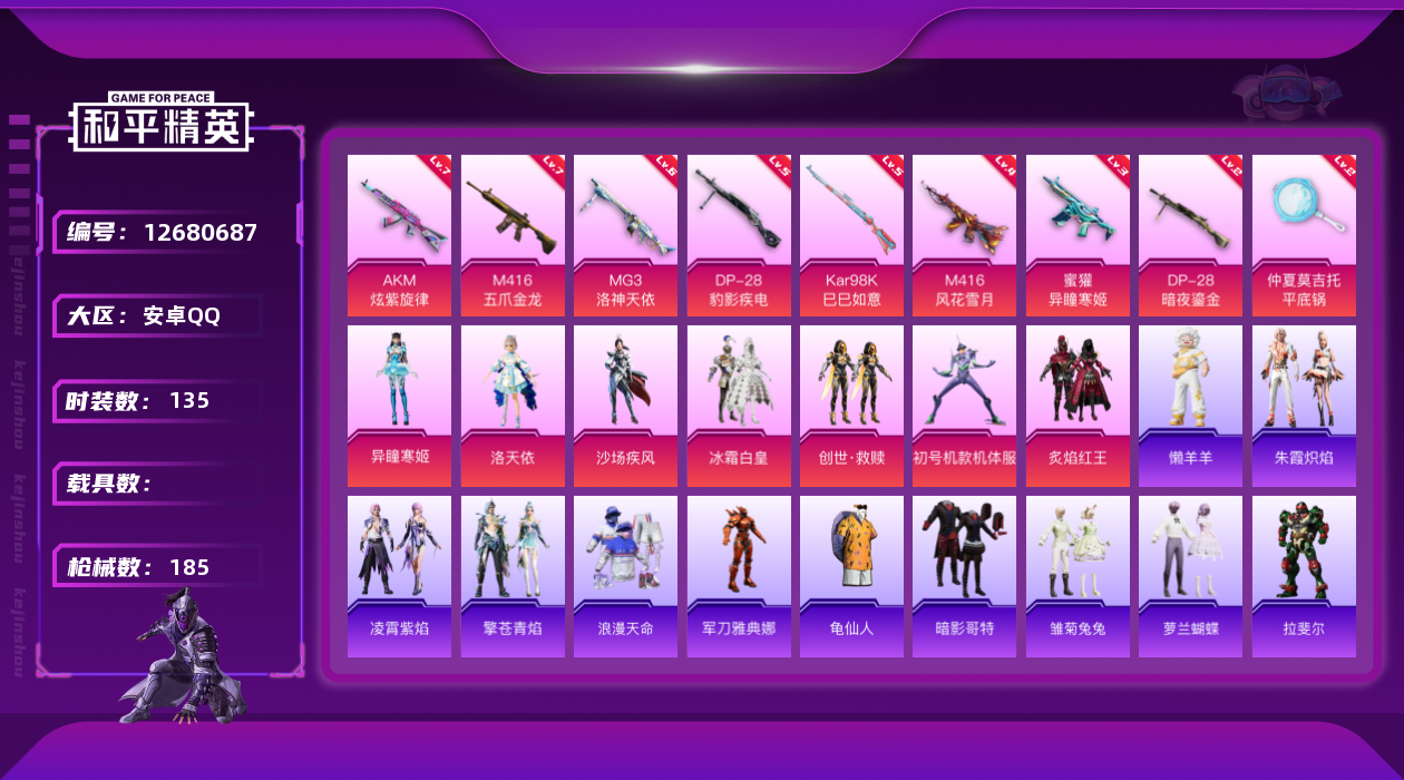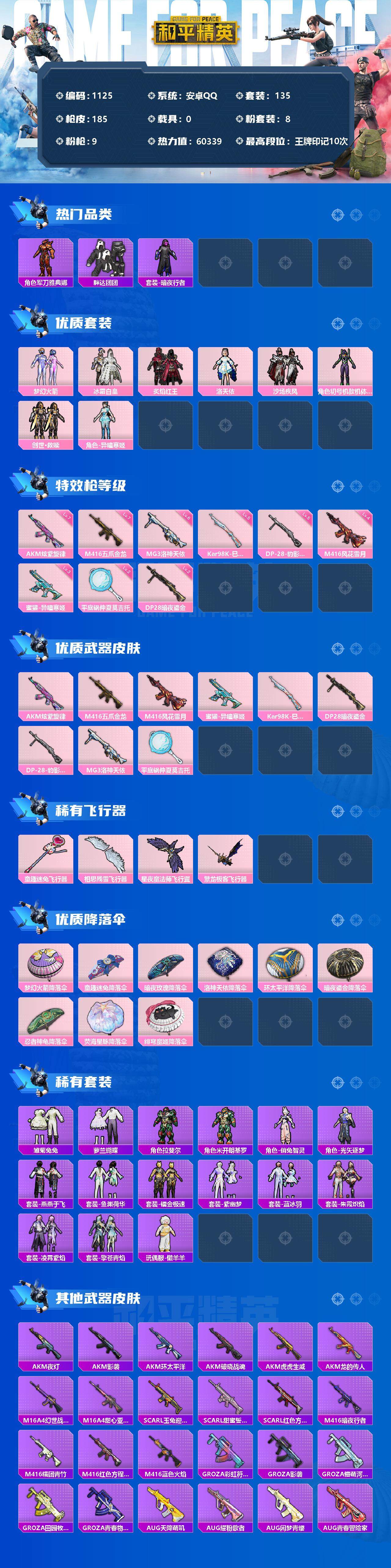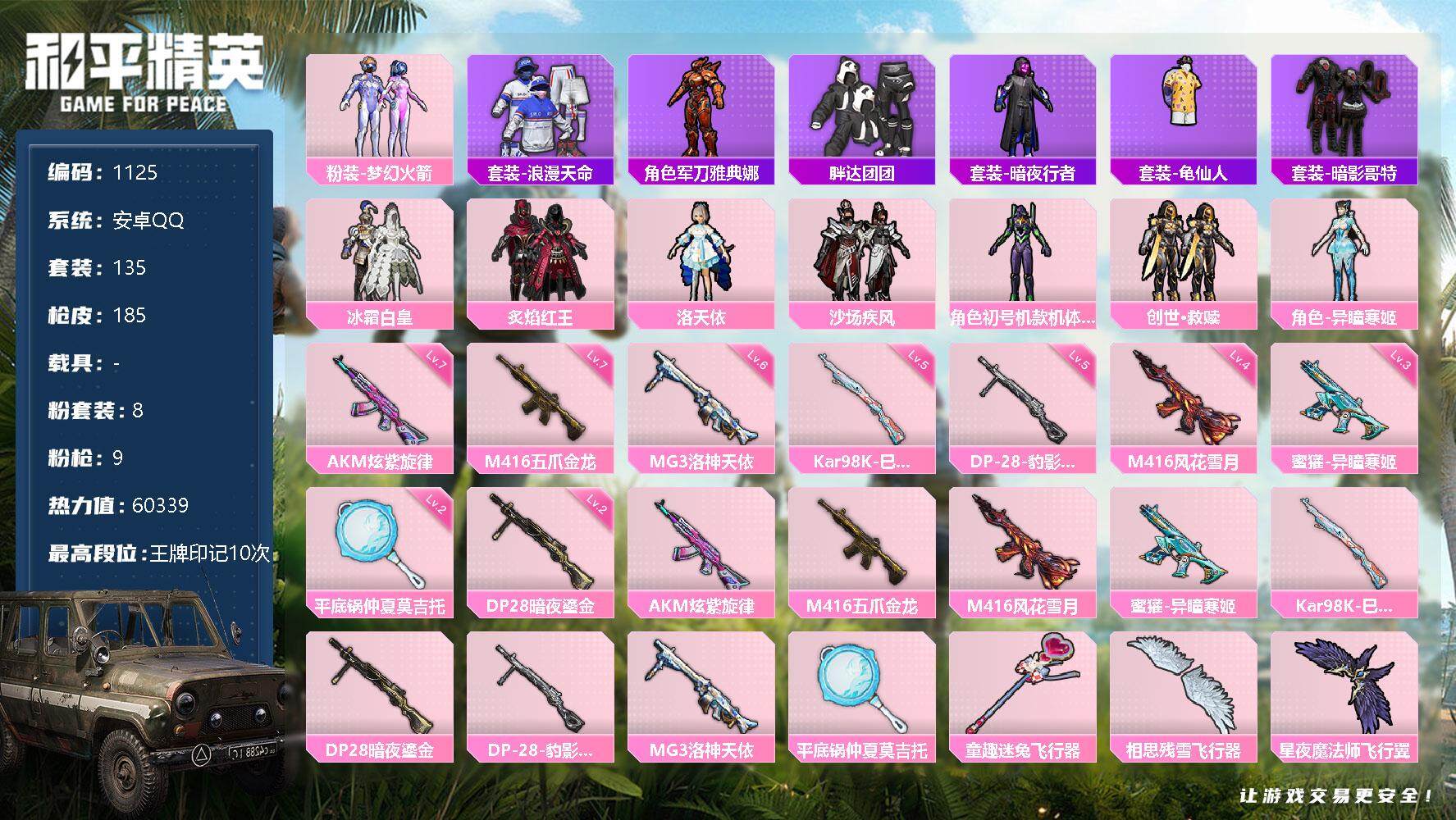 [12680687]安卓 手Q-8粉装-9特效枪-0载具-4粉色飞行器-60339热力值-10王牌印记-135套装-185枪皮 【热门品类】:粉装-梦幻火箭,套装-浪漫天命,角色-军刀雅典娜,套装-胖达团团,套装-暗夜行者,套装-龟仙人,套装-暗影哥特 【粉色套装】:粉装-梦幻火箭,粉装-冰霜白皇,粉装-炙焰红王,角色-洛天依,粉装-沙场疾风,角色-初号机款机体服,套装-创世·救赎,角色-异瞳寒姬 【粉色枪皮等级】:AKM-炫紫旋律(七级),M416-五爪金龙(七级),M416-风花雪月(四级),蜜獾-异瞳寒姬(三级),Kar98K-巳巳如意(五级),DP-28-暗夜鎏金(二级),DP-28-豹影疾电(五级),MG3-洛神天依(六级),平底锅-仲夏莫吉托(二级) 【粉色枪皮】:AKM-炫紫旋律,M416-五爪金龙,M416-风花雪月,蜜獾-异瞳寒姬,Kar98K-巳巳如意,DP-28-暗夜鎏金,DP-28-豹影疾电,MG3-洛神天依,平底锅-仲夏莫吉托 【粉色飞行器】:童趣迷兔飞行器,相思残雪飞行器,星夜魔法师飞行翼,繁龙极客飞行器 【粉色降落伞】:梦幻火箭降落伞,童趣迷兔降落伞,暗夜玫瑰降落伞,洛神天依降落伞,环太平洋降落伞,暗夜鎏金降落伞,忍者神龟降落伞,荧海星豚降落伞,绯穹魔姬降落伞 【稀有套装】:套装-龟仙人,套装-雏菊兔兔,套装-萝兰蝴蝶,角色-拉斐尔,角色-米开朗基罗,角色-俏兔智灵,角色-光矢逐梦,套装-燕燕于飞,套装-鱼渊荷华,套装-镭金极速,套装-紫幽梦,套装-蓝冰羽,套装-朱霞炽焰,套装-凌霄紫焰,套装-擎苍青焰,玩偶服-懒羊羊 【稀有枪皮】:AKM-夜灯,AKM-影袭,AKM-环太平洋,AKM-破晓战魂,AKM-虎虎生威,AKM-龙的传人,M16A4-幻世战舞者,M16A4-甜心亚梦,SCAR-L-玉兔迎春,SCAR-L-甜蜜誓约,SCAR-L-红色方程式,M416-暗夜行者,M416-糯团青竹,M416-红色方程式,M416-蓝色火焰,GROZA-彩虹符号,GROZA-影袭,GROZA-懵萌河马,GROZA-田园牧歌,GROZA-青春物语,AUG-天降萌叽,AUG-耀粉歌者,AUG-闲梦青缨,AUG-青春冒险家,QBZ-洛神天依,M762-天降萌叽,M762-瑞龙福将,Mk47-妙红点点,Mk47-洛神天依,Mk47-百万伏特,Mk47-粉色回忆,G36C-懵