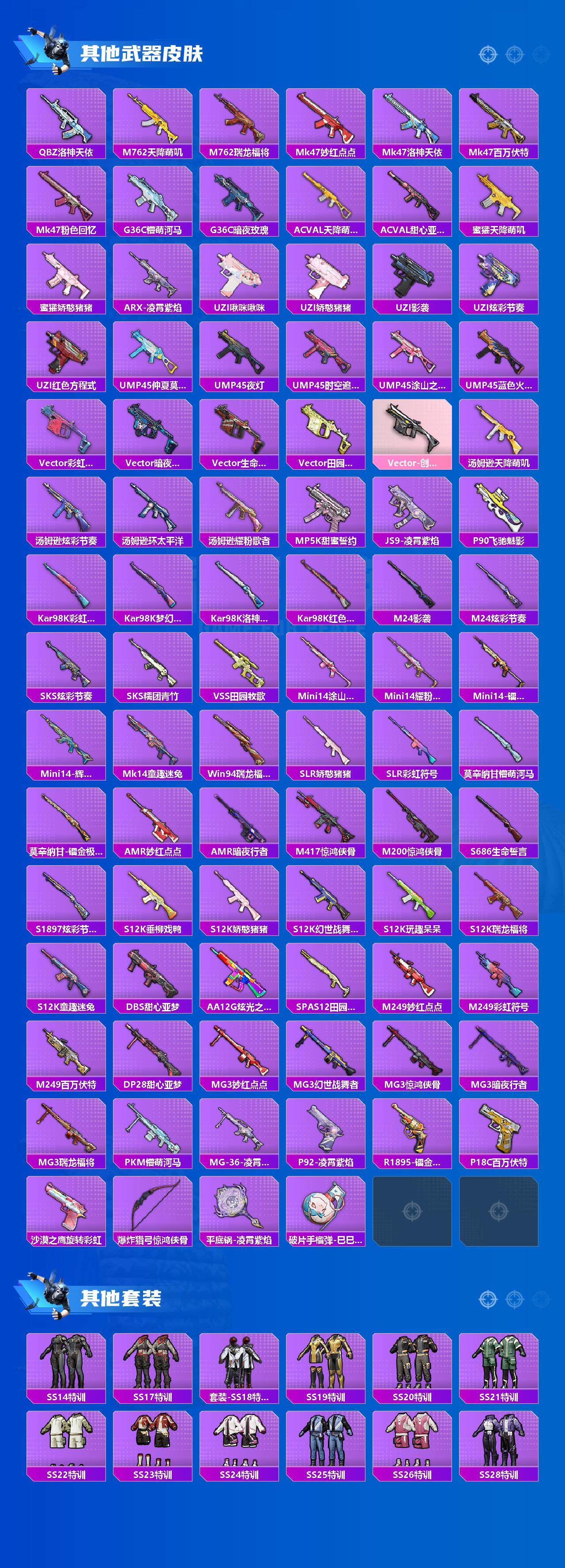 【稀有枪皮】:AKM-夜灯,AKM-影袭,AKM-环太平洋,AKM-破晓战魂,AKM-虎虎生威,AKM-龙的传人,M16A4-幻世战舞者,M16A4-甜心亚梦,SCAR-L-玉兔迎春,SCAR-L-甜蜜誓约,SCAR-L-红色方程式,M416-暗夜行者,M416-糯团青竹,M416-红色方程式,M416-蓝色火焰,GROZA-彩虹符号,GROZA-影袭,GROZA-懵萌河马,GROZA-田园牧歌,GROZA-青春物语,AUG-天降萌叽,AUG-耀粉歌者,AUG-闲梦青缨,AUG-青春冒险家,QBZ-洛神天依,M762-天降萌叽,M762-瑞龙福将,Mk47-妙红点点,Mk47-洛神天依,Mk47-百万伏特,Mk47-粉色回忆,G36C-懵