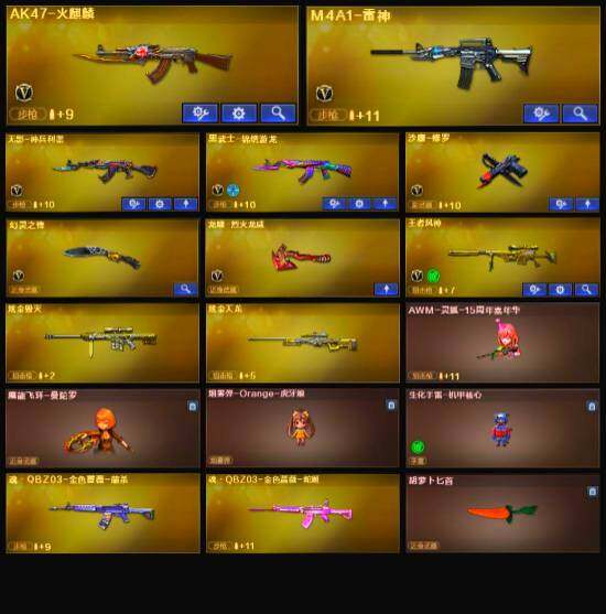 【英雄级武器】:幻灵之锋,无影-神兵利器,M4A1-雷神,AK47-火麒麟,黑武士-锦绣游龙,沙鹰-修罗