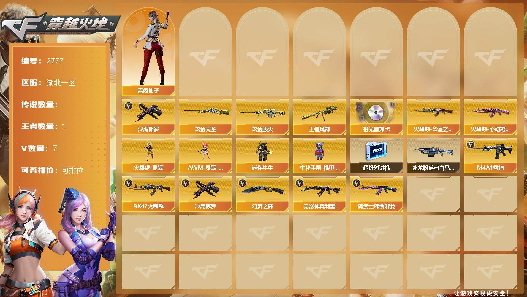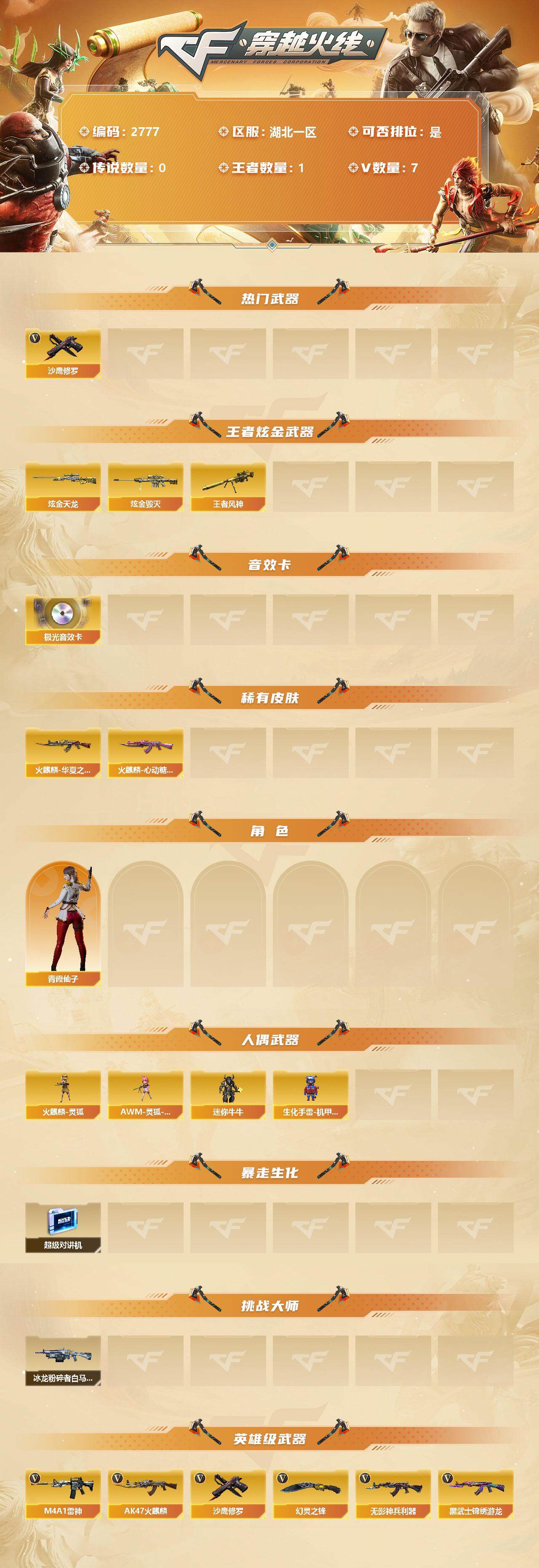[12680794]湖北一区-7V-1王者-2炫金 【热门武器】:沙鹰-修罗 【王者炫金武器】:炫金天龙,炫金毁灭,王者风神 【音效卡】:Barrett-极光音效卡 【稀有皮肤】:火麒麟-华夏之心,火麒麟-心动糖果 【角色】:青霞仙子 【人偶武器】:火麒麟-灵狐,AWM-灵狐-15周年嘉年华,迷你牛牛,生化手雷-机甲核心 【暴走生化】:超级对讲机 【挑战大师】:冰龙粉碎者-白马银枪 【英雄级武器】:幻灵之锋,无影-神兵利器,M4A1-雷神,AK47-火麒麟,黑武士-锦绣游龙,沙鹰-修罗 【特殊枪械】: