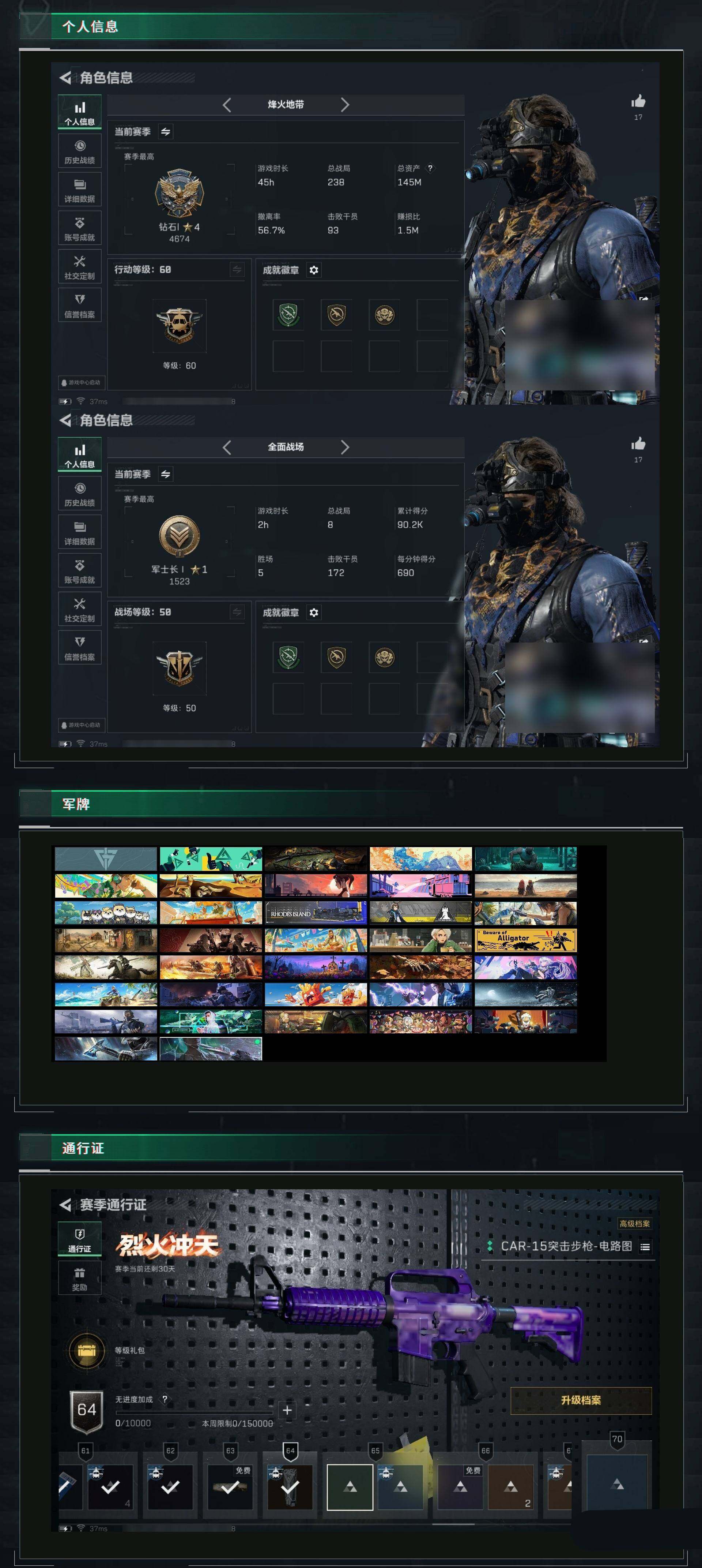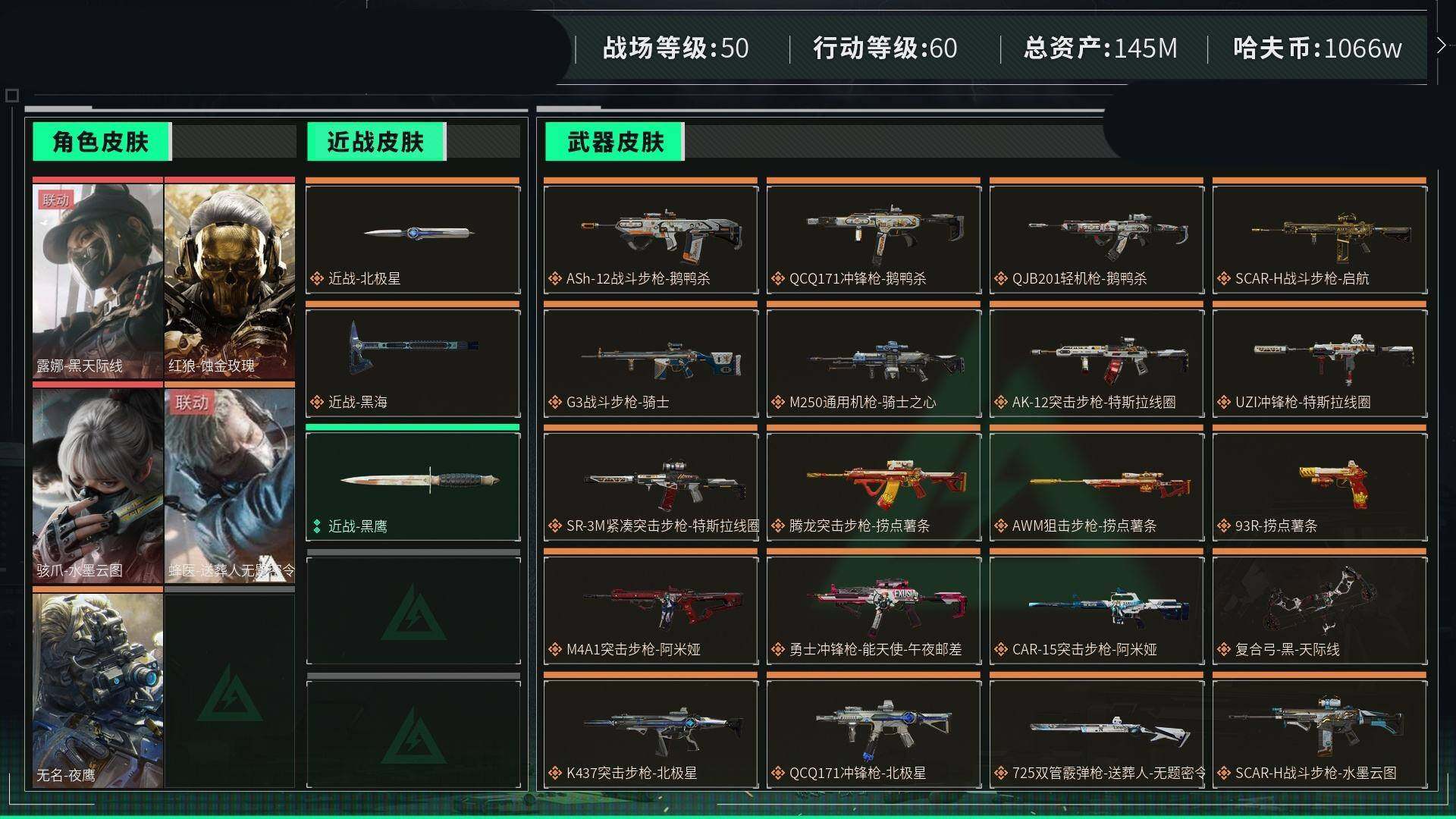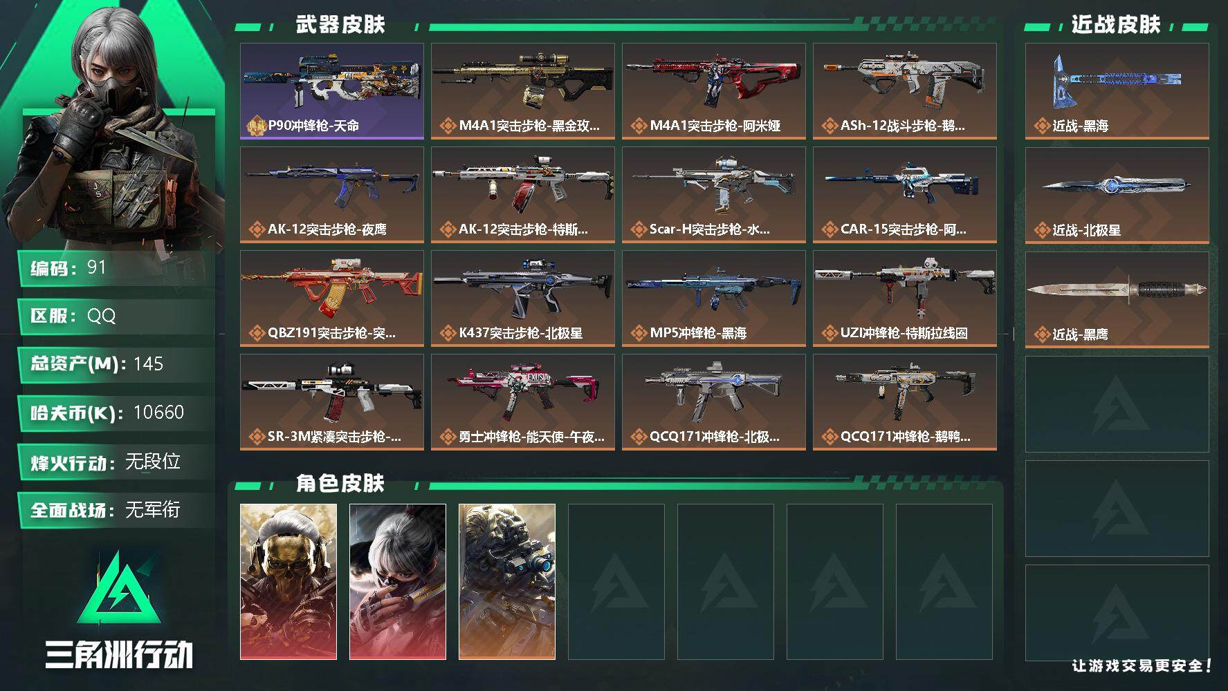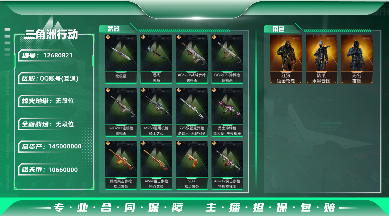 [12680821]汤39075总资产145M,哈夫币1066w,近战-北极星/近战-黑海,露娜-黑天际线/红狼-蚀金玫瑰/骇爪-水墨云图/蜂医-送葬人无题密令/无名-夜鹰,枪皮数量186,战场等级:50 军士长,行动等级:60 钻石,安全箱等时效性道具请以游戏内数据为准;详情请看【个人信息】战场等级:50 军士长,行动等级:60 钻石【哈夫币】1066w【总资产】145M【货币】145三角币/0曼德尔币/0三角券【安全箱】基础安全箱2(1x2)/S6高级安全箱6(2x3)【通行证】烽火地带限定版【特勤处】制药台Lv.3/工作台Lv.3/仓库Lv.8/防具台Lv.3/训练中心Lv.7/靶场Lv.6/技术中心Lv.3/指挥中心Lv.6/潜水中心Lv.1/收藏室Lv.1【角色皮肤】露娜-黑天际线/骇爪-水墨云图/红狼-蚀金玫瑰/无名-夜鹰/蜂医-送葬人无题密令/【已拥有捆绑包】黑海捆绑包/北极星捆绑包/捞点薯条捆绑包/特斯拉线圈捆绑包/【近战皮肤】近战-黑鹰/近战-黑海/近战-北极星/【步枪皮肤】M4A1突击步枪-蚀金玫瑰/SCAR-H战斗步枪-水墨云图/AUG突击步枪-蝮蛇/AK-12突击步枪-夜鹰/SG552突击步枪-尖端治疗/AS Val突击步枪-尖端治疗/ASh-12战斗步枪-守夜人/AKM突击步枪-林中猎手/PTR-32突击步枪-英雄/K437突击步枪-北极星/腾龙突击步枪-无垢/SCAR-H战斗步枪-囚徒/M16A4突击步枪-竞赛选手/SR-3M紧凑突击步枪-荒野求生/CAR-15突击步枪-阿米娅/M4A1突击步枪-阿米娅/腾龙突击步枪-捞点薯条/AK-12突击步枪-特斯拉线圈/SR-3M紧凑突击步枪-特斯拉线圈/G3战斗步枪-骑士/ASh-12战斗步枪-鹅鸭杀/SCAR-H战斗步枪-启航/SR-3M紧凑突击步枪-战术竞备/【冲锋枪皮肤】UZI冲锋枪-特斯拉线圈/MP5冲锋枪-黑海/MP5冲锋枪-深海恐惧/QCQ171冲锋枪-北极星/MP7冲锋枪-无垢/勇士冲锋枪-能天使-午夜邮差/P90冲锋枪-暗影猎手/P90冲锋枪-紧急戒备/P90冲锋枪-天命/Vector冲锋枪-猎鳄行动/MP7冲锋枪-守护者/勇士冲锋枪-工业狂潮/QCQ171冲锋枪-鹅鸭杀/【霰弹枪皮肤】S12K霰弹枪-曙光/M1014霰弹枪-林中猎手/725双管霰弹枪-送葬人-无题密令/【轻机枪皮肤】QJB201轻