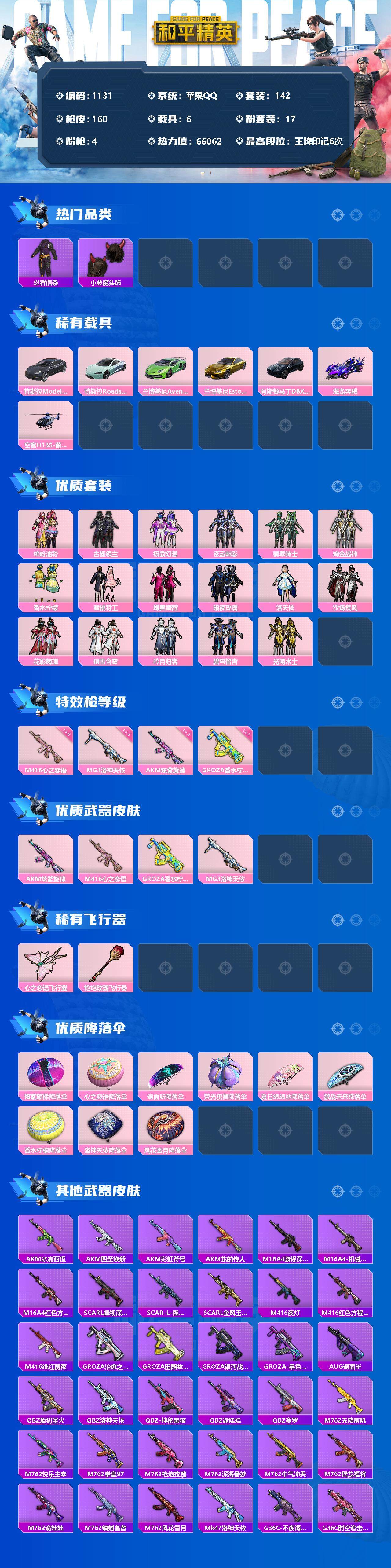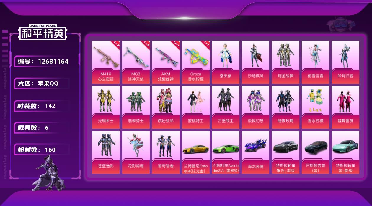 [12681164]苹果 手Q-17粉装-4特效枪-6载具-2粉色飞行器-66062热力值-6王牌印记-142套装-160枪皮 【热门品类】:粉装-缤纷油彩,套装-忍者信条,小恶魔头饰 【粉色载具】:特斯拉Model 3(冷光银),特斯拉Roadster(水滴蓝),兰博基尼Aventador SVJ(翡翠绿),兰博基尼Estoque(炫光金),阿斯顿马丁DBX(蓝),海龙奔腾,空客H135-蔚蓝之翼 【粉色套装】:粉装-缤纷油彩,粉装-古堡领主,粉装-极致幻想,粉装-苍蓝魅影,粉装-翡翠骑士,粉装-绚金战神,粉装-香水柠檬,粉装-蜜桃特工,粉装-蝶舞蔷薇,粉装-暗夜玫瑰,角色-洛天依,粉装-沙场疾风,粉装-花影阑珊,粉装-俏雪含霜,粉装-吟月归客,粉装-碧穹智者,粉装-光明术士 【粉色枪皮等级】:AKM-炫紫旋律(三级),M416-心之恋语(六级),GROZA-香水柠檬(一级),MG3-洛神天依(四级) 【粉色枪皮】:AKM-炫紫旋律,M416-心之恋语,GROZA-香水柠檬,MG3-洛神天依 【粉色飞行器】:心之恋语飞行翼,枪炮玫瑰飞行器 【粉色降落伞】:炫紫旋律降落伞,心之恋语降落伞,诡面斩降落伞,荧光虫舞降落伞,夏日绵绵冰降落伞,激战未来降落伞,香水柠檬降落伞,洛神天依降落伞,风花雪月降落伞 【稀有枪皮】:AKM-冰凉西瓜,AKM-四圣焕新,AKM-彩虹符号,AKM-龙的传人,M16A4-凝视深渊,M16A4-机械英豪,M16A4-红色方程式,SCAR-L-凝视深渊,SCAR-L-怪兽之王,SCAR-L-金风玉露,M416-夜灯,M416-红色方程式,M416-绯红前夜,GROZA-治愈之星,GROZA-田园牧歌,GROZA-银河战甲,GROZA-黑色刀锋,AUG-诡面斩,QBZ-原初圣火,QBZ-洛神天依,QBZ-神秘黑猫,QBZ-诡娃娃,QBZ-赛罗,M762-天降萌叽,M762-快乐主宰,M762-拳皇97,M762-枪炮玫瑰,M762-深海曼妙,M762-牛气冲天,M762-瑞龙福将,M762-诡娃娃,M762-镭射皇者,M762-风花雪月,Mk47-洛神天依,G36C-不夜海上花,G36C-时空追击者,G36C-暗夜玫瑰,G36C-金风玉露,蜜獾-天降萌叽,UZI-众神之王,UMP45-快乐主宰,UMP45-时空追击者,UMP45-生命誓言,UMP45-荒野猎神,UM
