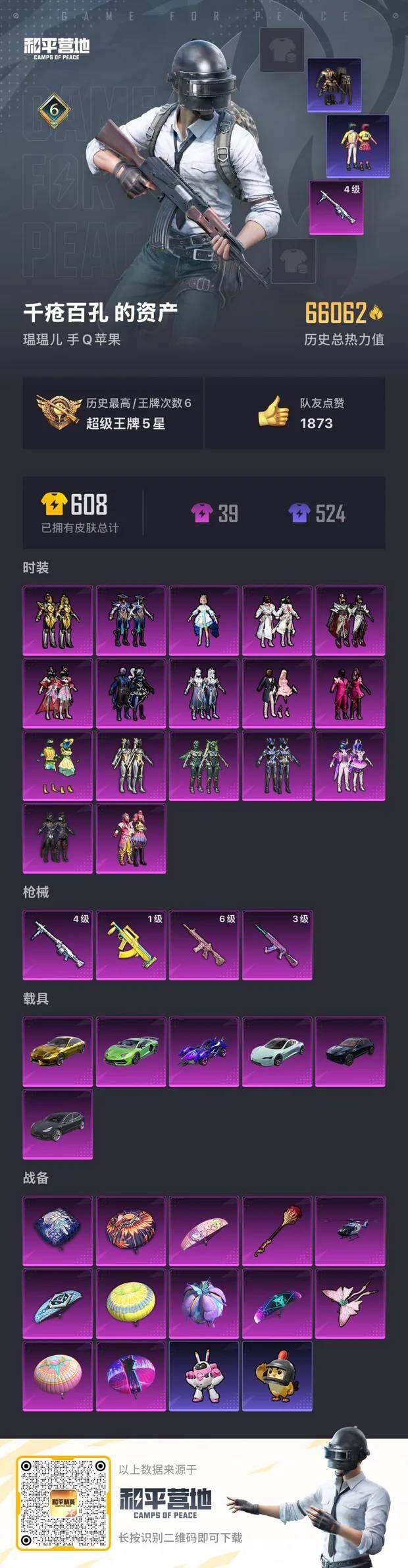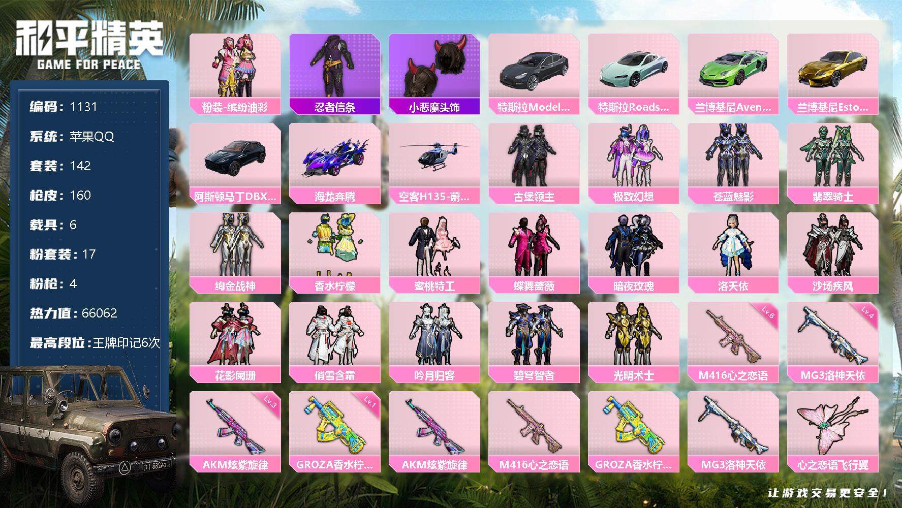 [12681164]苹果 手Q-17粉装-4特效枪-6载具-2粉色飞行器-66062热力值-6王牌印记-142套装-160枪皮