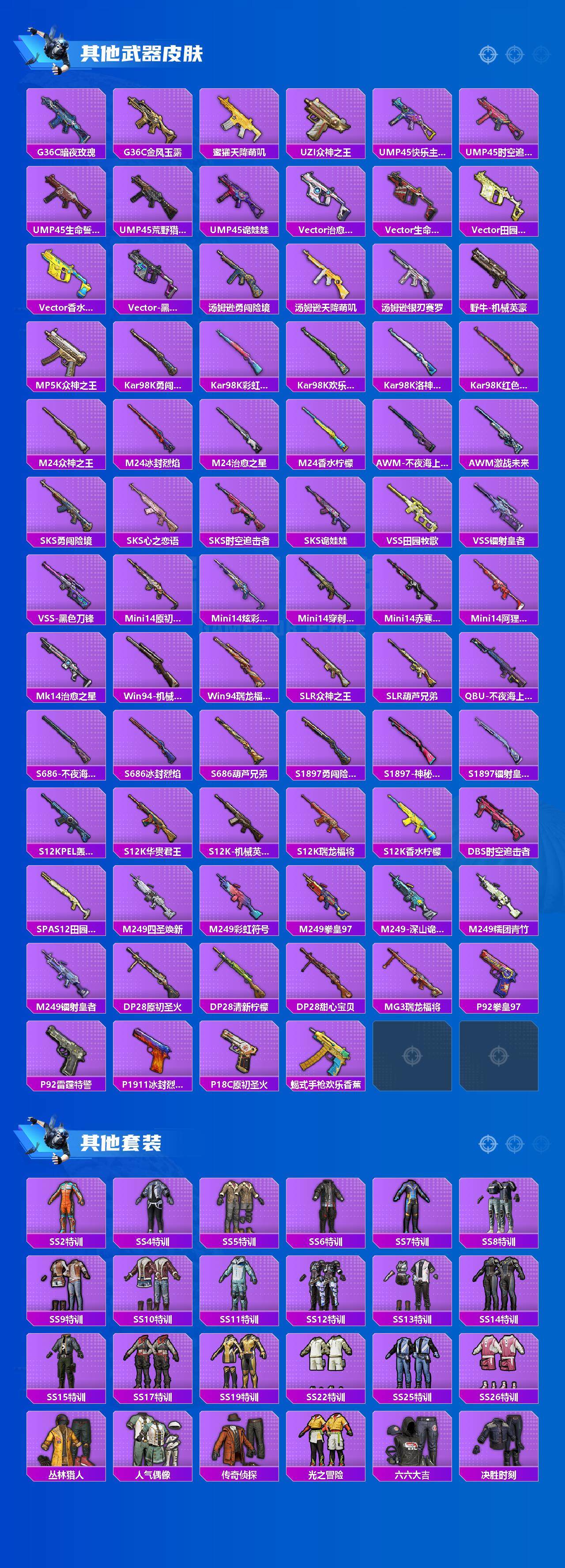 - [12287110]9粉装 4特效枪 18印记 可二次 可修改实名 身法装备:舞王派对(派对舞王、小金鞋),Mark.06(新蓝螳螂),萌熊伴侣背包(粉熊背包) 优质装备:甜心巧克力,舞王派对(派对舞王、小金鞋),萌熊伴侣背包(粉熊背包),AKM甜心宝贝,M416心之恋语,深海曼妙,宝贝奶油派,天使彩虹糖,七级M416-心之恋语,七级AKM-甜心宝贝,星穹咏叹调,Kar98K-巳巳如意 热门装扮:炙焰牛王,呆萌星弥,美雪,守护天翼,恶魔喵喵,大橘为重,迅捷狂鲨,派对舞王(小金鞋) 稀有枪皮:DP-28-豹影疾电 五级特效枪:五级DP-28-豹影疾电 四级特效枪:四级Kar98K-巳巳如意 紫色装扮:田园牧歌,轻风白浪,SS22特训,SS23特训,幻彩翩翩,妙红点点,照水倚天,娇憨猪猪,萌趣咩咩,SS21特训,SS31特训套装,SS5特训,冰川特警,冰焰天使,凛冬战士,北国孤狼,旭日情侣,SS30特训套装,云朵鹅,雪绒豹,SS33特训套装,青涩时光,SS20特训,潮流游乐家,SS15特训,暗夜傀儡,蝎王蛇后,迪迦奥特曼,时空追击者,暴风机械师,SS16特训,银白舞王,SS13特训,猎梦纪元,飞驰魅影,音速流光,SS19特训,军刀雅典娜,甜心亚梦,虚音幻奏,瑞龙福将,团圆交子,醒狮腾龙,SS17特训,炫光向阳,异彩先驱,SS18特训,都市魅力,野性山猫,野性战魂,长空猛禽,雪山征服者,雪山精英,霓虹极客,霓虹街区,青年教官,青春校园,迎春赐吉,缤纷果语,耀眼新星,荣耀,蓝色守护者,蓝色运动,街头潮人,跃动心情,龙腾端午,魅力单车,黄色伏地魔,黄色运动,黑色伏地魔,龙的传人,龟仙人,冰河战士,龙魂突击队,蝶变,香桃花海,缤纷假日,沙漠毒蛇,极速红龙,柠萌假日,格斗先锋,沙漠兵团,海岛探路者,圣诞大吉,坚韧舞者,夏日倾情,夏日音浪,夜莺强袭者,幻世战舞者,战地菁英,探宝勇士,湖蓝色名流,绮丽涂鸦,疯狂小兔子,白色伏地魔,破蛋小黄鸡,神秘领域,甜蜜告白,福星高照,空岛之星,突袭者,竞技勇士朋克,竞技达人朋克,红色运动,甜蜜熊情侣,王牌教练,牛气冲天,灰色格斗者,灼焰舞者,炫蓝之夏,熔岩使者,燃烧卡路里,牛气满满,狂沙舞者,猎鹰,镭射皇者,小熊娃娃,雏菊兔兔,萝兰蝴蝶,SS29特训,拉斐尔,星途旅人,纯真浪花,热情海星,曼妙人鱼,SS28特训,甜酷狙击,Mark.06(新蓝螳螂),鱼渊荷华,玉兔