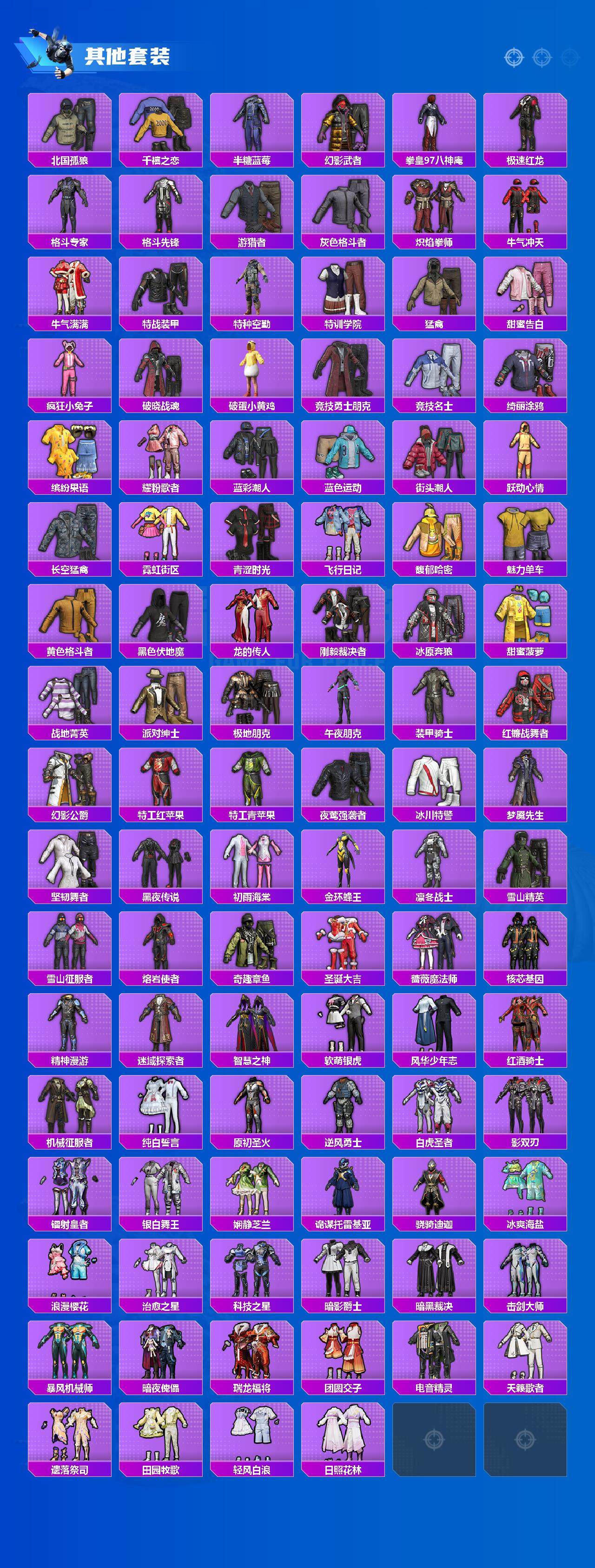 忍者信条套装,套装-极速红龙,套装-破蛋小黄鸡,套装-雪山精英,风华少年志套装,套装-纯白誓言,套装-白虎圣者,套装-影双刃,套装-娴静芝兰,套装-冰爽海盐,套装-瑞龙福将,套装-团圆交子