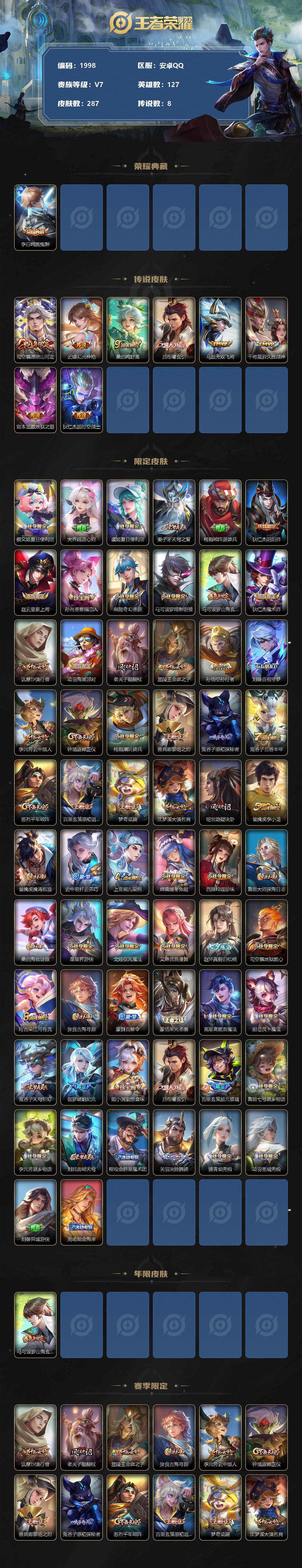 [12681171]安卓Q-V7-最强王者段位-127英雄-287皮肤-1典藏-0珍品无双-0无双-0珍品传说-8传说-71史诗