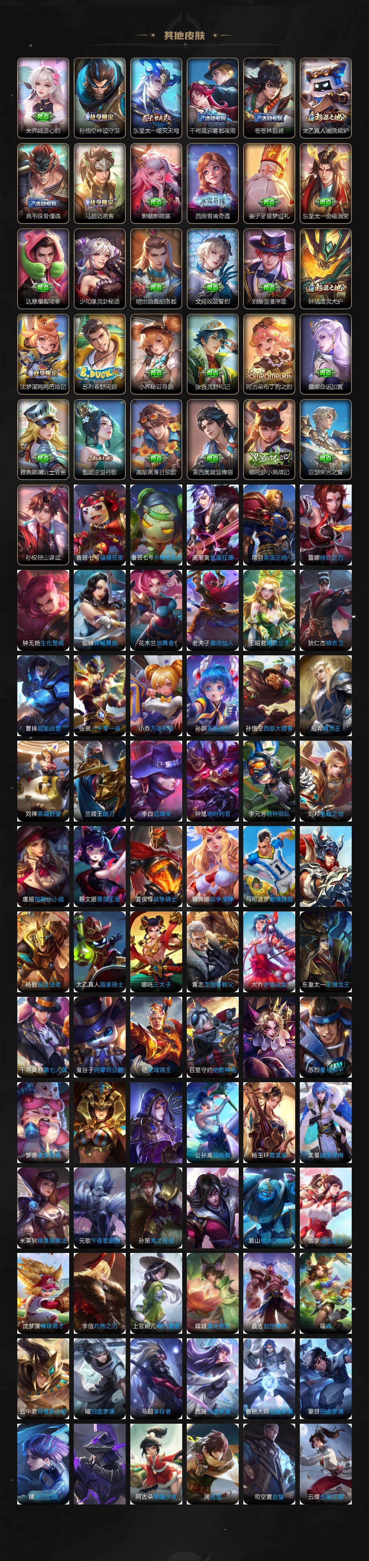 【限定皮肤】:蔡文姬夏日便利店,大乔绒语心约,虞姬夏日便利店,姜子牙天穹之誓,杨戬破阵退雄兵,狄仁杰阴阳师,赵云皇家上将,孙尚香蔷薇恋人,扁鹊奇幻香踪,马可波罗暗影游猎,马可波罗山海玄木吟,狄仁杰魔术师,达摩沙漠行僧,项羽海滩派对,老夫子醍醐杖,兰陵王金庭之子,孙悟空孙行者,刘备百相守梦,李元芳云中旅人,钟馗驱傩正仪,杨戬潮玩骑兵,雅典娜黎明之约,鬼谷子原初探秘者,鬼谷子五谷丰年,苏烈千军破阵,百里玄策原初追逐者,梦奇顽趣,沈梦溪大漠名商,明世隐疑决卦,裴擒虎李小龙,裴擒虎擒涛扼浪,云中君纤云弄巧,上官婉儿梁祝,嫦娥暖冬兔眠,西施玲珑珍味,鲁班大师探海日志,桑启海盐诗旅,暃星界游侠,戈娅驭风魔法,艾琳流音漫舞,赵怀真鹤归松栖,司空震地狱燃心,阿古朵江河有灵,张良古海寻踪,蒙犽百解令,蒙恬荣光圣徽,高渐离燃音魔法,妲己灵卜魔法,鬼谷子天穹祈灯,伽罗琥珀纪元,姬小满妄想食味,吕布曦玄引,百里玄策超元猎域,鲁班七号蔬乡物语,李元芳蔬乡物语,刘邦剑破天穹,程咬金群星魔术团,关羽决胜骁骑,镜青焰无极,项羽苍威无极,刘备异域游侠,周瑜熔金海岸