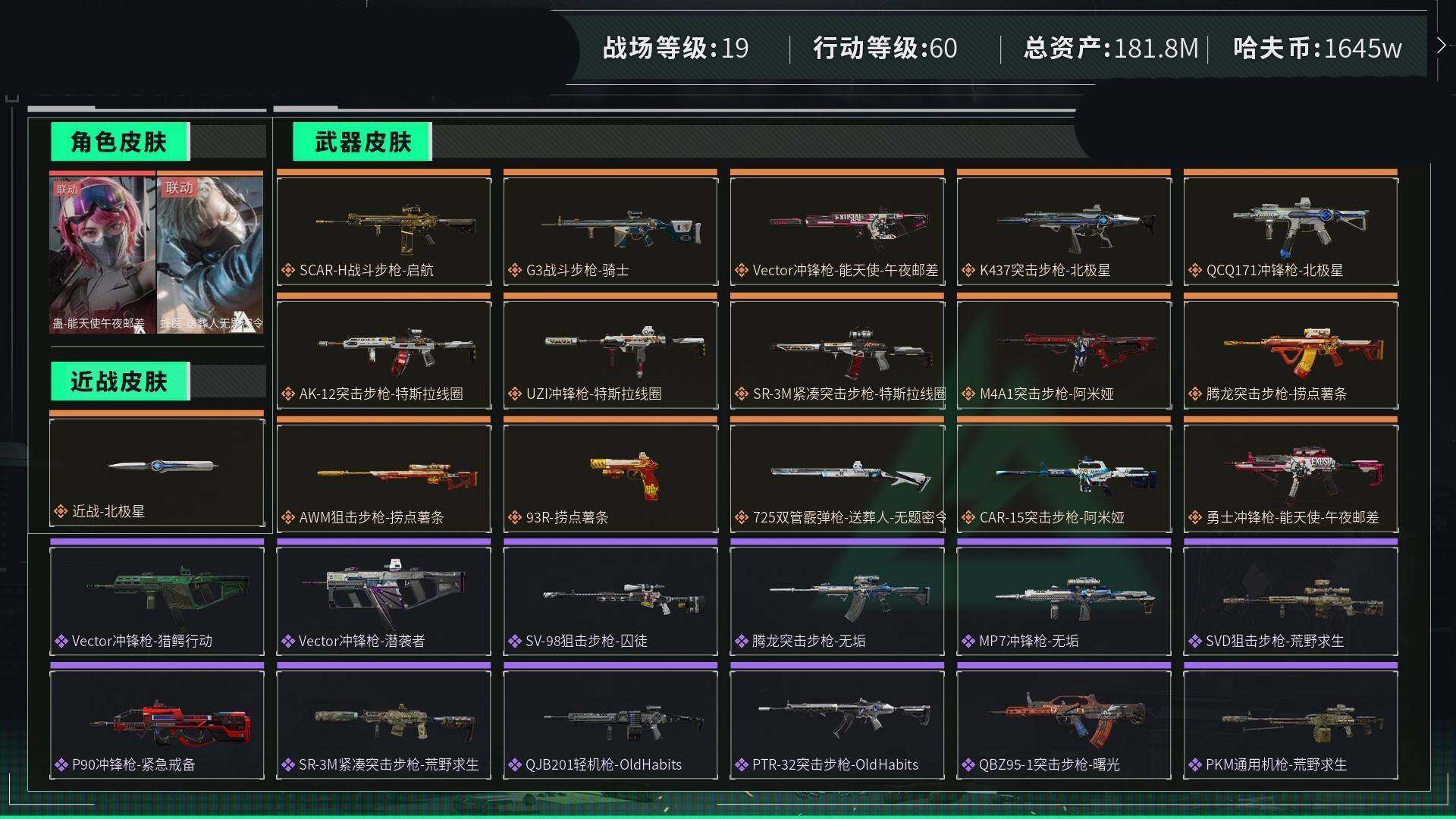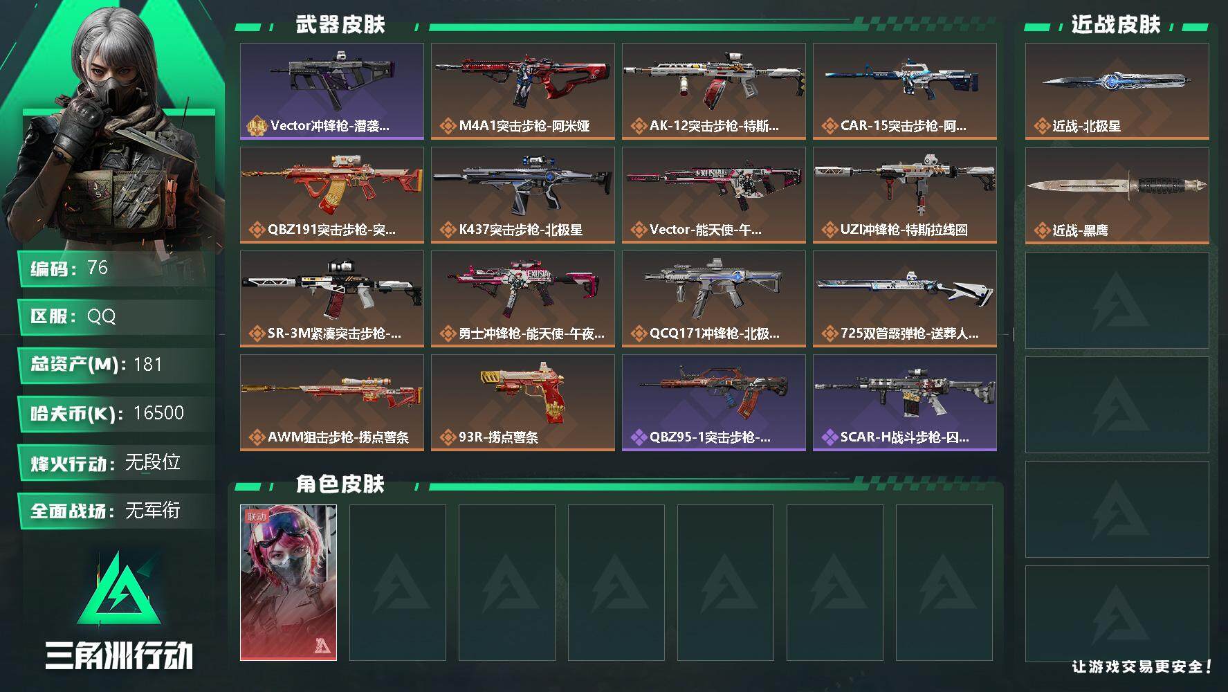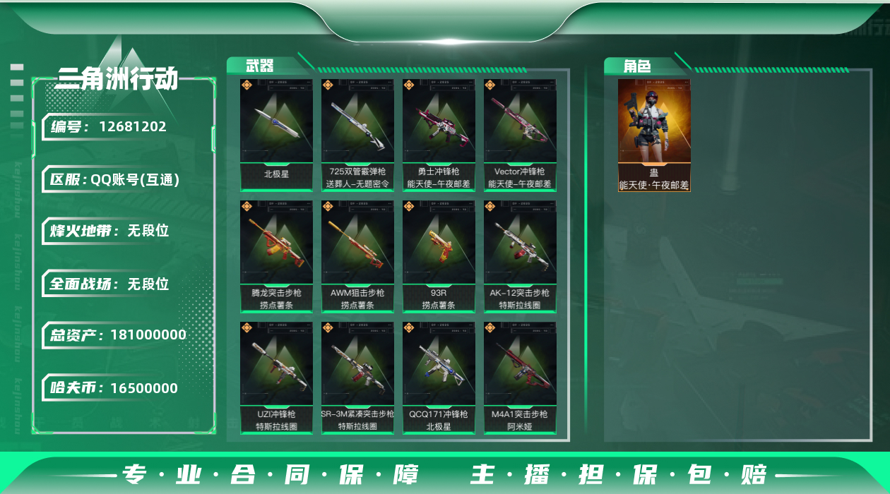 [12681202]汤20252 总资产181M,哈夫币1645w,近战-北极星,蛊-能天使午夜邮差/蜂医-送葬人无题密令,枪皮数量108,战场等级:19 军士长,行动等级:60 钻石,安全箱等时效性道具请以游戏内数据为准;详情请看图【个人信息】战场等级:19 军士长,行动等级:60 钻石【哈夫币】1645w【总资产】181M【货币】0三角币/0曼德尔币/32三角券【安全箱】基础安全箱2(1x2)/进阶安全箱4(2x2)/S6顶级安全箱9(3x3)【通行证】通行证免费版【特勤处】制药台Lv.3/工作台Lv.3/仓库Lv.6/防具台Lv.3/训练中心Lv.6/靶场Lv.4/技术中心Lv.3/指挥中心Lv.4/潜水中心Lv.0/收藏室Lv.0【仓库】非洲之心/【角色皮肤】蛊-能天使午夜邮差/蜂医-送葬人无题密令/【已拥有捆绑包】北极星捆绑包/捞点薯条捆绑包/特斯拉线圈捆绑包/【近战皮肤】近战-黑鹰/近战-北极星/【步枪皮肤】QBZ95-1突击步枪-曙光/K437突击步枪-北极星/AS Val突击步枪-典狱官/腾龙突击步枪-无垢/SCAR-H战斗步枪-囚徒/SR-3M紧凑突击步枪-荒野求生/CAR-15突击步枪-阿米娅/M4A1突击步枪-阿米娅/腾龙突击步枪-捞点薯条/AK-12突击步枪-特斯拉线圈/SR-3M紧凑突击步枪-特斯拉线圈/PTR-32突击步枪-OldHabits/G3战斗步枪-骑士/SCAR-H战斗步枪-启航/SR-3M紧凑突击步枪-战术竞备/【冲锋枪皮肤】UZI冲锋枪-特斯拉线圈/Vector冲锋枪-潜袭者/QCQ171冲锋枪-北极星/MP7冲锋枪-无垢/勇士冲锋枪-能天使-午夜邮差/Vector冲锋枪-能天使-午夜邮差/P90冲锋枪-紧急戒备/Vector冲锋枪-猎鳄行动/勇士冲锋枪-工业狂潮/【霰弹枪皮肤】725双管霰弹枪-送葬人-无题密令/【轻机枪皮肤】PKM通用机枪-荒野求生/M250通用机枪-囚徒/QJB201轻机枪-OldHabits/【精准射手步枪皮肤】PSG-1射手步枪-无垢/【狙击步枪皮肤】SV-98狙击步枪-囚徒/SV-98狙击步枪-林中猎手/SVD狙击步枪-荒野求生/AWM狙击步枪-捞点薯条/【手枪皮肤】93R-捞点薯条/【挂饰】诡影狙击兵/诡影喷火兵/挂饰-维什戴尔/挂饰-启程/挂饰-水墨云图/阿萨拉盾兵/挂饰-北极星/挂饰-晶石幻想/挂饰-阿米娅/