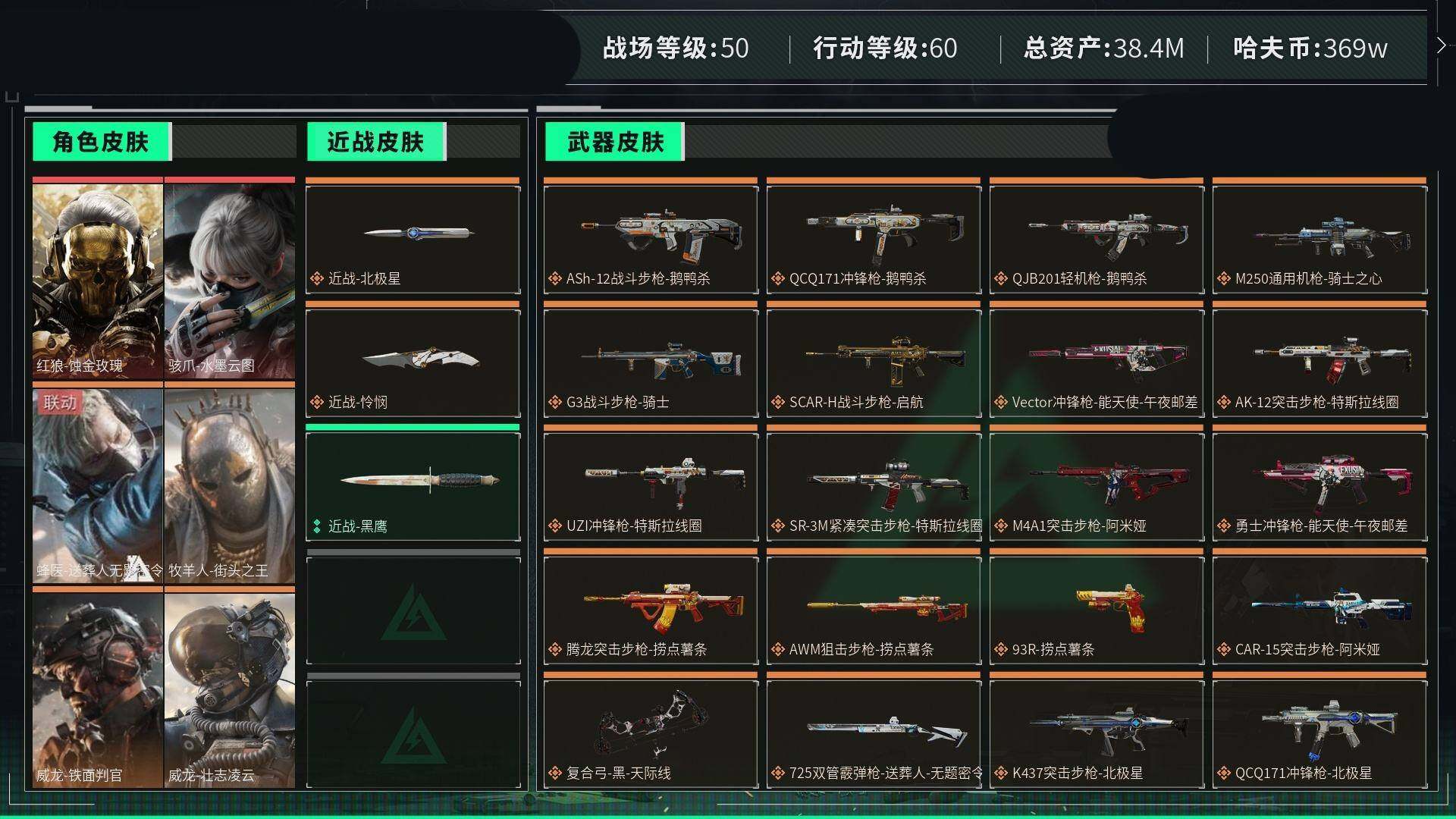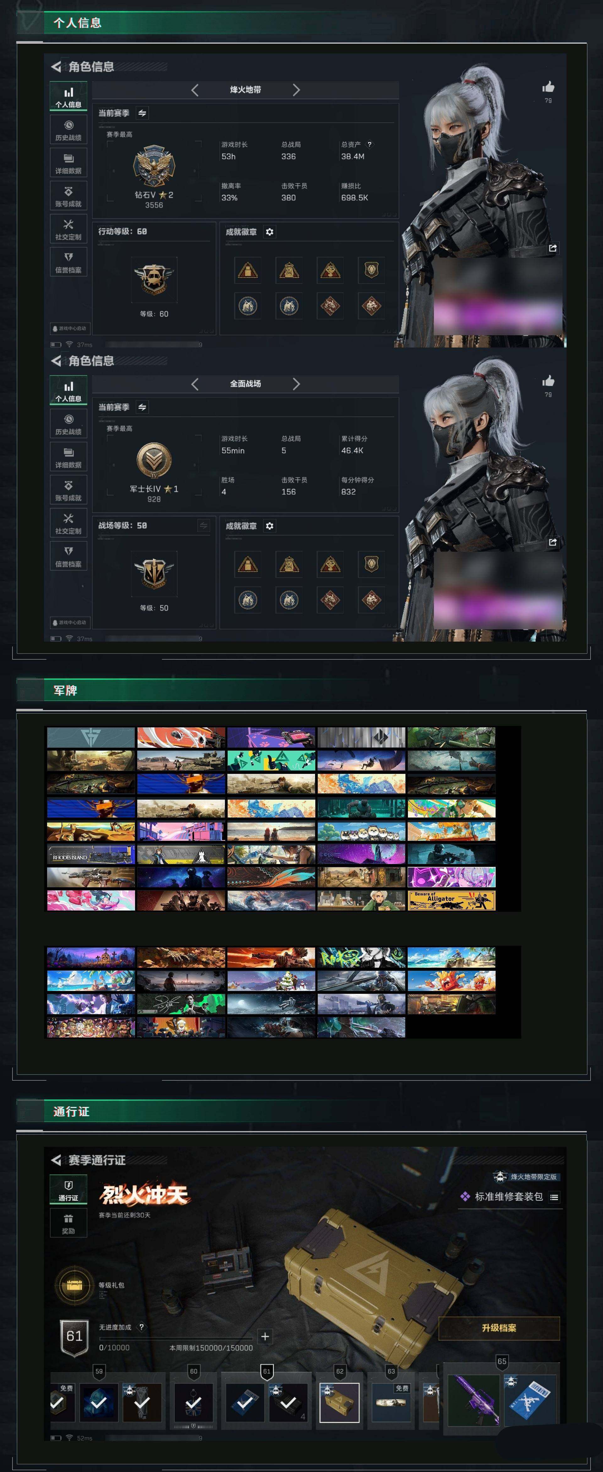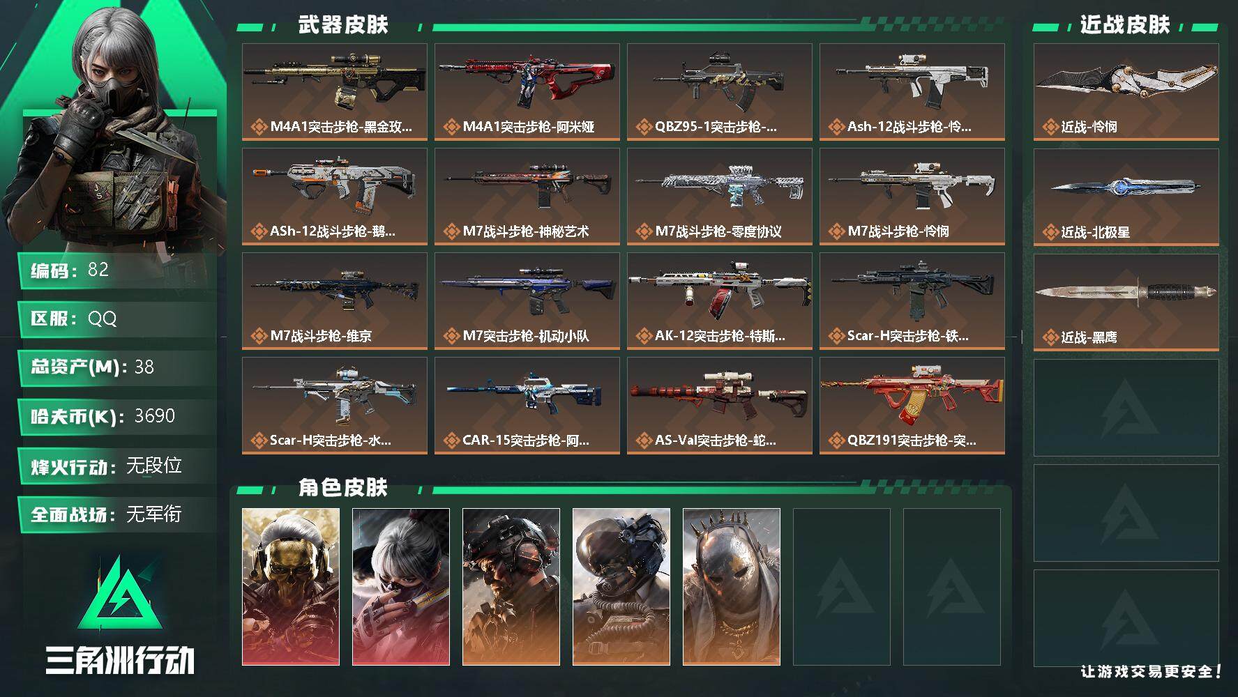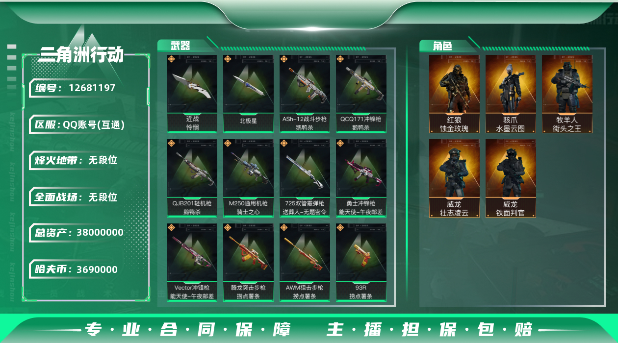 [12681197]汤32992 总资产38M,哈夫币369w,近战-北极星/近战-怜悯,红狼-蚀金玫瑰/骇爪-水墨云图/蜂医-送葬人无题密令/牧羊人-街头之王/威龙-铁面判官/威龙-壮志凌云,枪皮数量283,战场等级:50 军士长,行动等级:60 钻石,安全箱等时效性道具请以游戏内数据为准;详情请看图【个人信息】战场等级:50 军士长,行动等级:60 钻石【哈夫币】369w【总资产】38M【货币】46三角币/0曼德尔币/0三角券【安全箱】基础安全箱2(1x2)/S6高级安全箱6(2x3)【通行证】烽火地带限定版【特勤处】制药台Lv.3/工作台Lv.3/仓库Lv.5/防具台Lv.3/训练中心Lv.7/靶场Lv.3/技术中心Lv.3/指挥中心Lv.2/潜水中心Lv.1/收藏室Lv.0【角色皮肤】骇爪-水墨云图/红狼-蚀金玫瑰/威龙-壮志凌云/威龙-铁面判官/牧羊人-街头之王/蜂医-送葬人无题密令/【已拥有捆绑包】怜悯捆绑包/甜心子弹捆绑包/阿萨拉工艺捆绑包/北极星捆绑包/捞点薯条捆绑包/特斯拉线圈捆绑包/【近战皮肤】近战-怜悯/近战-黑鹰/近战-北极星/【步枪皮肤】M4A1突击步枪-蚀金玫瑰/QBZ95-1突击步枪-破军/ASh-12战斗步枪-怜悯/M7战斗步枪-神秘艺术/M7战斗步枪-怜悯/M7战斗步枪-维京/SCAR-H战斗步枪-国风/G3战斗步枪-阿萨拉工艺/QBZ95-1突击步枪-曙光/K416突击步枪-竞技风/AUG突击步枪-战术迷彩/SCAR-H战斗步枪-瑰丽风尚/SCAR-H战斗步枪-危险实验/AS Val突击步枪-刀锋/M7战斗步枪-零度协议/SCAR-H战斗步枪-铁艺苍穹/SCAR-H战斗步枪-水墨云图/AS Val突击步枪-蛇年祥瑞/SR-3M紧凑突击步枪-英雄/AUG突击步枪-甜心子弹/QBZ95-1突击步枪-ACE/AUG突击步枪-蝮蛇/G3战斗步枪-战场英杰/AUG突击步枪-特勤执行/M4A1突击步枪-特勤执行/M7战斗步枪-机动小队/M14射手步枪-禁卫/PTR-32突击步枪-ACE/SG552突击步枪-深海恐惧/AKM突击步枪-林中猎手/K437突击步枪-北极星/AS Val突击步枪-典狱官/腾龙突击步枪-无垢/SCAR-H战斗步枪-囚徒/M16A4突击步枪-竞赛选手/SR-3M紧凑突击步枪-荒野求生/CAR-15突击步枪-阿米娅/M4A1突击步枪-阿米娅
