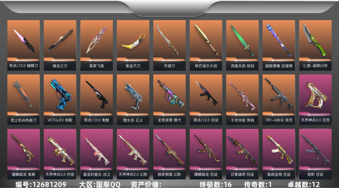 [12681209]【套装】:奇点//2.0套装,耀鳞威龙套装,天界神兵//2.0套装 【英雄】:炼狱,维斯,暮蝶,钛狐,壹决,铁臂,捷风,雷兹,幽影,不死鸟,贤者,猎枭,蝰蛇,零,芮娜,奇乐,尚勃勒,霓虹,斯凯,夜露,星礈,K/O,海神,盖可,黑梦,钢锁 【近战 武器】:近战武器-紫金爪刀,近战武器-奇点//2.0 蝴蝶刀,近战武器-落英飞旋,近战武器-威龙之刃,近战武器-埃芒迪尔大剑,近战武器-流星兵团 短剑,近战武器-超能偶像 应援棒,近战武器-超限闪存 匕首,近战武器-荒土机兵 热能刀,近战武器-天御刀 【狂徒】:狂徒-奇点//2.0,狂徒-掠影,狂徒-日冕雄师,狂徒-耀鳞威龙,狂徒-紫阙金琅,狂徒-超能偶像,狂徒-荒土机兵,狂徒-流星兵团 【幻影】:幻影-般若假面,幻影-天界神兵//2.0,幻影-超限闪存,幻影-聚合之力,幻影-纳米打击 【戍卫】:戍卫-盖亚的复仇,戍卫-超能偶像,戍卫-浮光跃金,戍卫-逆冲蛮牛,戍卫-战术熊与伙伴们 【獠犬】:獠犬-全息波普,獠犬-采蜜小蜂队,獠犬-模拟赫兹,獠犬-逆冲蛮牛 【冥驹】:冥驹-千灵华绽,冥驹-荒土机兵,冥驹-模拟赫兹 【飞将】:飞将-天界神兵,飞将-聚合之力,飞将-战术熊与伙伴们 【莽侠】:莽侠-超限闪存,莽侠-纤云弄巧 【战神】:战神-极简主义,战神-采蜜小蜂队,战神-浮光跃金 【奥丁】:奥丁-天界神兵//2.0,奥丁-流星兵团,奥丁-纳米打击 【判官】:判官-天界神兵//2.0,判官-超能偶像,判官-采蜜小蜂队,判官-纳米打击x 【雄鹿】:雄鹿-复古浪潮,雄鹿-模拟赫兹,雄鹿-逆冲蛮牛 【骇灵】:骇灵-781-A协议,骇灵-荒土机兵,骇灵-流星兵团,骇灵-珍珠棘贝,骇灵-浮光跃金 【蜂刺】:蜂刺-超限闪存,蜂刺-聚合之力,蜂刺-深海水族,蜂刺-纤云弄巧 【标配】:标配-超能偶像,标配-荒土机兵,标配-浮光跃金,标配-战术熊与伙伴们 【VCT手枪】:标配-VCT x LEV 【正义】:正义-塑水宗,正义-超限闪存,正义-纳米打击,正义-纤云弄巧 【鬼魅】:鬼魅-奇点//2.0,鬼魅-耀鳞威龙,鬼魅-流星兵团,鬼魅-采蜜小蜂队,鬼魅-模拟赫兹,鬼魅-星云暗涌 【狂怒】:狂怒-天界神兵//2.0,狂怒-珍珠棘贝,狂怒-聚合之力,狂怒-逆冲蛮牛,狂怒-战术熊与伙伴们 【短炮】:短炮-深海水族,短炮-纤云弄巧 【卡面】:终章:激斗汉