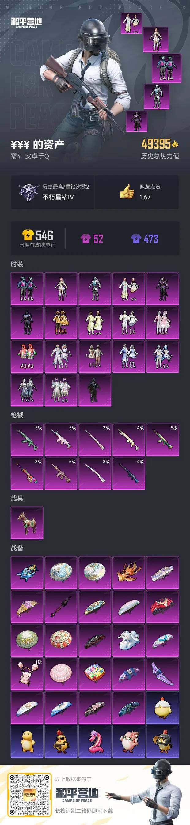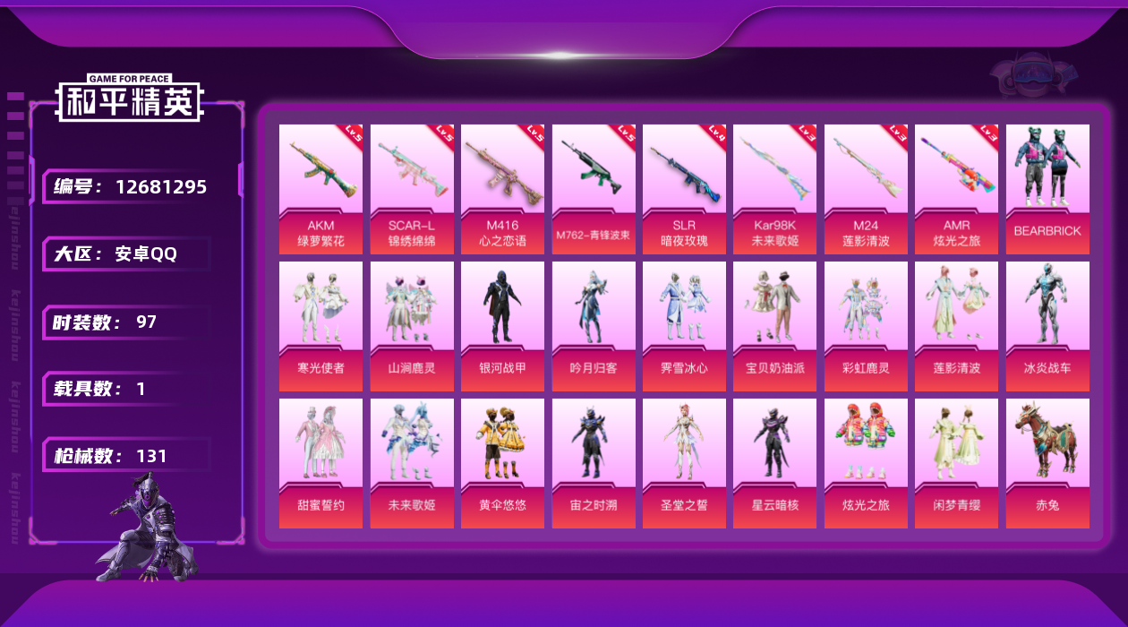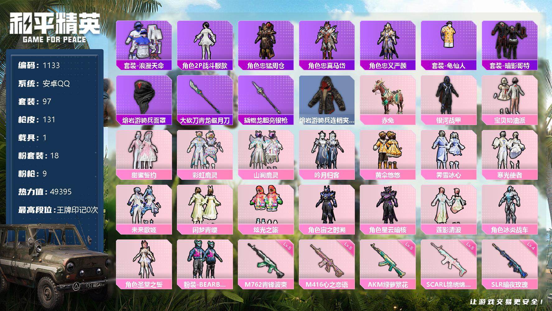 [12681295]安卓 手Q-18粉装-9特效枪-1载具-6粉色飞行器-49395热力值-2王牌印记-97套装-131枪皮