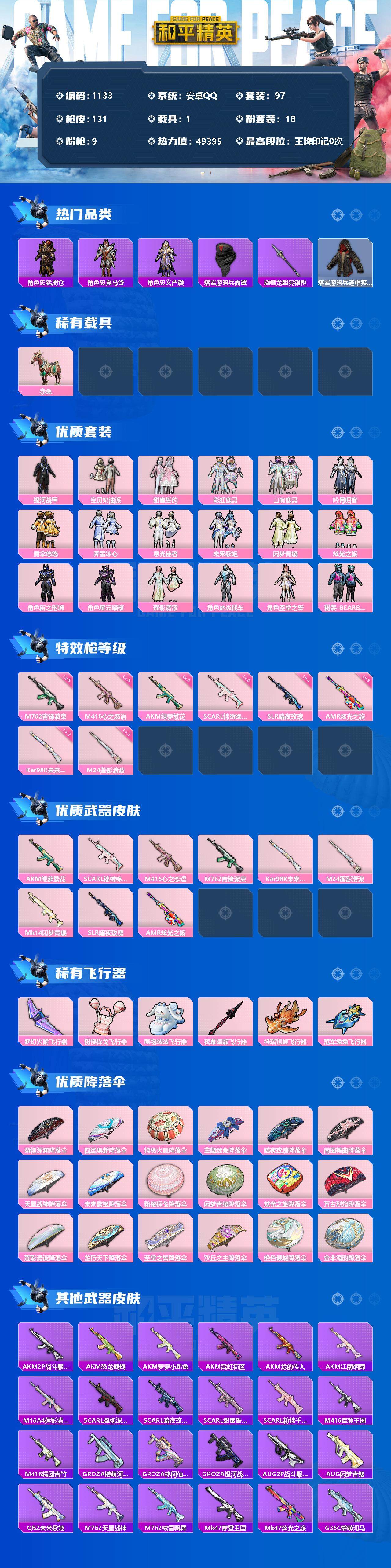 [12681295]安卓 手Q-18粉装-9特效枪-1载具-6粉色飞行器-49395热力值-2王牌印记-97套装-131枪皮 【热门品类】:套装-浪漫天命,角色-2P战斗服款,角色-忠猛周仓,角色-忠真马岱,角色-忠义严颜,套装-龟仙人,套装-暗影哥特,熔岩游骑兵面罩,大砍刀-青龙偃月刀,撬棍-龙胆亮银枪,熔岩游骑兵连帽夹克 【粉色载具】:赤兔 【粉色套装】:粉装-银河战甲,粉装-宝贝奶油派,粉装-甜蜜誓约,粉装-彩虹鹿灵,粉装-山涧鹿灵,粉装-吟月归客,粉装-黄伞悠悠,粉装-霁雪冰心,粉装-寒光使者,粉装-未来歌姬,粉装-闲梦青缨,粉装-炫光之旅,角色-宙之时溯,角色-星云暗核,粉装-莲影清波,角色-冰炎战车,角色-圣堂之誓,粉装-BEARBRICK 【粉色枪皮等级】:AKM-绿萝繁花(五级),SCAR-L-锦绣绵绵(五级),M416-心之恋语(五级),M762-青锋波束(五级),Kar98K-未来歌姬(三级),M24-莲影清波(三级),SLR-暗夜玫瑰(四级),AMR-炫光之旅(三级) 【粉色枪皮】:AKM-绿萝繁花,SCAR-L-锦绣绵绵,M416-心之恋语,M762-青锋波束,Kar98K-未来歌姬,M24-莲影清波,Mk14-闲梦青缨,SLR-暗夜玫瑰,AMR-炫光之旅 【粉色飞行器】:梦幻火箭飞行器,粉樱探戈飞行器,萌物绒绒飞行器,夜幕颂歌飞行器,祥瑞锦鲤飞行器,冠军兔兔飞行器 【粉色降落伞】:凝视深渊降落伞,四圣焕新降落伞,锦绣火鲤降落伞,童趣迷兔降落伞,暗夜玫瑰降落伞,南国舞曲降落伞,天星战神降落伞,未来歌姬降落伞,粉樱探戈降落伞,闲梦青缨降落伞,炫光之旅降落伞,万古烈焰降落伞,莲影清波降落伞,龙行天下降落伞,圣堂之誓降落伞,沙丘之主降落伞,绝色倾城降落伞,金丰海韵降落伞 【稀有套装】:套装-龟仙人 【稀有枪皮】:AKM-2P战斗服款,AKM-恐龙拽拽,AKM-江南烟雨,AKM-萝萝小趴兔,AKM-霓虹街区,AKM-龙的传人,M16A4-莲影清波,SCAR-L-凝视深渊,SCAR-L-暗夜玫瑰,SCAR-L-甜蜜誓约,SCAR-L-粉锦千层,M416-摩登王国,M416-糯团青竹,GROZA-懵萌河马,GROZA-林间仙鹿,GROZA-银河战甲,AUG-2P战斗服款,AUG-闲梦青缨,QBZ-未来歌姬,M762-天星战神,M762-绒雪飘舞,Mk47-摩登王国,Mk4