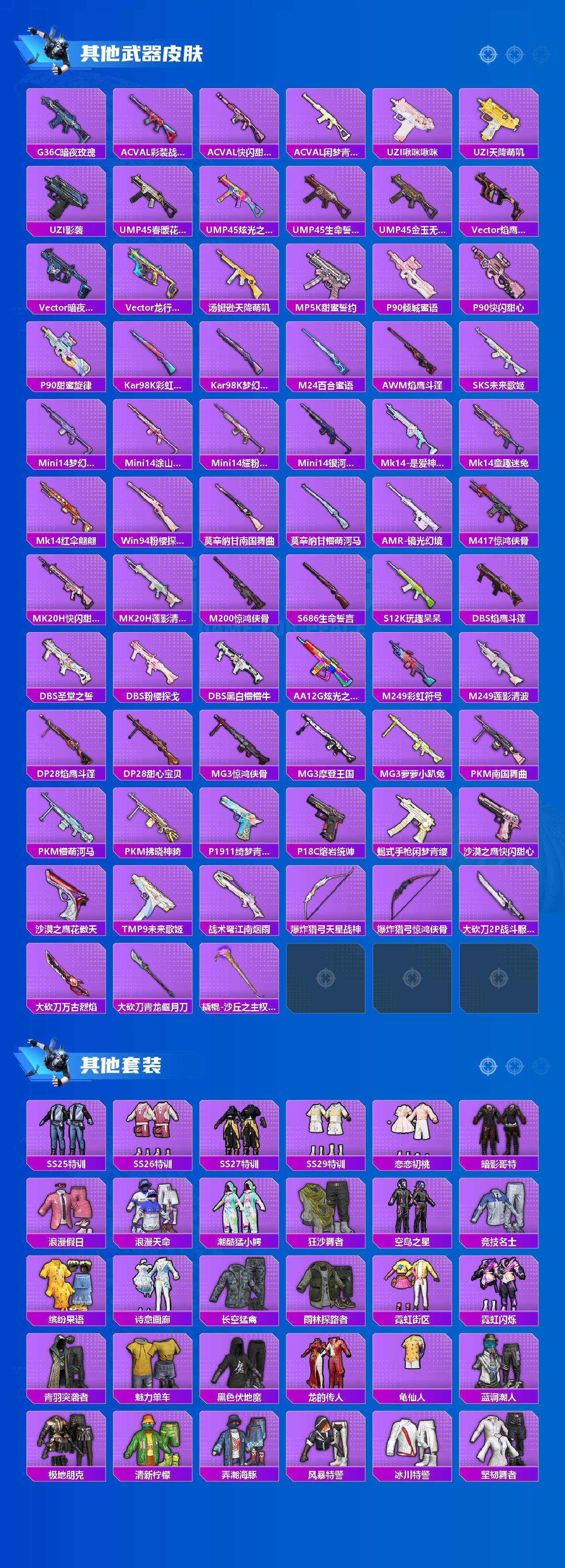 - [12289811]1红装 3粉装 7特效枪 1载具 9印记 可二次 可修改实名 优质装备:最终圣卫者-帕修斯,二级最终圣卫者-帕修斯,辉羽雀灵自行车,仙女座 瞬,AKS-74U-星穹咏叹调,MK14-甜梦熊击,MG3-辉羽雀灵,Vector-最终圣卫者,冷漠罗丽,Vector-绯穹魔姬,Kar98K-巳巳如意 热门装扮:金丰海韵 稀有枪皮:DP-28-豹影疾电 六级特效枪:六级AKS-74U-星穹咏叹调 五级特效枪:五级Kar98K-巳巳如意,五级DP-28-豹影疾电,五级MK14-甜梦熊击 四级特效枪:四级Vector-绯穹魔姬 三级特效枪:三级Vector-最终圣卫者,三级MG3-辉羽雀灵 紫色装扮:SS22特训,娇憨猪猪,萌趣咩咩,SS21特训,SS31特训套装,冷焰舞者,霓虹热舞,极速光影,SS30特训套装,云朵鹅,雪绒豹,SS33特训套装,顶瓜瓜,SS20特训,SS16特训,SS14特训,SS19特训,豚鼠丹丹,竞技角斗士,吉莉礼服,都市漫游者,长空猛禽,霓虹街区,缤纷果语,耀眼新星,蓝色守护者,街头潮人,飞行日记,麻辣教官,黄色运动,冰河战士,龙魂突击队,蝶变,香桃花海,柠萌假日,海岛探路者,夏日音浪,完美偶像,帅气教官,幻世战舞者,战地督导,探宝勇士,绮丽涂鸦,甜蜜菠萝,破蛋小黄鸡,甜蜜告白,空岛之星,竞技达人朋克,红色运动,灰色格斗者,炫蓝之夏,热血青春,牛气满满,雏菊兔兔,萝兰蝴蝶,SS29特训,达芬奇,星途旅人,SS28特训,异域银装,玉兔迎春,巳巳如意,森林游猎者,竞技名士,街头风暴,临安公主,SS25特训,SS27特训,SS26特训,智谋强哥,大橘大利,星渊小夜曲,春日漫步,SS32特训服(SS32特训套装),青玉碎影,萌黄之夏,白糯汤圆,恋语绒绒,金耀舞者,光之冒险 优质战备:星途旅人降落伞,时光之吻飞行器,幻彩电音降落伞,最终圣卫者降落伞,辉羽雀灵降落伞,雀灵庇佑飞行器,终晖之翼飞行器,宁雨蝶降落伞,月影灵韵降落伞,圣域龙灵降落伞,幻影战神降落伞