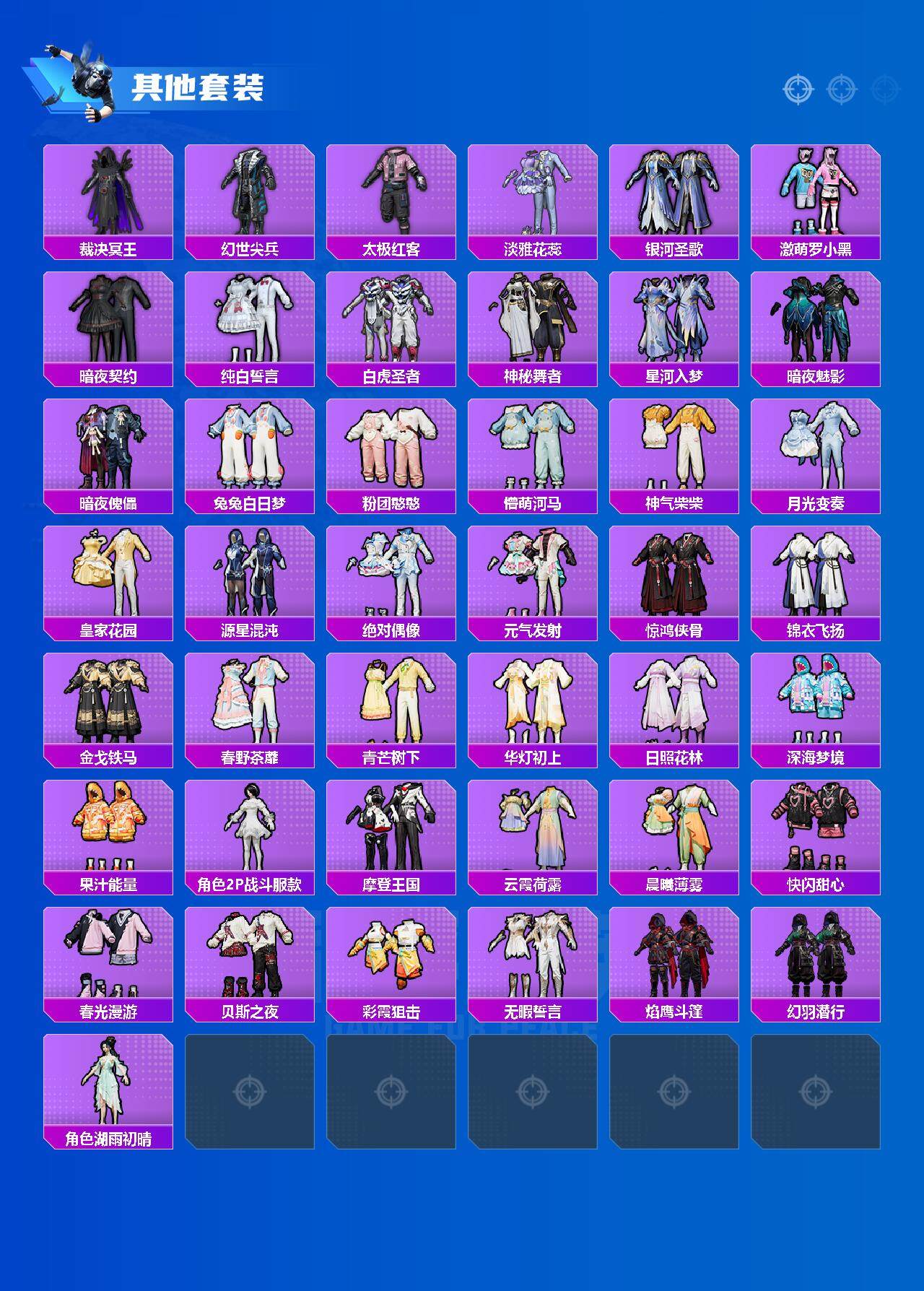 【粉色套装】:粉装-银河战甲,粉装-宝贝奶油派,粉装-甜蜜誓约,粉装-彩虹鹿灵,粉装-山涧鹿灵,粉装-吟月归客,粉装-黄伞悠悠,粉装-霁雪冰心,粉装-寒光使者,粉装-未来歌姬,粉装-闲梦青缨,粉装-炫光之旅,角色-宙之时溯,角色-星云暗核,粉装-莲影清波,角色-冰炎战车,角色-圣堂之誓,粉装-BEARBRICK