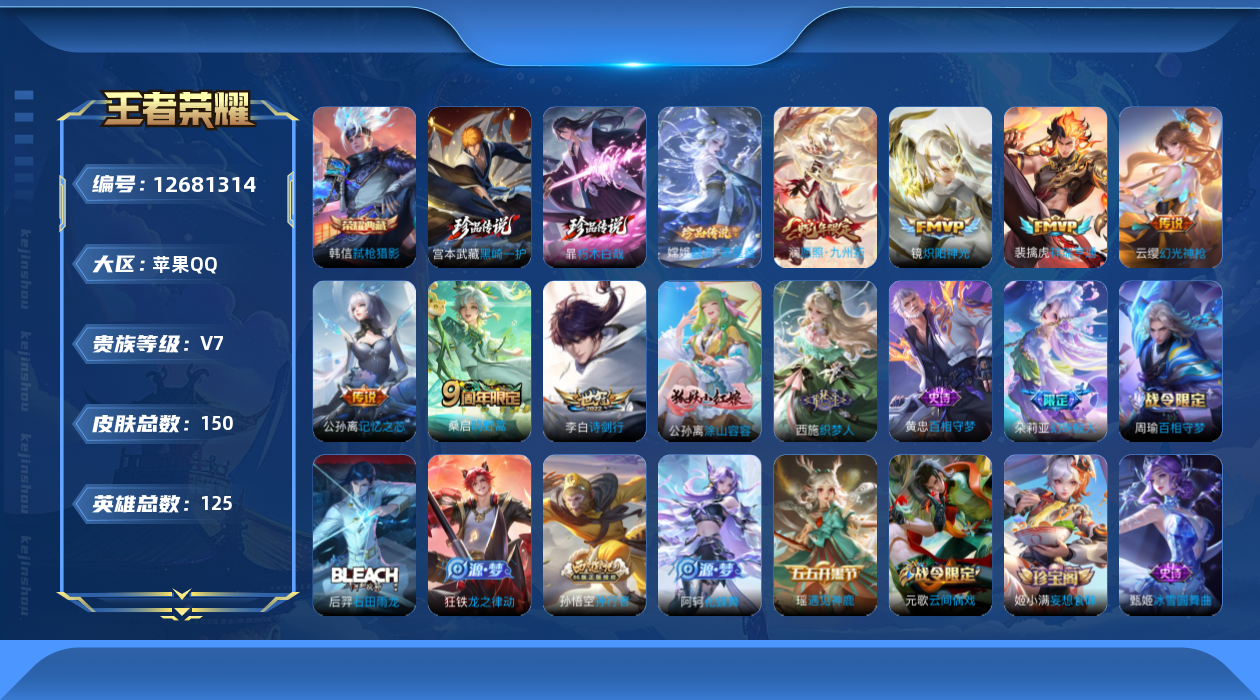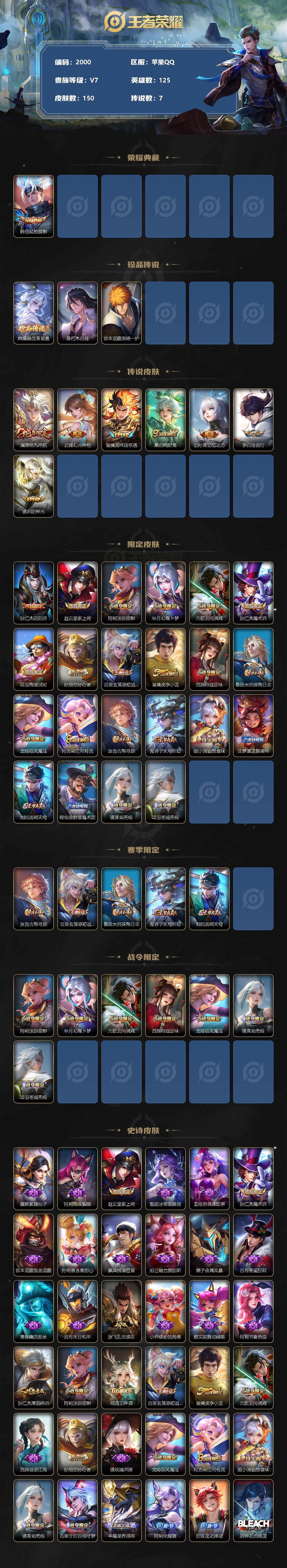 [12681314]苹果Q-V7-至尊星耀I段位-125英雄-150皮肤-1典藏-0珍品无双-0无双-3珍品传说-7传说-41史诗
