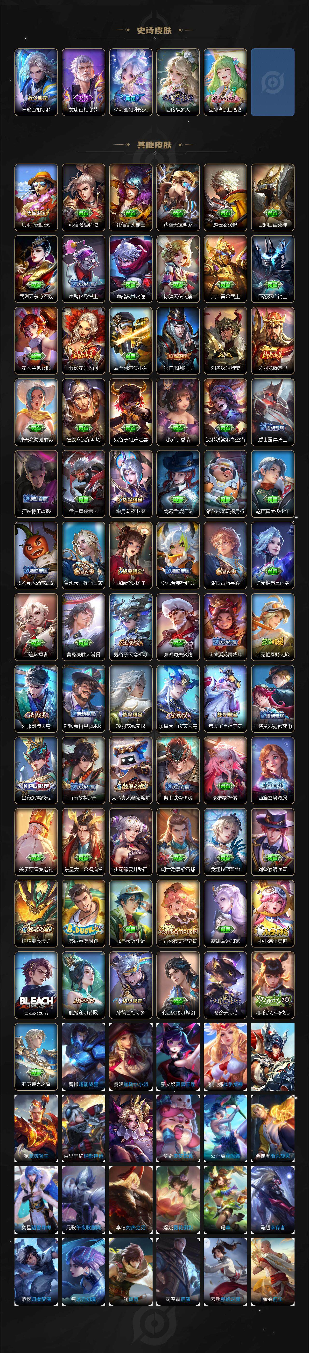 【史诗皮肤】:露娜紫霞仙子,阿轲暗夜猫娘,赵云皇家上将,甄姬冰雪圆舞曲,王昭君偶像歌手,狄仁杰魔术师,宫本武藏鬼剑武藏,孙尚香水果甜心,嬴政摇滚巨星,妲己魅力维加斯,墨子金属风暴,吕布圣诞狂欢,曹操幽灵船长,吕布末日机甲,张飞乱世虎臣,小乔缤纷独角兽,蔡文姬舞动绿茵,阿轲节奏热浪,狄仁杰鹰眼统帅,阿轲迷踪丽影,瑶遇见神鹿,百里玄策原初追逐者,裴擒虎李小龙,元歌云间偶戏,西施诗语江南,孙悟空孙行者,镜玫瑰异探,戈娅驭风魔法,阿古朵江河有灵,姬小满妄想食味,镜青焰无极,百里守约百相守梦,牛魔星界战将,阿轲化蝶舞,狂铁龙之律动,后羿石田雨龙,周瑜百相守梦,黄忠百相守梦,朵莉亚幻珠鲛人,西施织梦人,公孙离涂山容容