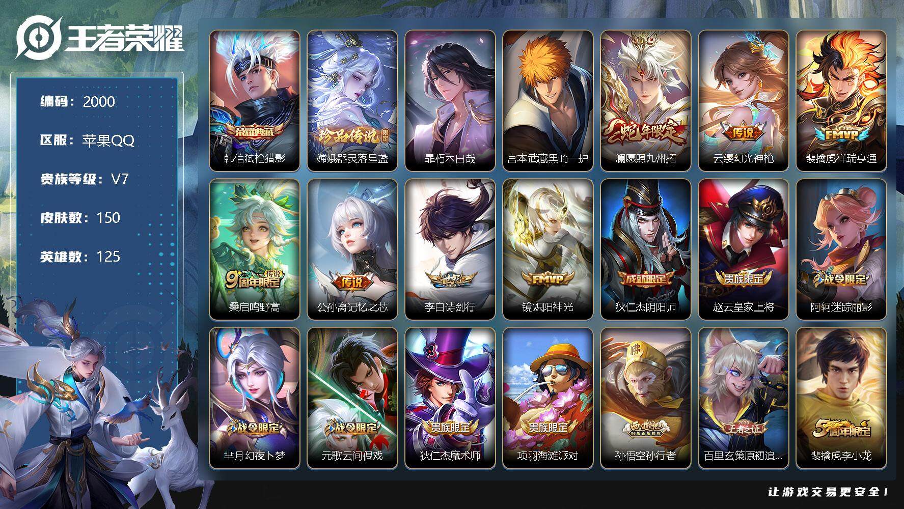 [12681314]苹果Q-V7-至尊星耀I段位-125英雄-150皮肤-1典藏-0珍品无双-0无双-3珍品传说-7传说-41史诗 【英雄全皮】:戈娅全皮,影全皮 【荣耀典藏】:韩信弑枪猎影 【珍品传说】:嫦娥器灵落星盏,暃朽木白哉,宫本武藏黑崎一护 【传说皮肤】:澜愿照九州拓,云缨幻光神枪,裴擒虎祥瑞亨通,桑启鸣野蒿,公孙离记忆之芯,李白诗剑行,镜炽阳神光 【限定皮肤】:狄仁杰阴阳师,赵云皇家上将,阿轲迷踪丽影,芈月幻夜卜梦,元歌云间偶戏,狄仁杰魔术师,项羽海滩派对,孙悟空孙行者,百里玄策原初追逐者,裴擒虎李小龙,西施玲珑珍味,鲁班大师探海日志,戈娅驭风魔法,阿古朵江河有灵,张良古海寻踪,鬼谷子天穹祈灯,姬小满妄想食味,沈梦溪龙舞盛年,刘邦剑破天穹,程咬金群星魔术团,镜青焰无极,项羽苍威无极 【赛季限定】:张良古海寻踪,百里玄策原初追逐者,鲁班大师探海日志,鬼谷子天穹祈灯,刘邦剑破天穹 【战令限定】:阿轲迷踪丽影,芈月幻夜卜梦,元歌云间偶戏,西施玲珑珍味,戈娅驭风魔法,镜青焰无极,项羽苍威无极 【史诗皮肤】:露娜紫霞仙子,阿轲暗夜猫娘,赵云皇家上将,甄姬冰雪圆舞曲,王昭君偶像歌手,狄仁杰魔术师,宫本武藏鬼剑武藏,孙尚香水果甜心,嬴政摇滚巨星,妲己魅力维加斯,墨子金属风暴,吕布圣诞狂欢,曹操幽灵船长,吕布末日机甲,张飞乱世虎臣,小乔缤纷独角兽,蔡文姬舞动绿茵,阿轲节奏热浪,狄仁杰鹰眼统帅,阿轲迷踪丽影,瑶遇见神鹿,百里玄策原初追逐者,裴擒虎李小龙,元歌云间偶戏,西施诗语江南,孙悟空孙行者,镜玫瑰异探,戈娅驭风魔法,阿古朵江河有灵,姬小满妄想食味,镜青焰无极,百里守约百相守梦,牛魔星界战将,阿轲化蝶舞,狂铁龙之律动,后羿石田雨龙,周瑜百相守梦,黄忠百相守梦,朵莉亚幻珠鲛人,西施织梦人,公孙离涂山容容 【其他皮肤】:项羽海滩派对,韩信教廷特使,韩信街头霸王,达摩大发明家,赵云忍炎影,白起白色死神,武则天东方不败,扁鹊化身博士,扁鹊救世之瞳,孙膑天使之翼,典韦黄金武士,亚瑟死亡骑士,花木兰兔女郎,甄姬花好人间,后羿阿尔法小队,狄仁杰阴阳师,刘备汉昭烈帝,关羽龙腾万里,钟无艳海滩丽影,狂铁命运角斗场,鬼谷子幻乐之宴,小乔丁香结,沈梦溪鲨炮海盗猫,盾山圆桌骑士,狂铁特工战影,盘古重装意志,芈月幻夜卜梦,戈娅危途狂花,猪八戒潮玩探月行,赵怀真太极少年,太乙真人劲辣红锅,鲁班大师探海日志,西施玲珑