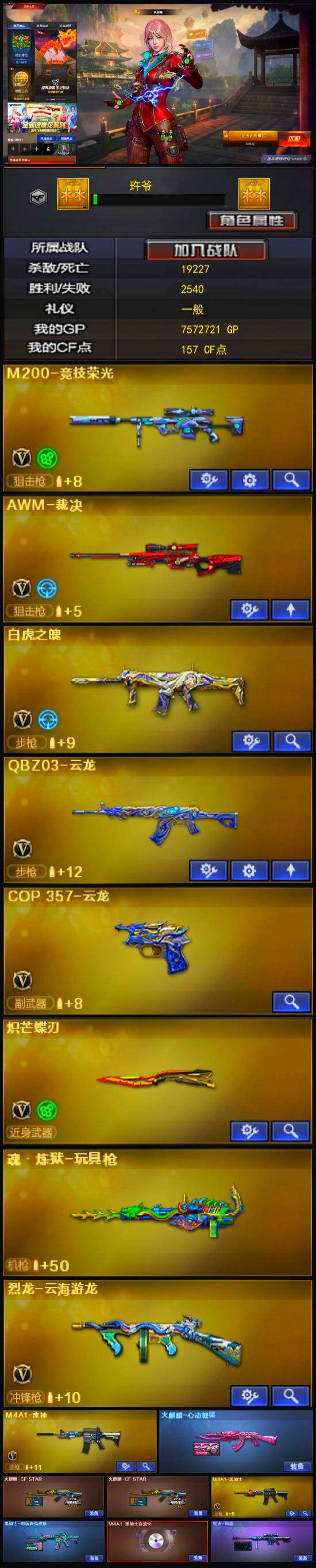 【人偶武器】:天龙-曼陀罗,火麒麟-灵狐,AWM-灵狐-15周年嘉年华,M4A1-雷神-精英刀锋,COP-旗袍,迷你波特博士,夺魂,深渊终结者手雷*2