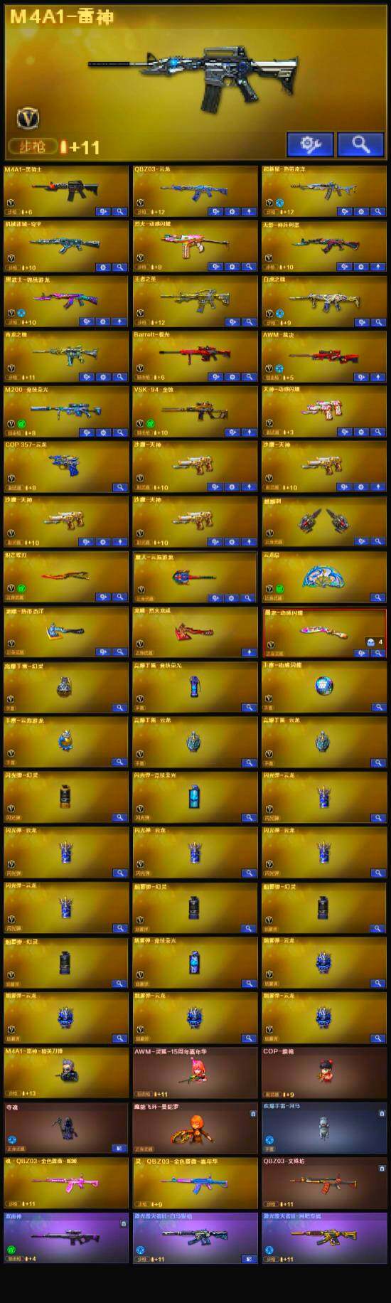 【英雄级武器】:QBZ03-云龙,COP 357-云龙,M200-竞技荣光,高爆手雷-竞技荣光,烟雾弹-竞技荣光,闪光弹-竞技荣光,烈火-动感闪耀,天神-动感闪耀,屠龙-动感闪耀,手雷-动感闪耀,无影-神兵利器,M4A1-雷神,M4A1-黑骑士,Barrett-极光,AWM-裁决,VSK-94-金蚀,黑武士-锦绣游龙,超新星-热带奇洋,沙鹰-天神*4,炽芒蝶刃,麒麟刺,擎天-云海游龙,龙啸-热带奇洋