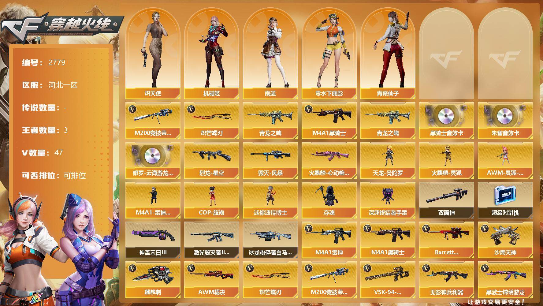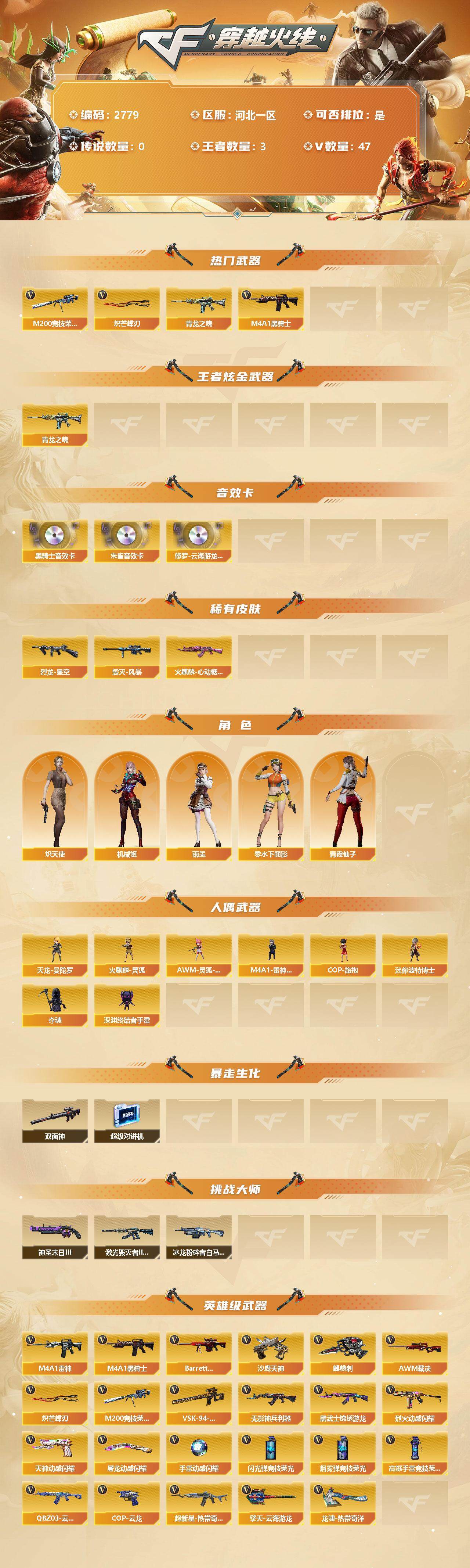 [12681320]河北一区-47V-3王者-0炫金 【热门武器】:M200-竞技荣光,青龙之魄,M4A1-黑骑士,炽芒蝶刃 【王者炫金武器】:青龙之魄 【音效卡】:修罗-云海游龙音效卡,M4A1-黑骑士音效卡,HK417-朱雀音效卡 【稀有皮肤】:火麒麟-心动糖果,毁灭-风暴,烈龙-星空 【角色】:零-水下丽影,雨墨,机械姬,炽天使,青霞仙子 【人偶武器】:天龙-曼陀罗,火麒麟-灵狐,AWM-灵狐-15周年嘉年华,M4A1-雷神-精英刀锋,COP-旗袍,迷你波特博士,夺魂,深渊终结者手雷*2 【暴走生化】:双面神,超级对讲机 【挑战大师】:神圣爆裂者-末日III,激光毁灭者III-白马银枪,冰龙粉碎者-白马银枪 【英雄级武器】:QBZ03-云龙,COP 357-云龙,M200-竞技荣光,高爆手雷-竞技荣光,烟雾弹-竞技荣光,闪光弹-竞技荣光,烈火-动感闪耀,天神-动感闪耀,屠龙-动感闪耀,手雷-动感闪耀,无影-神兵利器,M4A1-雷神,M4A1-黑骑士,Barrett-极光,AWM-裁决,VSK-94-金蚀,黑武士-锦绣游龙,超新星-热带奇洋,沙鹰-天神*4,炽芒蝶刃,麒麟刺,擎天-云海游龙,龙啸-热带奇洋 【特殊枪械】:1黑骑士