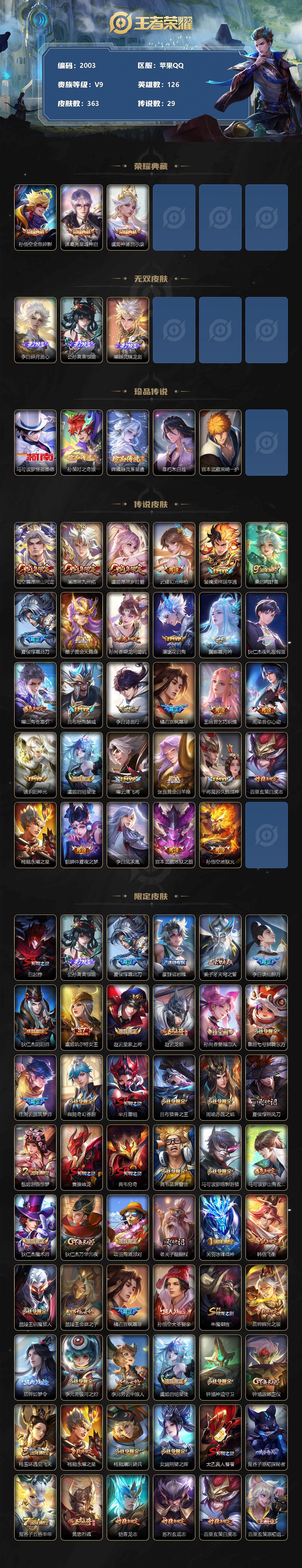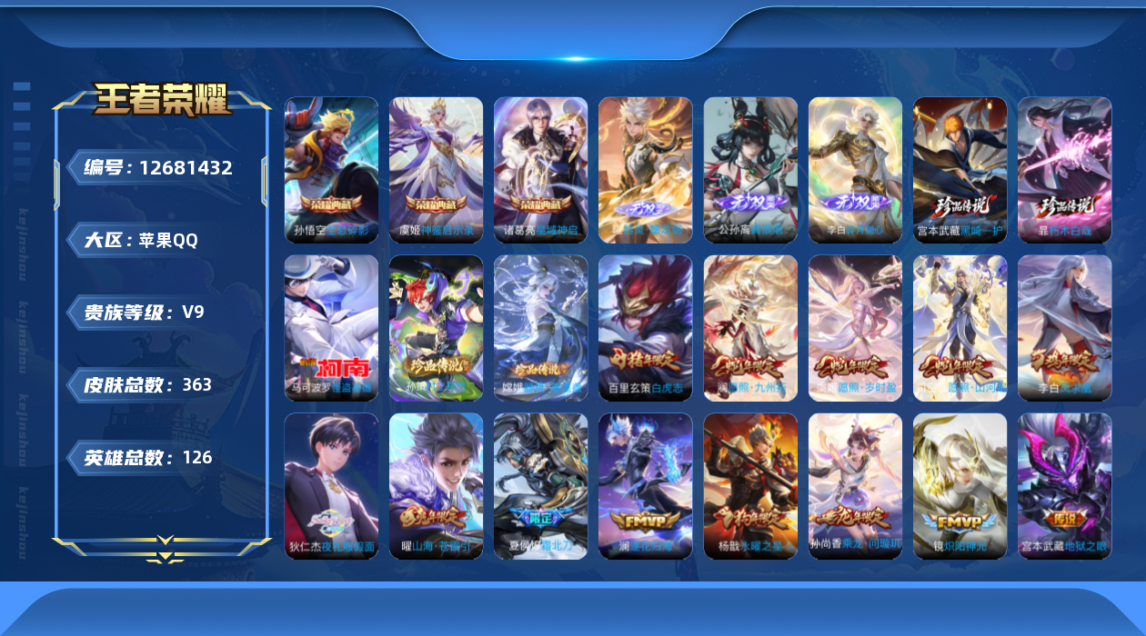 [12681432]苹果Q-V9-尊贵铂金II段位-126英雄-363皮肤-3典藏-0珍品无双-3无双-5珍品传说-29传说-99史诗