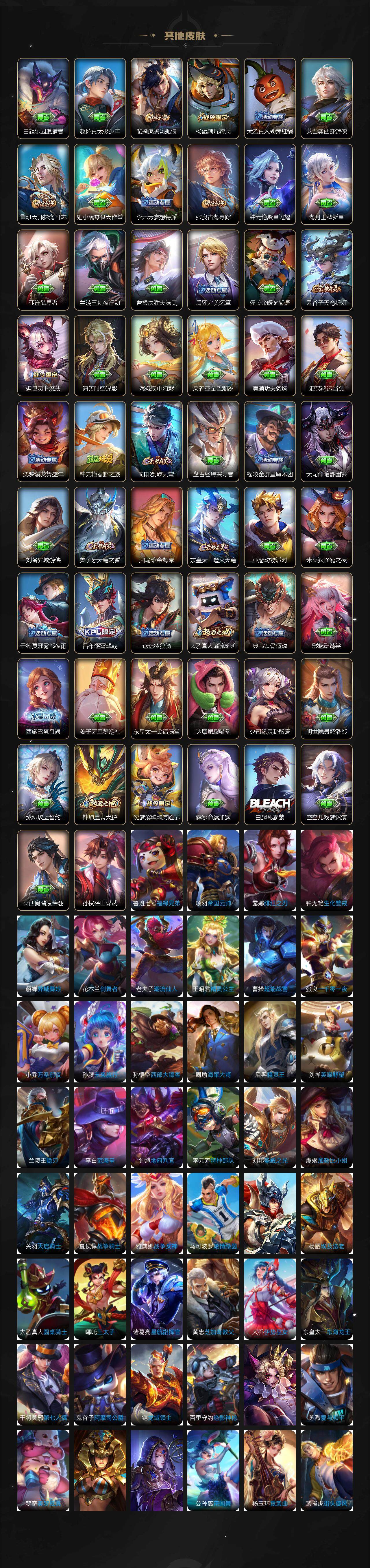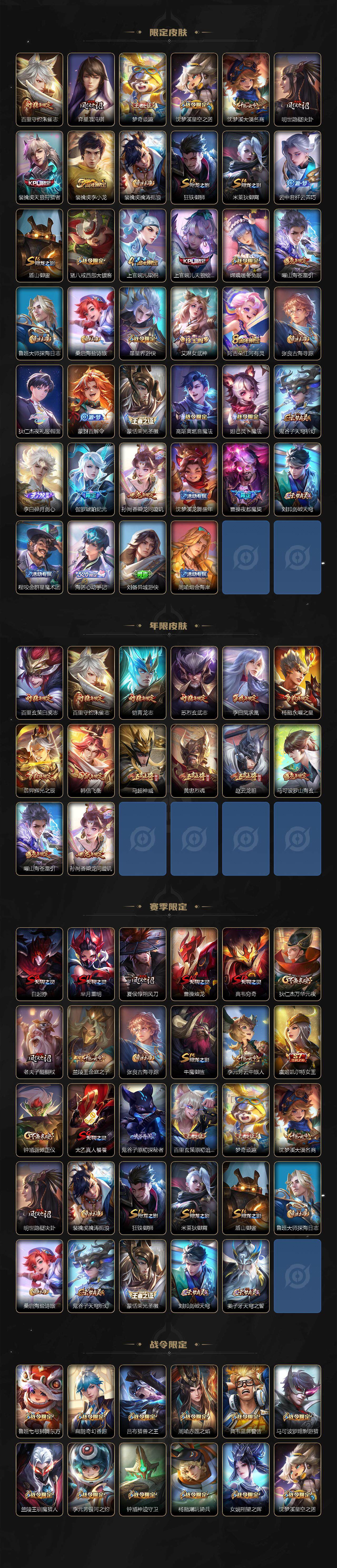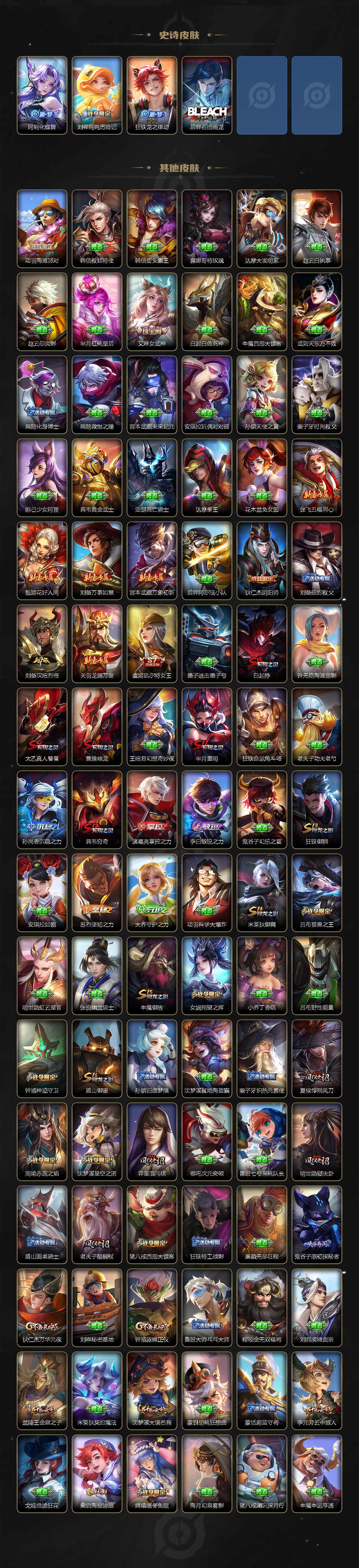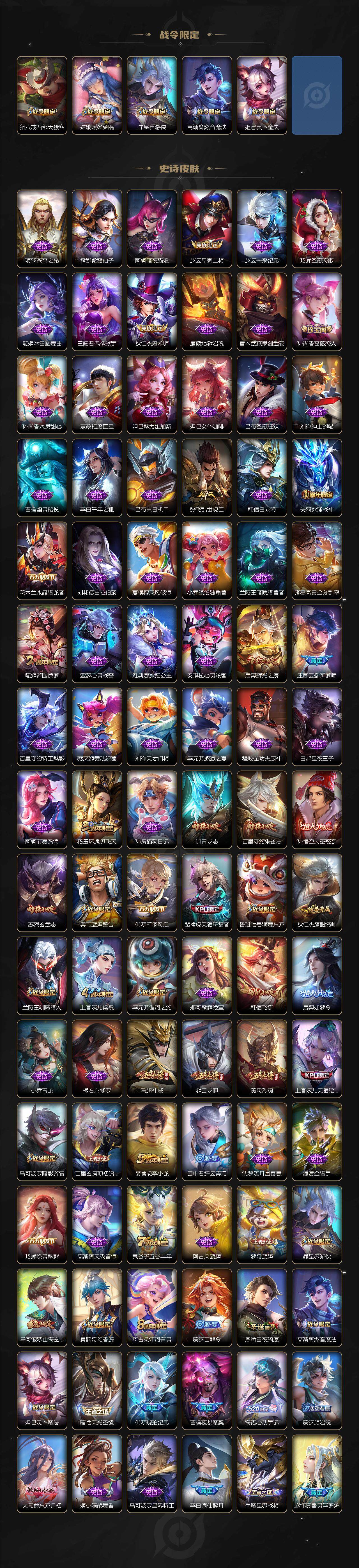 【限定皮肤】:白起狰,公孙离离恨烟,夏侯惇霜北刀,蒙犽顽岩魄,姜子牙天穹之誓,李白谪仙醉月,狄仁杰阴阳师,虞姬凯尔特女王,赵云皇家上将,赵云龙胆,孙尚香蔷薇恋人,鲁班七号狮舞东方,庄周云端筑梦师,扁鹊奇幻香踪,芈月重明,吕布猎兽之王,周瑜赤莲之焰,夏侯惇朔风刀,甄姬游园惊梦,曹操烛龙,典韦穷奇,典韦蓝屏警告,马可波罗暗影游猎,马可波罗山海玄木吟,狄仁杰魔术师,狄仁杰万华元夜,项羽海滩派对,老夫子醍醐杖,关羽冰锋战神,韩信飞衡,兰陵王驯魔猎人,兰陵王金庭之子,橘右京枫霜尽,孙悟空大圣娶亲,牛魔御旌,后羿辉光之辰,后羿如梦令,李元芳银河之约,李元芳云中旅人,虞姬启明星使,钟馗神迹守卫,钟馗驱傩正仪,杨玉环遇见飞天,杨戬永曜之星,杨戬潮玩骑兵,女娲朔望之晖,太乙真人饕餮,鬼谷子原初探秘者,鬼谷子五谷丰年,黄忠烈魂,铠青龙志,苏烈玄武志,百里玄策白虎志,百里玄策原初追逐者,百里守约朱雀志,弈星混沌棋,梦奇顽趣,沈梦溪星空之诺,沈梦溪大漠名商,明世隐疑决卦,裴擒虎天狼狩猎者,裴擒虎李小龙,裴擒虎擒涛扼浪,狂铁御狮,米莱狄御霄,云中君纤云弄巧,盾山御銮,猪八戒西部大镖客,上官婉儿梁祝,上官婉儿天狼绘梦者,嫦娥暖冬兔眠,曜山海苍雷引,鲁班大师探海日志,桑启海盐诗旅,暃星界游侠,艾琳女武神,阿古朵江河有灵,张良古海寻踪,狄仁杰夜礼服假面,蒙犽百解令,蒙恬荣光圣徽,