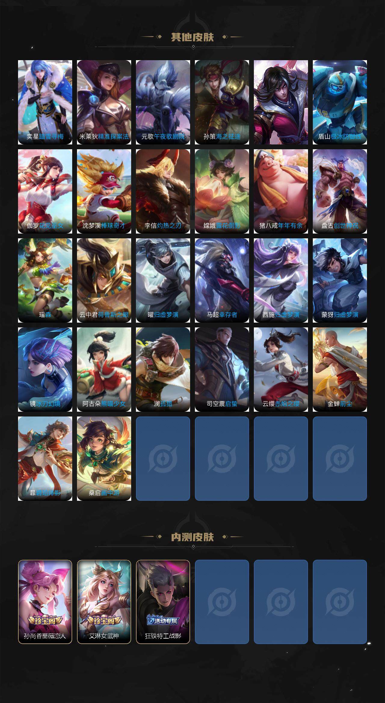 关羽冰锋战神,裴擒虎李小龙,上官婉儿梁祝,赵云龙胆,黄忠烈魂,马超神威,后羿辉光之辰,韩信飞衡,裴擒虎天狼狩猎者,上官婉儿天狼绘梦者,铠青龙志,百里玄策白虎志,苏烈玄武志,百里守约朱雀志,孙悟空大圣娶亲,后羿如梦令,庄周云端筑梦师,橘右京枫霜尽,李白诗剑行,马可波罗山海·玄木吟,夏侯惇霜北刀,桑启鸣野蒿,澜愿照·九州拓,虞姬愿照·岁时盈,司空震愿照·山河定