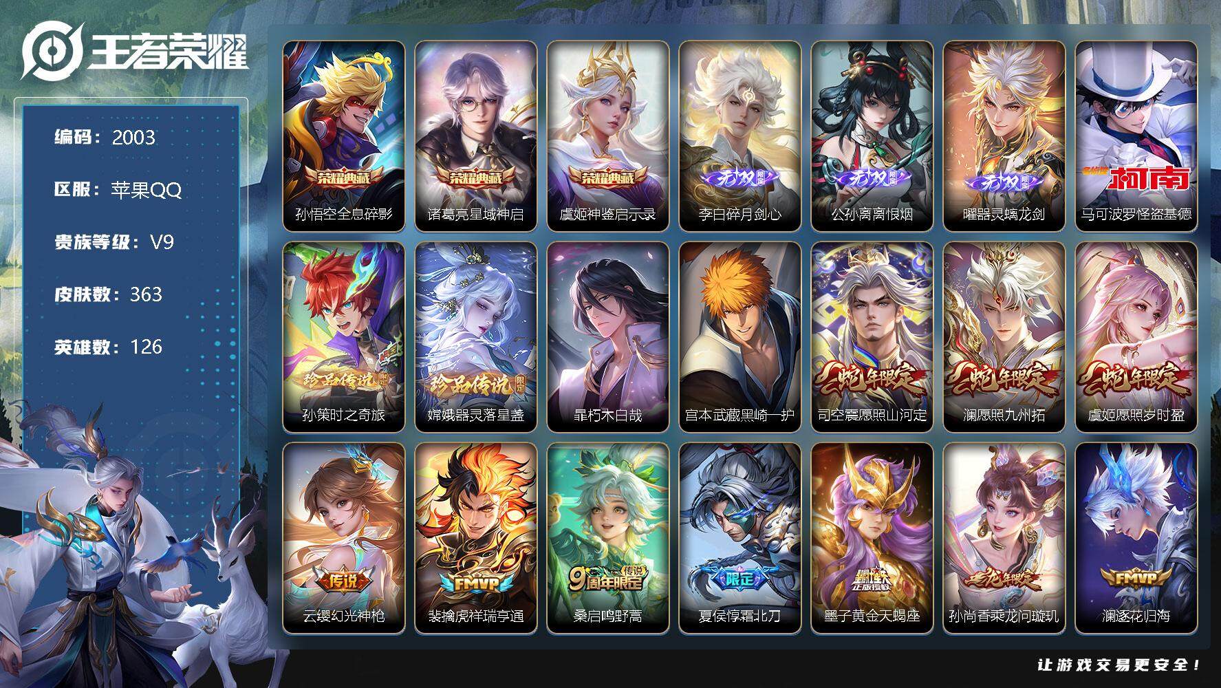 - [11524021]V6 2珍品传说 5传说 122英雄 124皮肤 可修改实名 禁止排行榜到2026年2月27日解除 优质装备:江户川柯南,怪盗基德,炽阳神光,记忆之芯(机甲兔) 珍宝阁皮:胡桃夹子,玩趣恶龙 限定皮:愿照·九州拓(澜年限),鸣野蒿,绯月行,五谷丰年,李小龙 史诗皮:器灵·浮梦炉,百相守梦-百里守约,紫霞仙子,江河有灵,百解令(蒙犽),冰冠公主,青蛇,末日机甲-吕布,乱世虎臣,女仆咖啡,摇滚巨星,水果甜心,星夜王子,功夫厨神,幽灵船长,水晶猎龙者,箭羽风息,圣诞恋歌,鹰眼统帅,魅力维加斯,无心