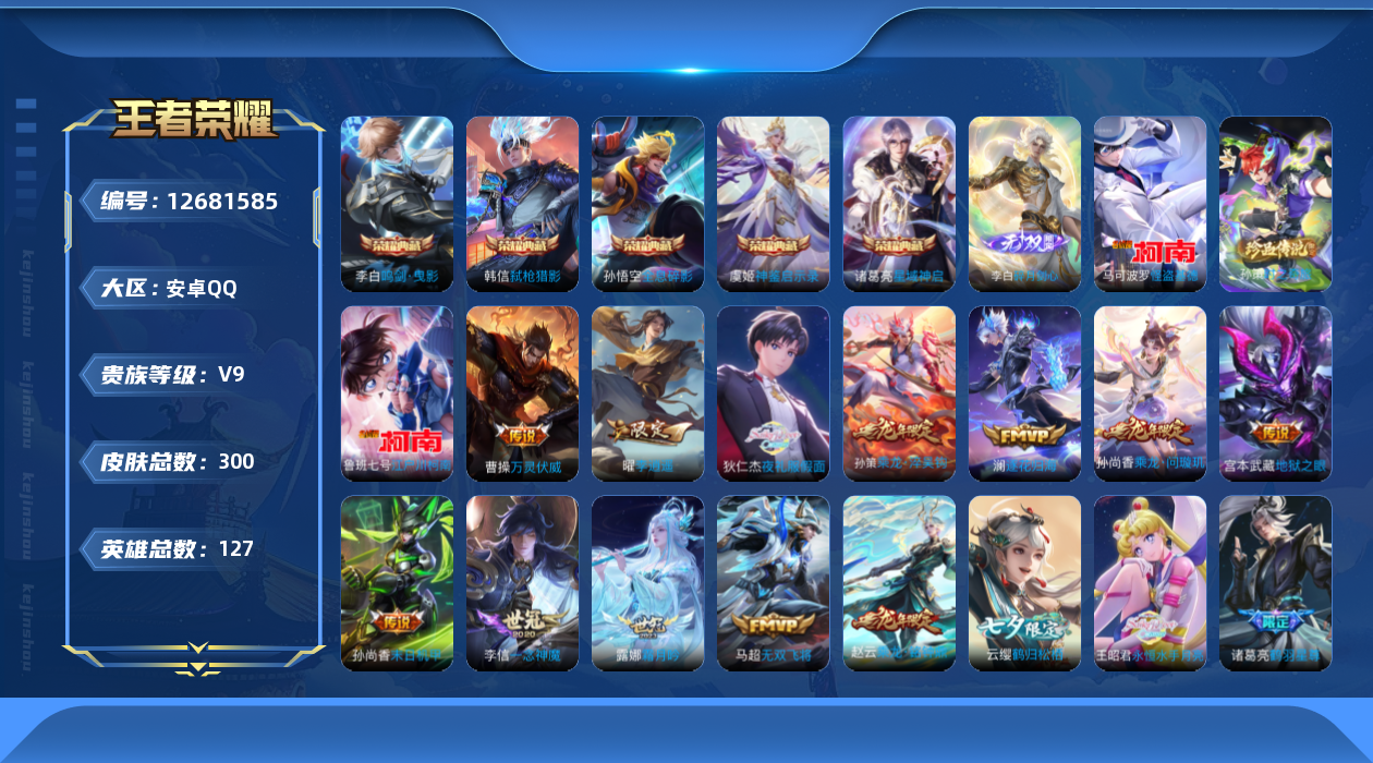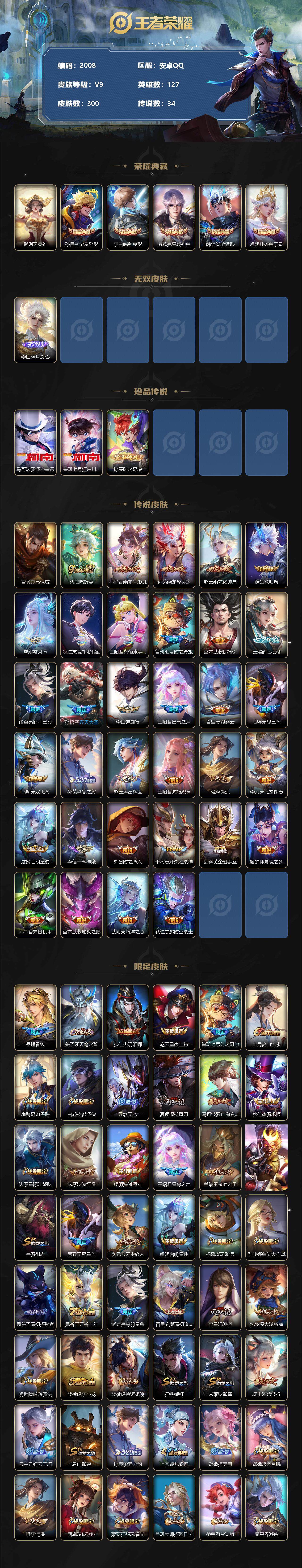 [12681585]安卓Q-V9-永恒钻石II段位-127英雄-300皮肤-5典藏-0珍品无双-1无双-3珍品传说-34传说-71史诗