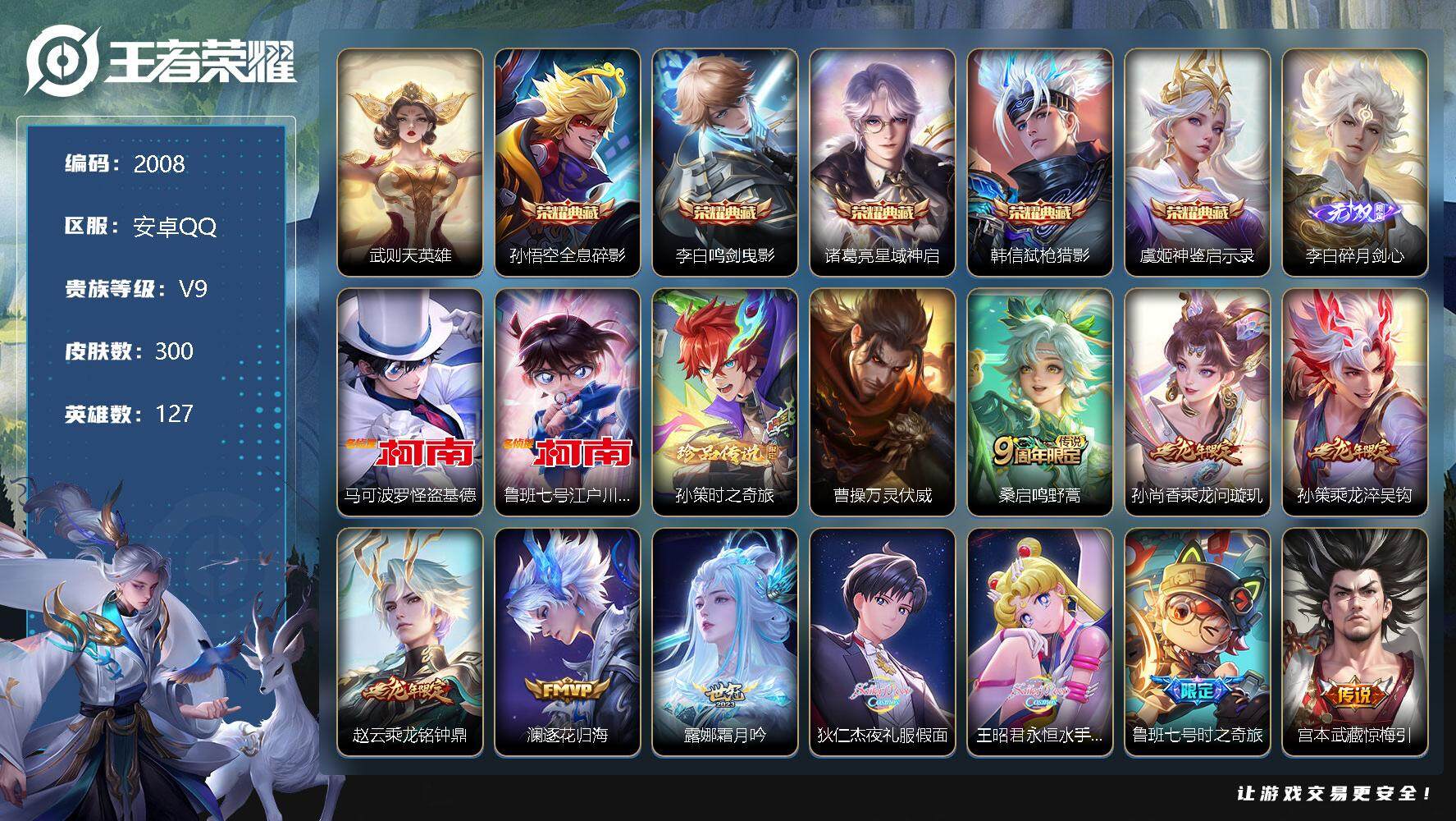 [12681585]安卓Q-V9-永恒钻石II段位-127英雄-300皮肤-5典藏-0珍品无双-1无双-3珍品传说-34传说-71史诗 【英雄全皮】:孙权全皮,鬼谷子全皮 【荣耀典藏】:武则天英雄,孙悟空全息碎影,李白鸣剑曳影,诸葛亮星域神启,韩信弑枪猎影,虞姬神鉴启示录 【无双皮肤】:李白碎月剑心 【珍品传说】:马可波罗怪盗基德,鲁班七号江户川柯南,孙策时之奇旅 【传说皮肤】:曹操万灵伏威,桑启鸣野蒿,孙尚香乘龙问璇玑,孙策乘龙淬吴钩,赵云乘龙铭钟鼎,澜逐花归海,露娜霜月吟,狄仁杰夜礼服假面,王昭君永恒水手月亮,鲁班七号时之奇旅,宫本武藏惊梅引,云缨鹤归松栖,诸葛亮鹤羽星尊,孙悟空齐天大圣,李白诗剑行,王昭君星穹之声,百里守约碎云,后羿无尽星芒,马超无双飞将,孙策挚爱之约,赵云淬星耀世,王昭君乞巧织情,曜李逍遥 ,李元芳飞鸢探春,虞姬启明星使,李信一念神魔,刘备时之恋人,干将莫邪久胜战神,后羿黄金射手座,貂蝉仲夏夜之梦,孙尚香末日机甲,宫本武藏地狱之眼,武则天海洋之心,狄仁杰超时空战士 【限定皮肤】:暃埋骨钱,姜子牙天穹之誓,狄仁杰阴阳师,赵云皇家上将,鲁班七号时之奇旅,庄周高山流水,扁鹊奇幻香踪,白起夜都怪侠,元歌无心,夏侯惇朔风刀,马可波罗山海玄木吟,狄仁杰魔术师,达摩星际陆战队,达摩沙漠行僧,项羽海滩派对,王昭君星穹之声,兰陵王金庭之子,孙悟空齐天大圣,牛魔御旌,后羿无尽星芒,李元芳云中旅人,虞姬启明星使,杨戬潮玩骑兵,雅典娜单词大作战,鬼谷子原初探秘者,鬼谷子五谷丰年,诸葛亮鹤羽星尊,百里玄策原初追逐者,弈星混沌棋,沈梦溪大漠名商,明世隐吟游魔法,裴擒虎李小龙,裴擒虎擒涛扼浪,狂铁御狮,米莱狄御霄,瑶山海碧波行,云中君纤云弄巧,盾山御銮,孙策挚爱之约,上官婉儿梁祝,嫦娥拒霜思,嫦娥暖冬兔眠,曜李逍遥 ,西施玲珑珍味,蒙犽狂想玩偶喵,鲁班大师探海日志,桑启海盐诗旅,暃星界游侠,戈娅驭风魔法,艾琳流音漫舞,云缨鹤归松栖,司空震地狱燃心,阿古朵江河有灵,张良古海寻踪,王昭君永恒水手月亮,狄仁杰夜礼服假面,蒙犽百解令,高渐离燃音魔法,妲己灵卜魔法,鬼谷子天穹祈灯,李白碎月剑心,姬小满妄想食味,大乔乘龙忆丹青,安琪拉乘龙聚宝船,孙尚香乘龙问璇玑,孙策乘龙淬吴钩,赵云乘龙铭钟鼎,鲁班七号蔬乡物语,李元芳蔬乡物语,刘邦剑破天穹,程咬金群星魔术团,周瑜熔金海岸 【年限皮肤】:瑶山海碧波行,