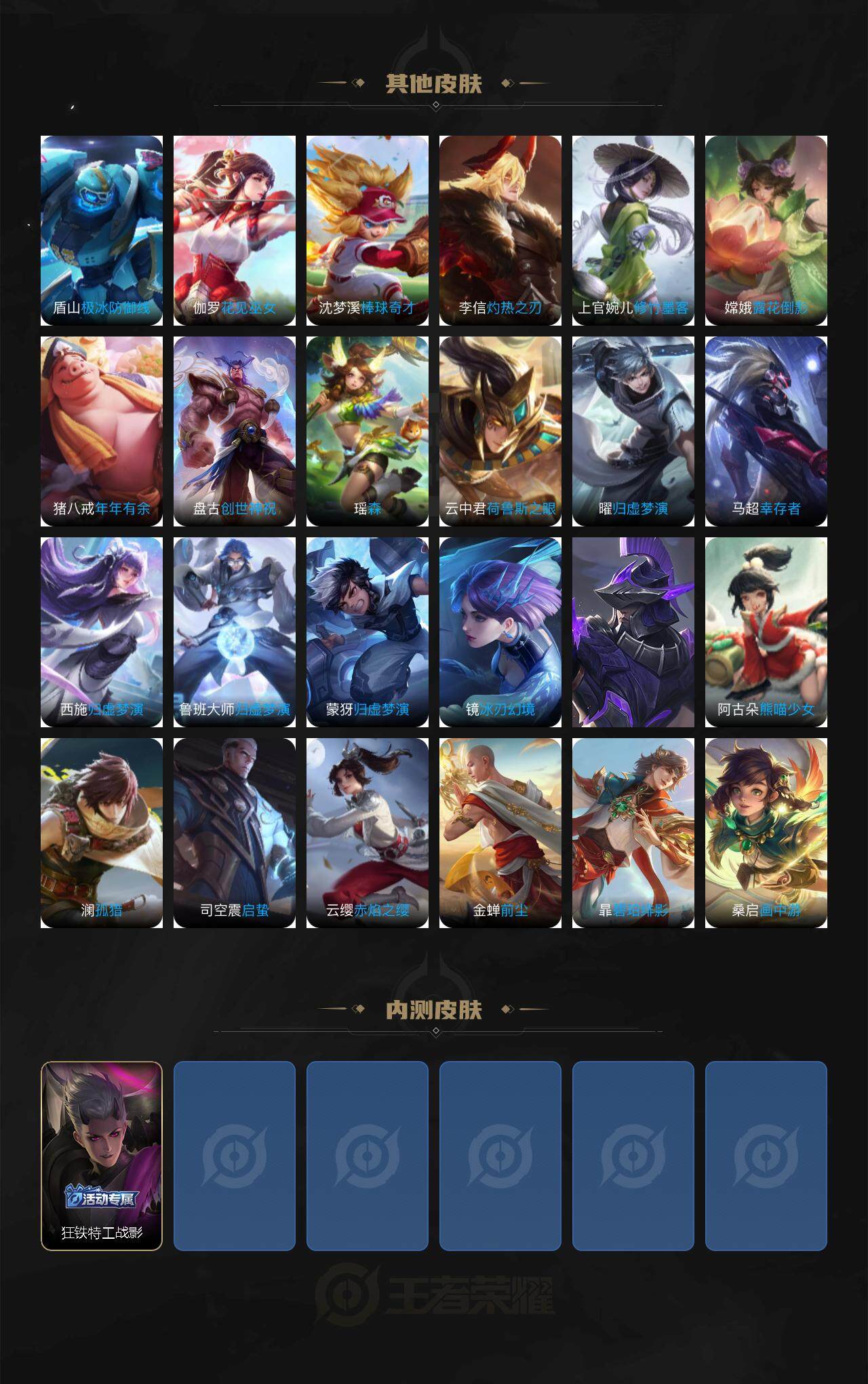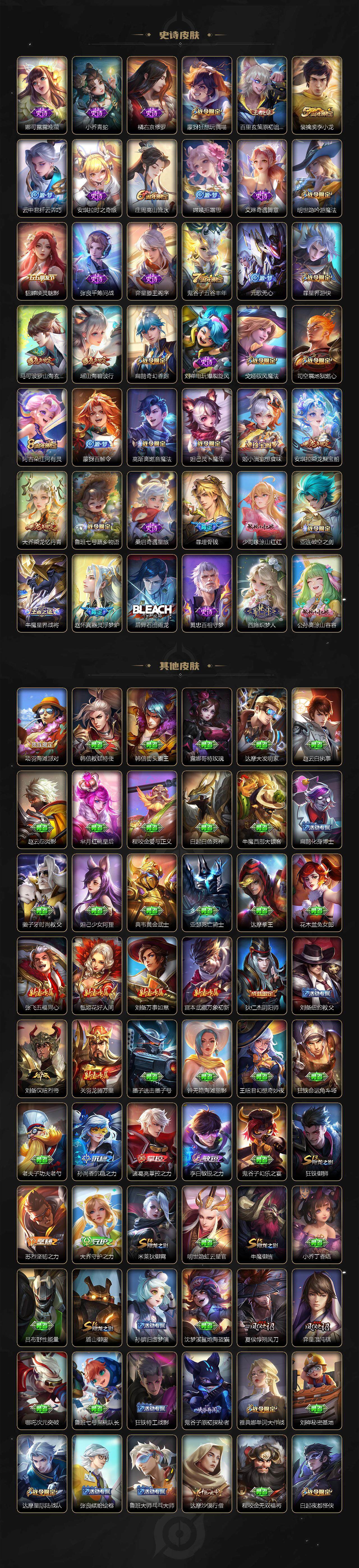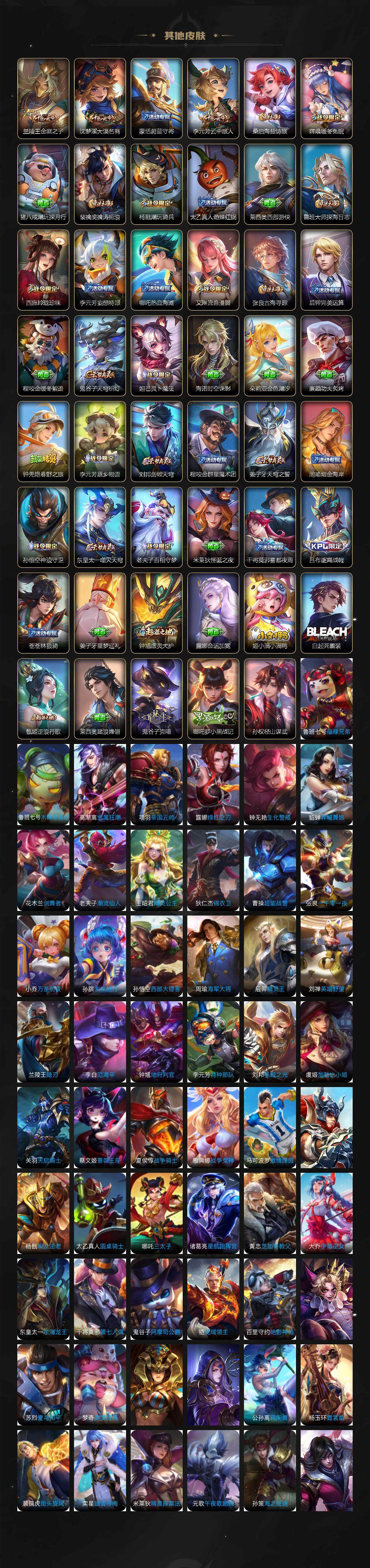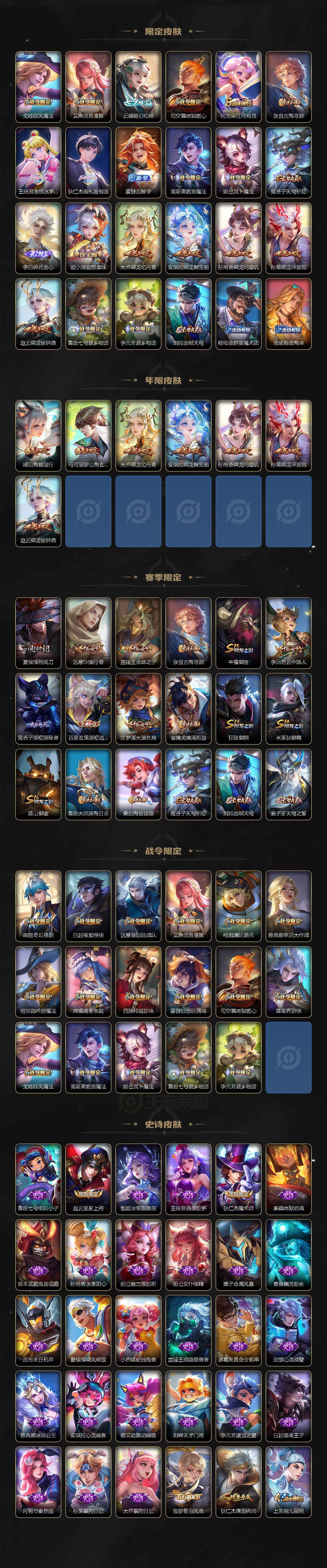 【限定皮肤】:暃埋骨钱,姜子牙天穹之誓,狄仁杰阴阳师,赵云皇家上将,鲁班七号时之奇旅,庄周高山流水,扁鹊奇幻香踪,白起夜都怪侠,元歌无心,夏侯惇朔风刀,马可波罗山海玄木吟,狄仁杰魔术师,达摩星际陆战队,达摩沙漠行僧,项羽海滩派对,王昭君星穹之声,兰陵王金庭之子,孙悟空齐天大圣,牛魔御旌,后羿无尽星芒,李元芳云中旅人,虞姬启明星使,杨戬潮玩骑兵,雅典娜单词大作战,鬼谷子原初探秘者,鬼谷子五谷丰年,诸葛亮鹤羽星尊,百里玄策原初追逐者,弈星混沌棋,沈梦溪大漠名商,明世隐吟游魔法,裴擒虎李小龙,裴擒虎擒涛扼浪,狂铁御狮,米莱狄御霄,瑶山海碧波行,云中君纤云弄巧,盾山御銮,孙策挚爱之约,上官婉儿梁祝,嫦娥拒霜思,嫦娥暖冬兔眠,曜李逍遥 ,西施玲珑珍味,蒙犽狂想玩偶喵,鲁班大师探海日志,桑启海盐诗旅,暃星界游侠,戈娅驭风魔法,艾琳流音漫舞,云缨鹤归松栖,司空震地狱燃心,阿古朵江河有灵,张良古海寻踪,王昭君永恒水手月亮,狄仁杰夜礼服假面,蒙犽百解令,高渐离燃音魔法,妲己灵卜魔法,鬼谷子天穹祈灯,李白碎月剑心,姬小满妄想食味,大乔乘龙忆丹青,安琪拉乘龙聚宝船,孙尚香乘龙问璇玑,孙策乘龙淬吴钩,赵云乘龙铭钟鼎,鲁班七号蔬乡物语,李元芳蔬乡物语,刘邦剑破天穹,程咬金群星魔术团,周瑜熔金海岸