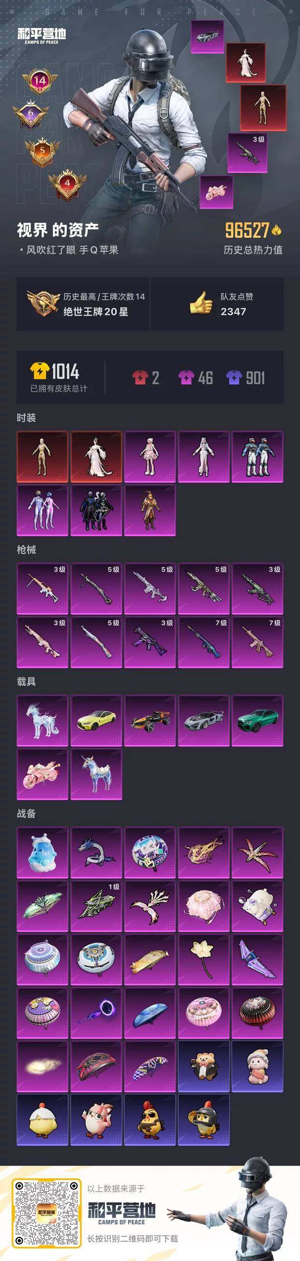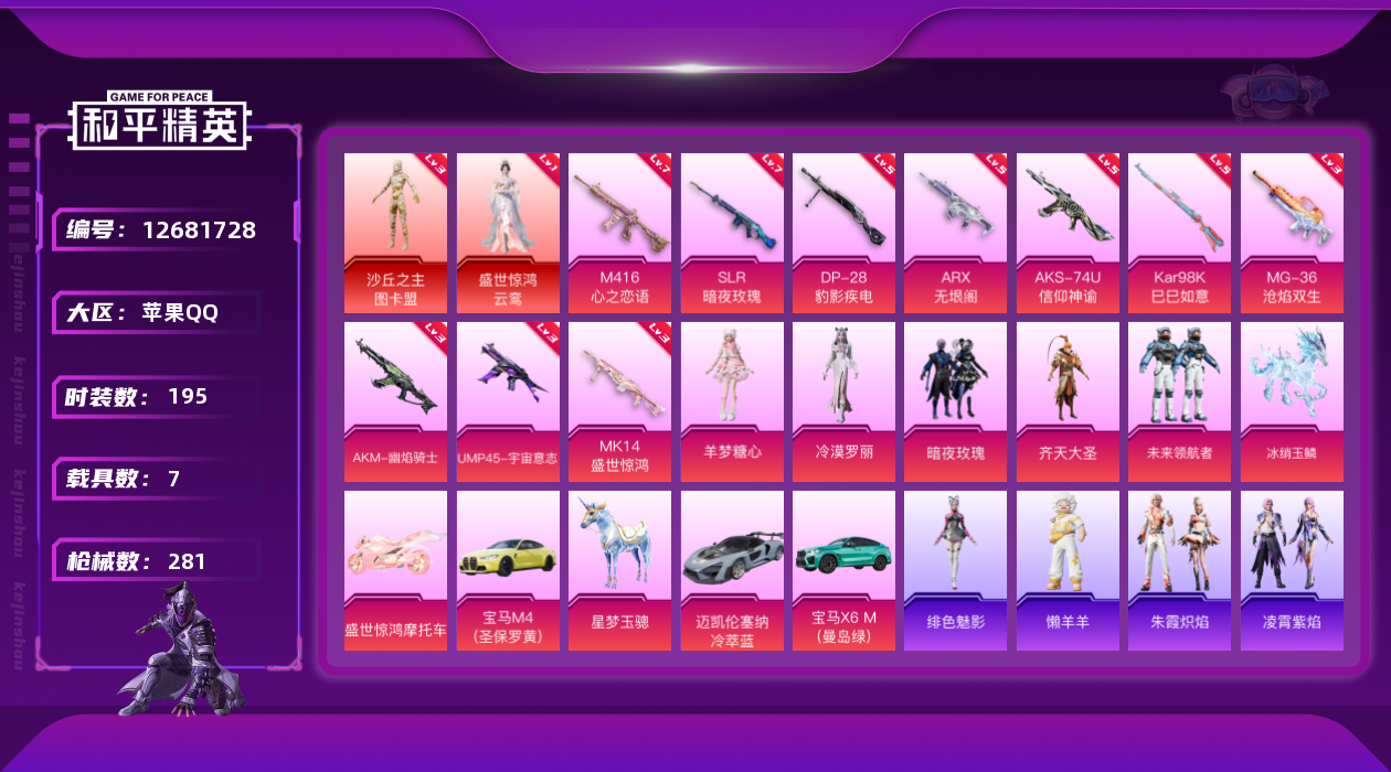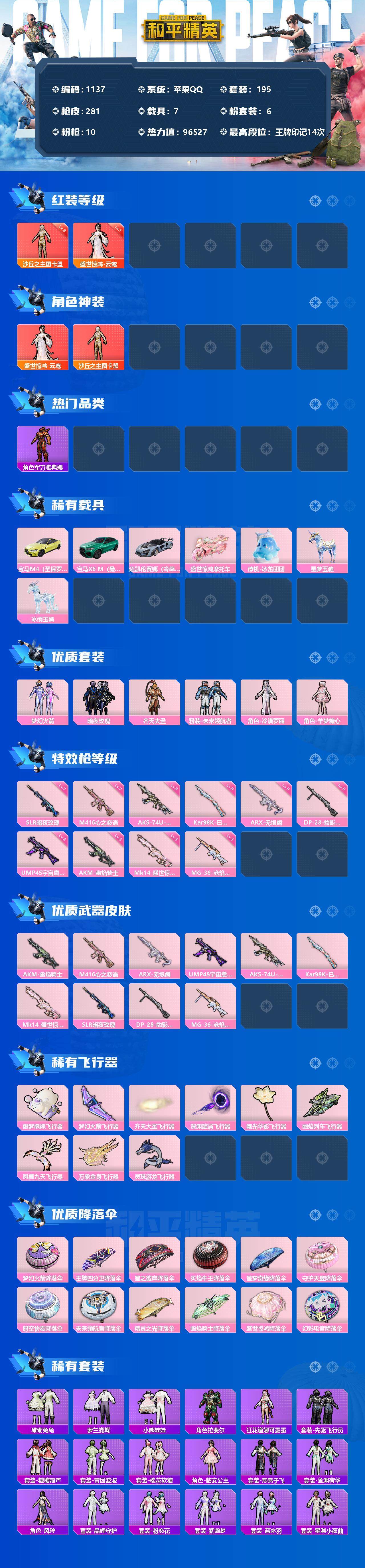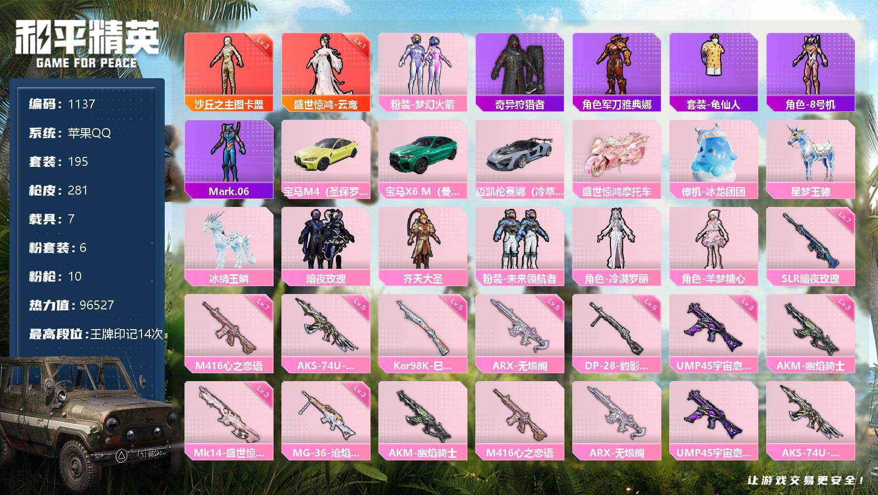 [12681728]苹果 手Q-2神装-6粉装-10特效枪-7载具-10粉色飞行器-96527热力值-14王牌印记-195套装-281枪皮
