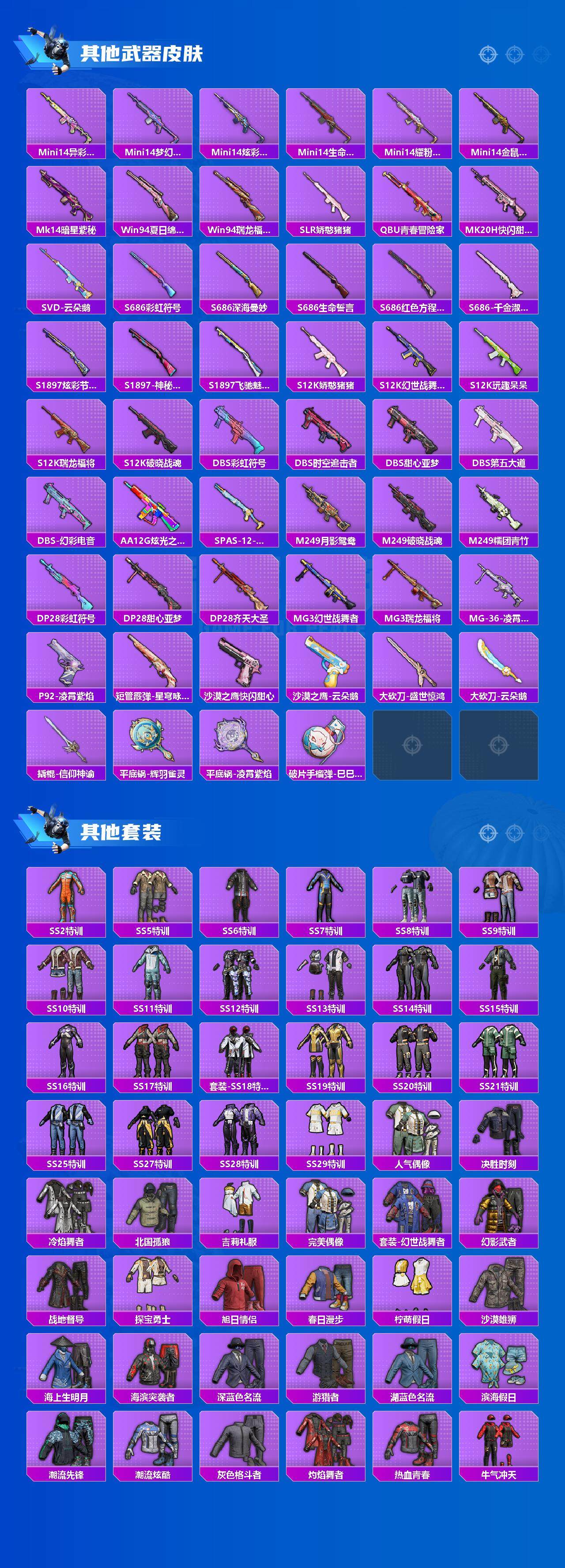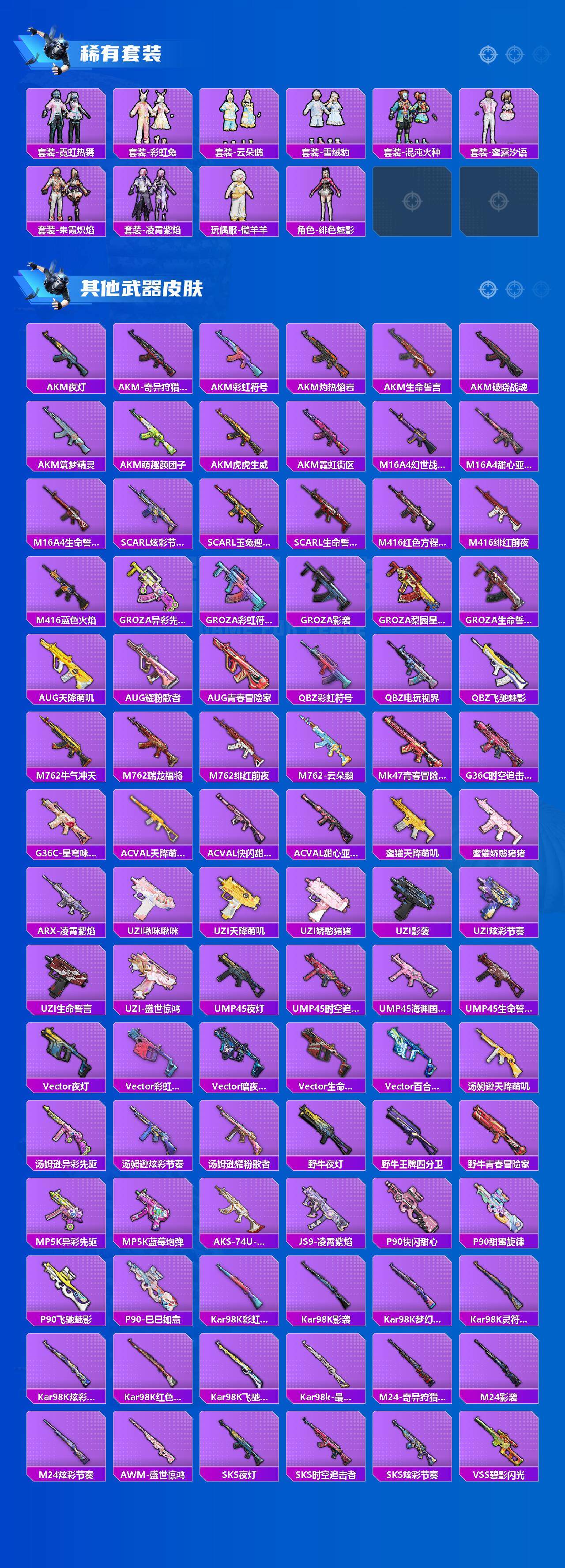 [12681728]苹果 手Q-2神装-6粉装-10特效枪-7载具-10粉色飞行器-96527热力值-14王牌印记-195套装-281枪皮 【红色神装等级】:盛世惊鸿-云鸾(一级),沙丘之主-图卡盟(三级) 【红色角色神装】:盛世惊鸿-云鸾,沙丘之主-图卡盟 【热门品类】:粉装-梦幻火箭,套装-奇异狩猎者,角色-军刀雅典娜,套装-龟仙人,角色-8号机,角色-Mark.06 【粉色载具】:宝马M4(圣保罗黄),宝马X6 M(曼岛绿),迈凯伦塞纳(冷萃蓝),盛世惊鸿摩托车,僚机-冰龙团团,星梦玉骢,冰绡玉鳞 【粉色套装】:粉装-梦幻火箭,粉装-暗夜玫瑰,粉装-齐天大圣,粉装-未来领航者,角色-冷漠罗丽,角色-羊梦糖心 【粉色枪皮等级】:AKM-幽焰骑士(三级),M416-心之恋语(七级),ARX-无垠阁(五级),UMP45-宇宙意志(三级),AKS-74U-信仰神谕(五级),Kar98K-巳巳如意(五级),Mk14-盛世惊鸿(三级),SLR-暗夜玫瑰(七级),DP-28-豹影疾电(五级),MG-36-沧焰双生(三级) 【粉色枪皮】:AKM-幽焰骑士,M416-心之恋语,ARX-无垠阁,UMP45-宇宙意志,AKS-74U-信仰神谕,Kar98K-巳巳如意,Mk14-盛世惊鸿,SLR-暗夜玫瑰,DP-28-豹影疾电,MG-36-沧焰双生 【粉色飞行器】:酣梦熊熊飞行器,梦幻火箭飞行器,齐天大圣飞行器,深渊漩涡飞行器,曦光华影飞行器,幽焰列车飞行器,凤舞九天飞行器,万象金身飞行器,灵珠游龙飞行器 【粉色降落伞】:梦幻火箭降落伞,王牌四分卫降落伞,星之彼岸降落伞,炙焰牛王降落伞,星梦奇缘降落伞,守护天翼降落伞,时空协奏降落伞,未来领航者降落伞,精灵之光降落伞,幽焰骑士降落伞,盛世惊鸿降落伞,幻彩电音降落伞 【稀有套装】:套装-龟仙人,套装-雏菊兔兔,套装-萝兰蝴蝶,套装-小熊娃娃,角色-拉斐尔,角色-狂花道·娜可露露,套装-先驱飞行员,套装-糖糖葫芦,套装-青团波波,套装-棉花软糖,角色-临安公主,套装-燕燕于飞,套装-鱼渊荷华,角色-风玲,套装-晶辉守护,套装-粉恋花,套装-紫幽梦,套装-蓝冰羽,套装-星渊小夜曲,套装-霓虹热舞,套装-彩虹兔,套装-云朵鹅,套装-雪绒豹,套装-混沌火种,套装-蜜露汐语,套装-朱霞炽焰,套装-凌霄紫焰,玩偶服-懒羊羊,角色-绯色魅影 【稀有枪皮】:AKM-夜灯