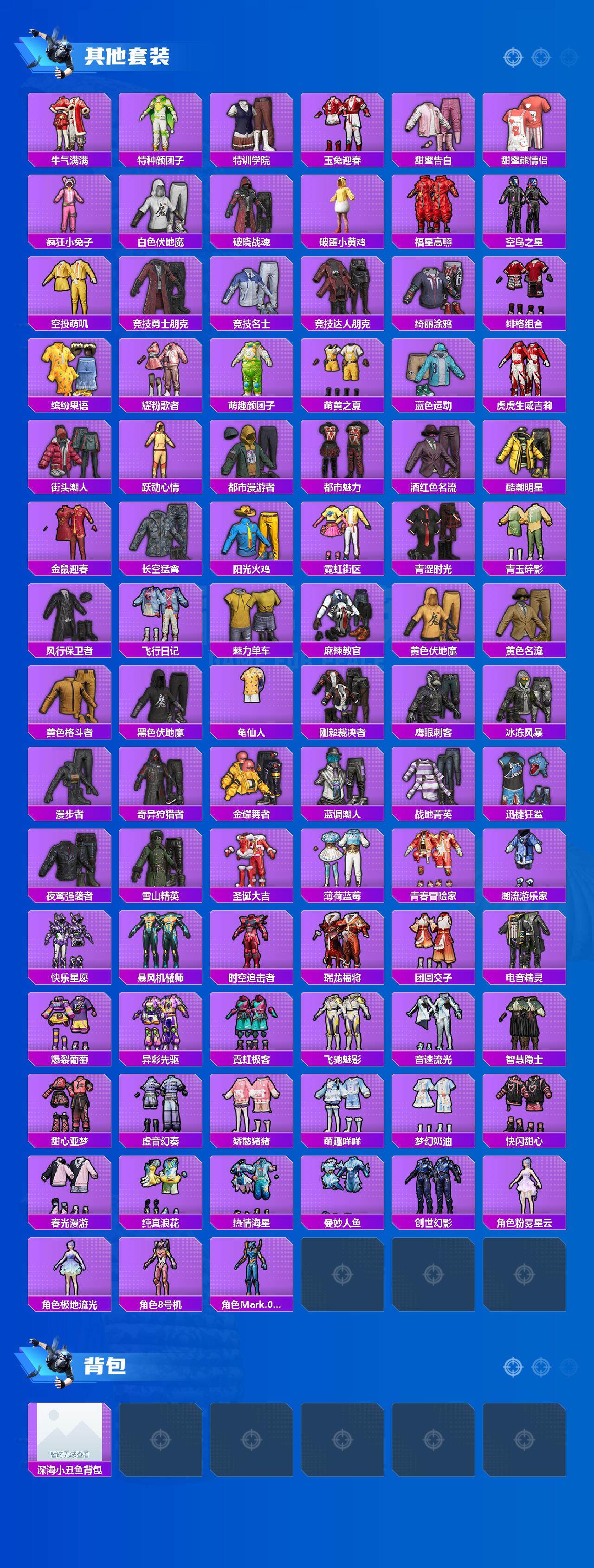 角色-军刀雅典娜,套装-龟仙人,角色-8号机,角色-Mark.06,套装-破蛋小黄鸡,套装-漫步者,套装-雪山精英,薄荷蓝莓套装,套装-瑞龙福将,套装-团圆交子