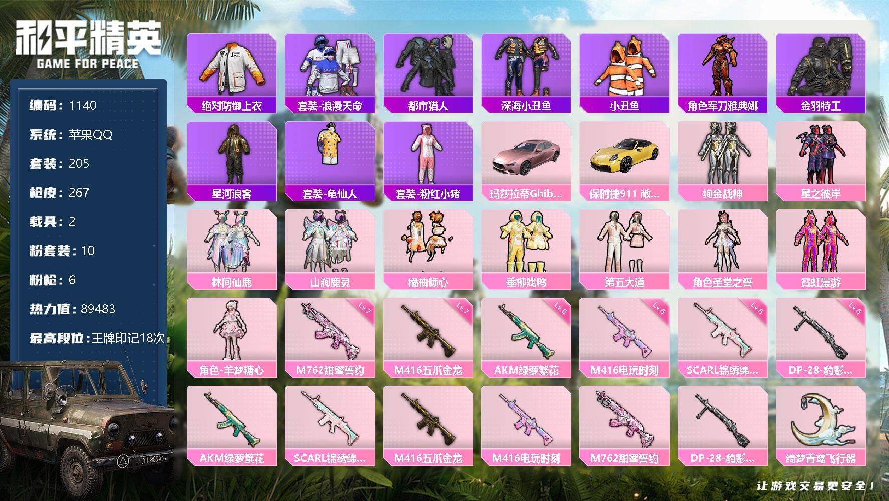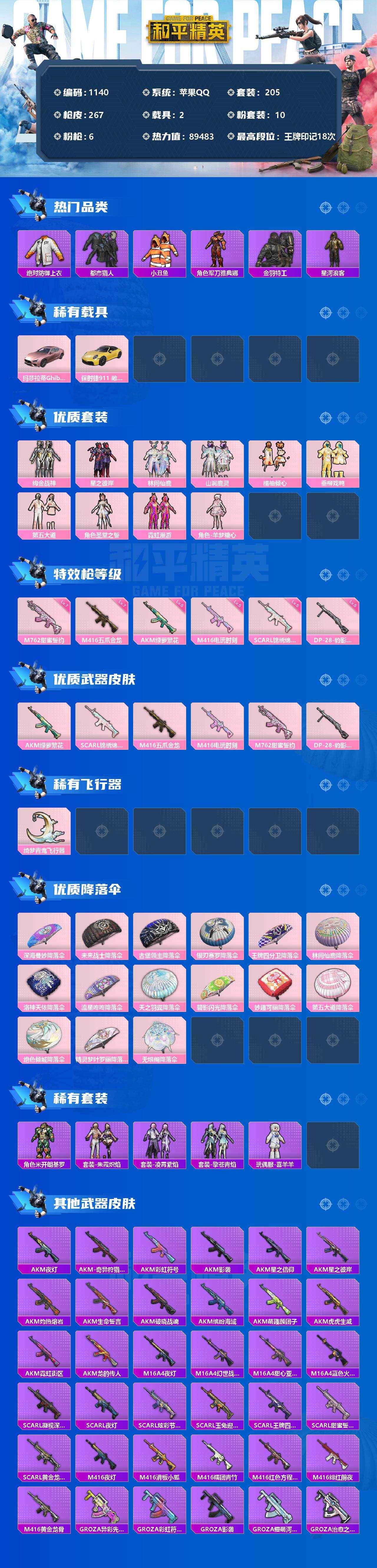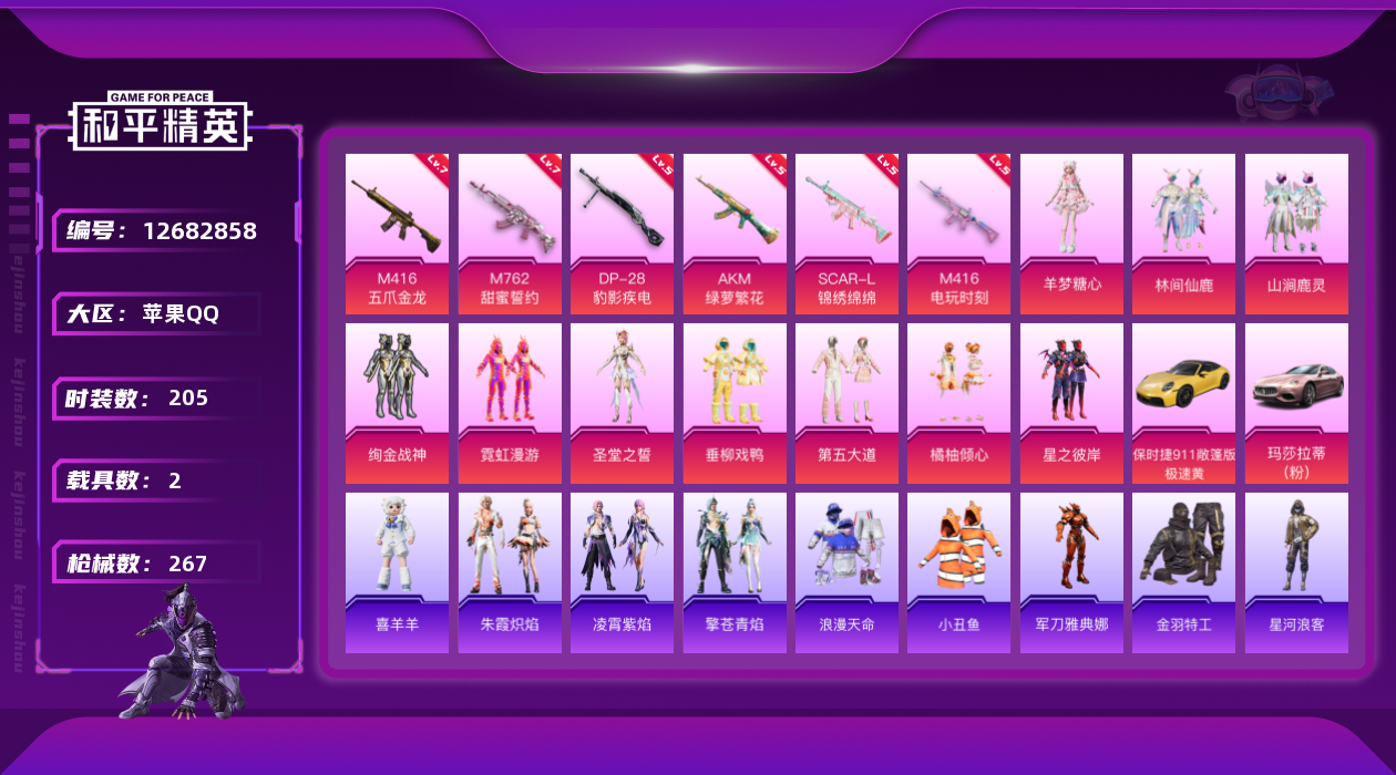 [12682858]苹果 手Q-10粉装-6特效枪-2载具-1粉色飞行器-89483热力值-18王牌印记-205套装-267枪皮 【热门品类】:绝对防御上衣,套装-浪漫天命,套装-都市猎人,套装-深海小丑鱼,套装-小丑鱼,角色-军刀雅典娜,套装-金羽特工,套装-星河浪客,套装-龟仙人,套装-粉红小猪 【粉色载具】:玛莎拉蒂Ghibli(粉),保时捷911 敞篷版(极速黄) 【粉色套装】:粉装-绚金战神,粉装-星之彼岸,粉装-林间仙鹿,粉装-山涧鹿灵,粉装-橘柚倾心,粉装-垂柳戏鸭,粉装-第五大道,角色-圣堂之誓,粉装-霓虹漫游,角色-羊梦糖心 【粉色枪皮等级】:AKM-绿萝繁花(五级),SCAR-L-锦绣绵绵(五级),M416-五爪金龙(七级),M416-电玩时刻(五级),M762-甜蜜誓约(七级),DP-28-豹影疾电(五级) 【粉色枪皮】:AKM-绿萝繁花,SCAR-L-锦绣绵绵,M416-五爪金龙,M416-电玩时刻,M762-甜蜜誓约,DP-28-豹影疾电 【粉色飞行器】:绮梦青鸾飞行器 【粉色降落伞】:深海曼妙降落伞,未来战士降落伞,古堡领主降落伞,银刃赛罗降落伞,王牌四分卫降落伞,林间仙鹿降落伞,洛神天依降落伞,流星咚咚降落伞,天之羽翼降落伞,碧影闪光降落伞,妙趣可丽降落伞,第五大道降落伞,绝色倾城降落伞,精灵梦叶罗丽降落伞,无垠阁降落伞 【稀有套装】:套装-龟仙人,角色-米开朗基罗,套装-朱霞炽焰,套装-凌霄紫焰,套装-擎苍青焰,玩偶服-喜羊羊 【稀有枪皮】:AKM-夜灯,AKM-奇异狩猎者,AKM-彩虹符号,AKM-影袭,AKM-星之信仰,AKM-星之彼岸,AKM-灼热熔岩,AKM-生命誓言,AKM-破晓战魂,AKM-缤纷海域,AKM-萌趣颜团子,AKM-虎虎生威,AKM-霓虹街区,AKM-龙的传人,M16A4-夜灯,M16A4-幻世战舞者,M16A4-甜心亚梦,M16A4-蓝色火焰,SCAR-L-凝视深渊,SCAR-L-夜灯,SCAR-L-炫彩节奏,SCAR-L-玉兔迎春,SCAR-L-王牌四分卫,SCAR-L-甜蜜誓约,SCAR-L-黄金龙骨,M416-夜灯,M416-滑板小狐,M416-糯团青竹,M416-红色方程式,M416-绯红前夜,M416-黄金龙骨,GROZA-异彩先驱,GROZA-彩虹符号,GROZA-影袭,GROZA-懵萌河马,GROZA-治愈之星,