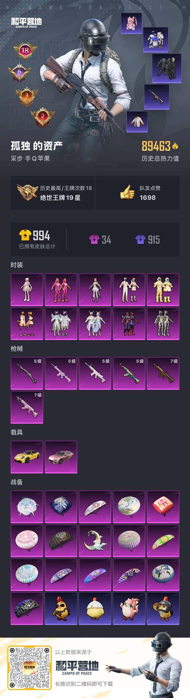[12682858]苹果 手Q-10粉装-6特效枪-2载具-1粉色飞行器-89483热力值-18王牌印记-205套装-267枪皮
