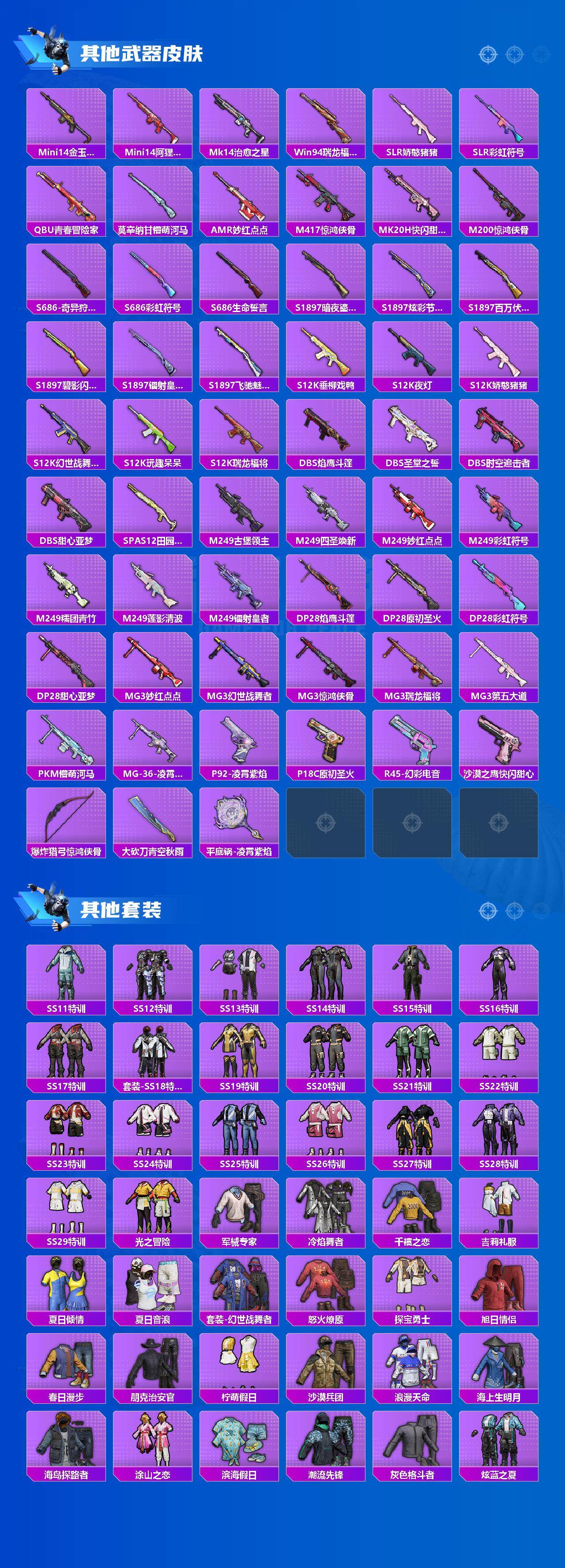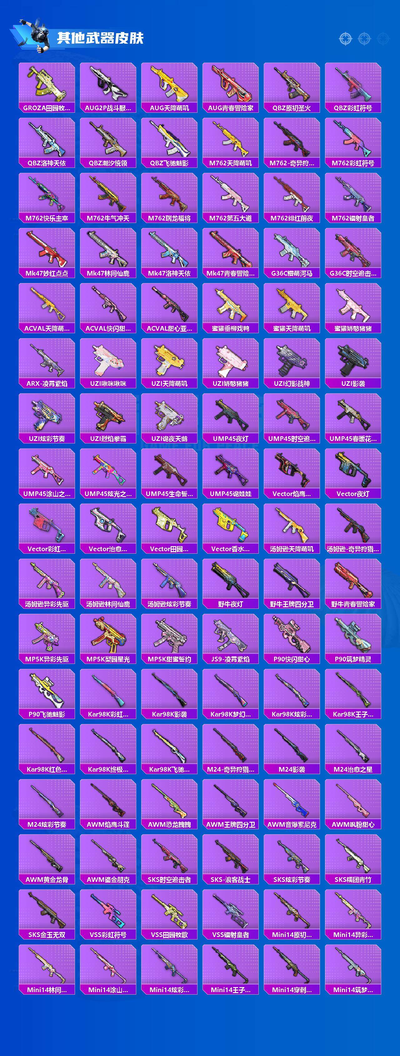 【稀有枪皮】:AKM-夜灯,AKM-奇异狩猎者,AKM-彩虹符号,AKM-影袭,AKM-星之信仰,AKM-星之彼岸,AKM-灼热熔岩,AKM-生命誓言,AKM-破晓战魂,AKM-缤纷海域,AKM-萌趣颜团子,AKM-虎虎生威,AKM-霓虹街区,AKM-龙的传人,M16A4-夜灯,M16A4-幻世战舞者,M16A4-甜心亚梦,M16A4-蓝色火焰,SCAR-L-凝视深渊,SCAR-L-夜灯,SCAR-L-炫彩节奏,SCAR-L-玉兔迎春,SCAR-L-王牌四分卫,SCAR-L-甜蜜誓约,SCAR-L-黄金龙骨,M416-夜灯,M416-滑板小狐,M416-糯团青竹,M416-红色方程式,M416-绯红前夜,M416-黄金龙骨,GROZA-异彩先驱,GROZA-彩虹符号,GROZA-影袭,GROZA-懵萌河马,GROZA-治愈之星,
