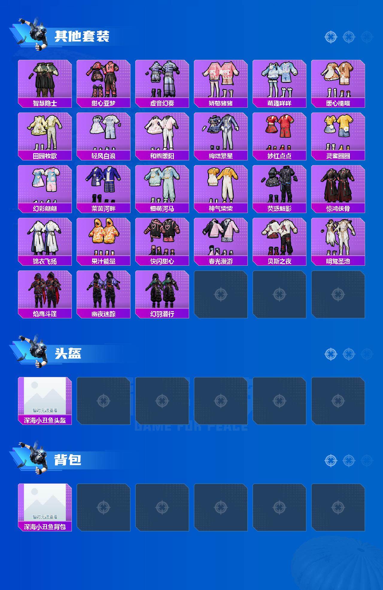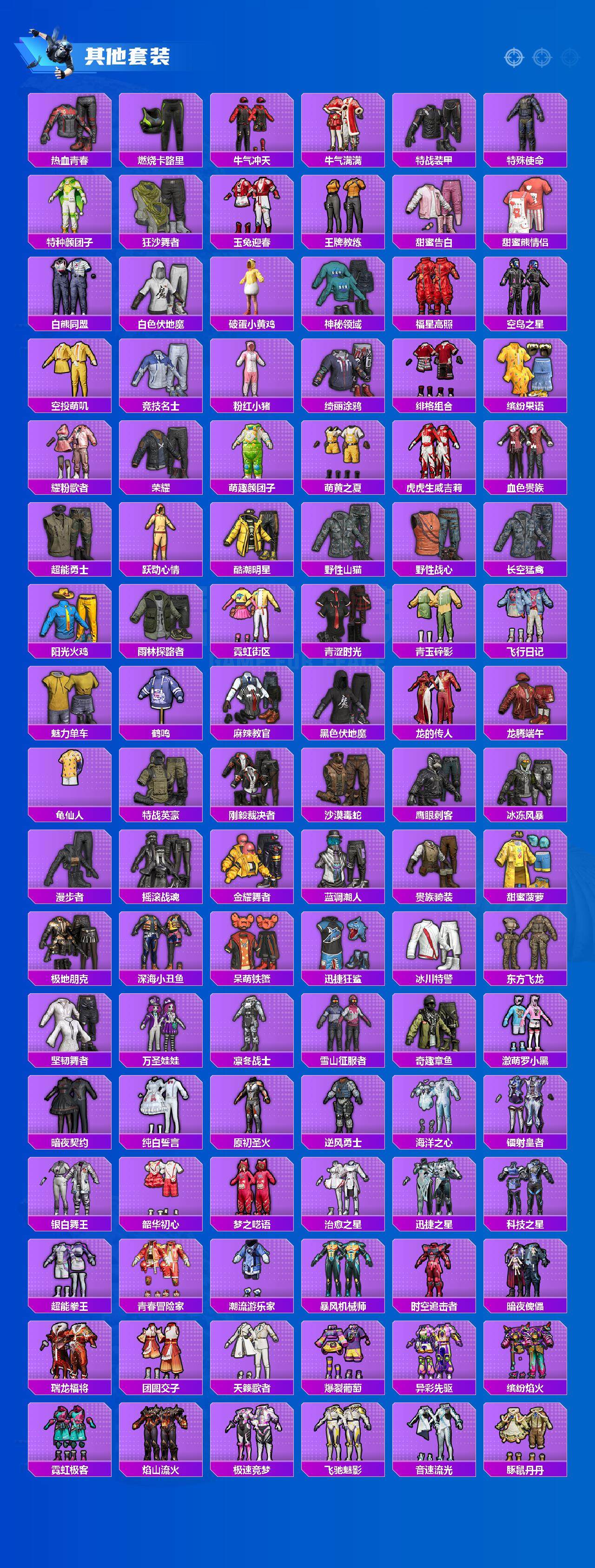 套装-浪漫天命,角色-军刀雅典娜,套装-金羽特工,套装-星河浪客,套装-龟仙人,套装-粉红小猪,套装-狂沙舞者,套装-破蛋小黄鸡,套装-漫步者,套装-暗夜契约,套装-纯白誓言,海洋之心套装,套装-韶华初心,套装-梦之呓语,套装-瑞龙福将,套装-团圆交子,套装-豚鼠丹丹
