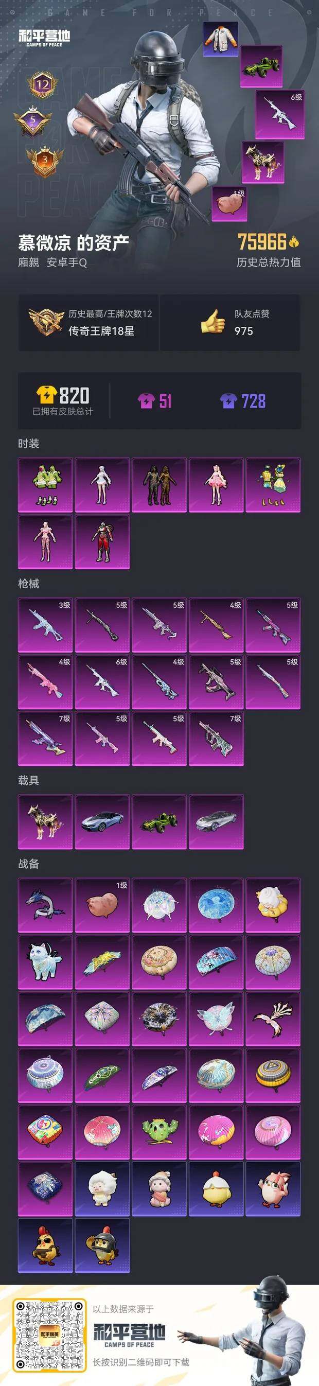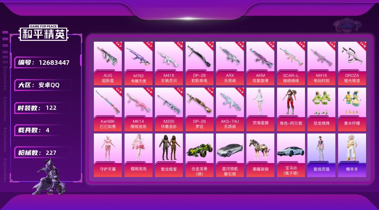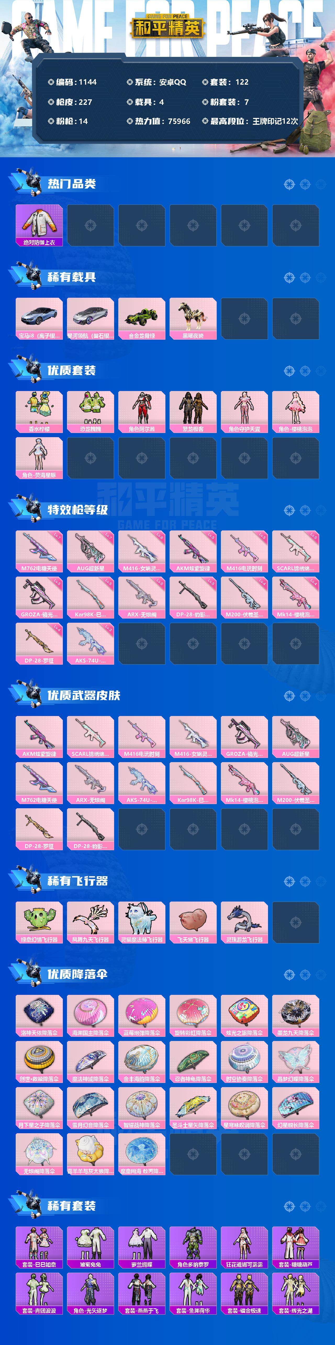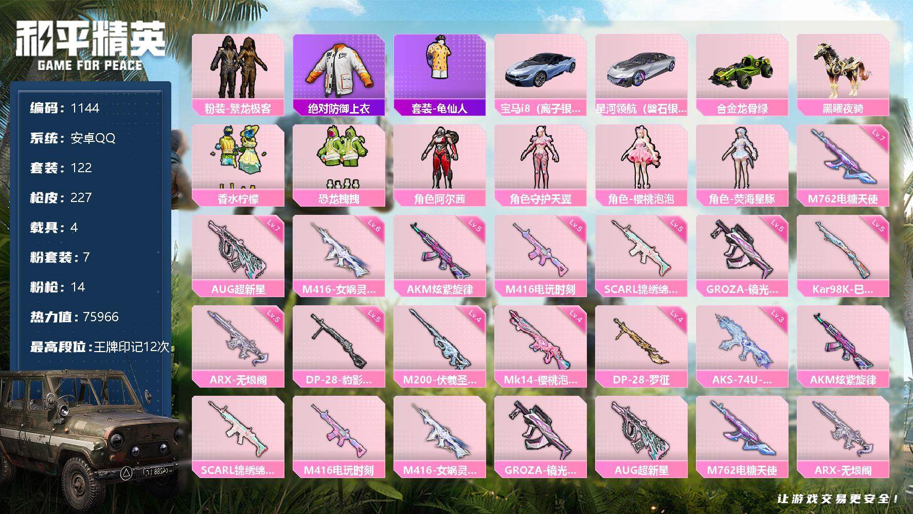 [12683447]安卓 手Q-7粉装-14特效枪-4载具-5粉色飞行器-75966热力值-12王牌印记-122套装-227枪皮
