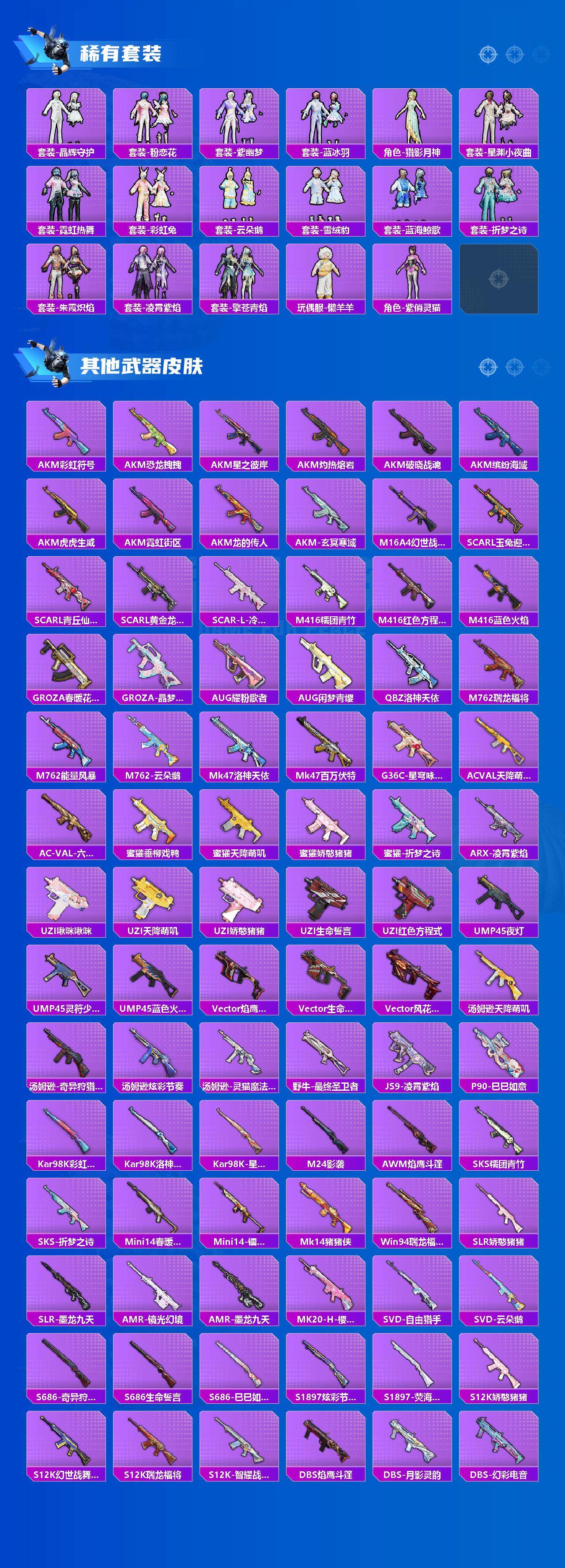 AKM-炫紫旋律,M416-电玩时刻,M416-女娲灵识,GROZA-镜光银凌,AUG-超新星,M762-电糖天使,Kar98K-巳巳如意,Mk14-樱桃泡泡,M200-伏羲圣卦