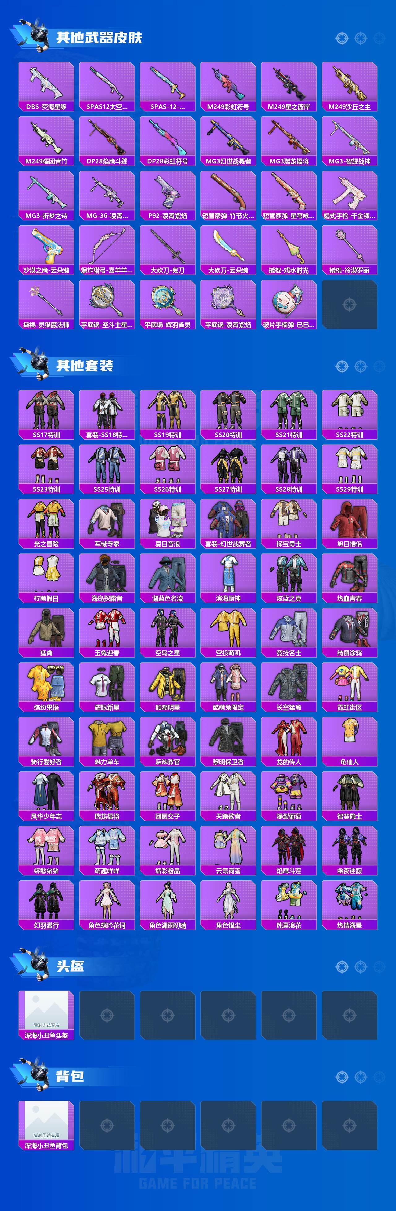 [12683447]安卓 手Q-7粉装-14特效枪-4载具-5粉色飞行器-75966热力值-12王牌印记-122套装-227枪皮 【热门品类】:粉装-繁龙极客,绝对防御上衣,套装-龟仙人 【粉色载具】:宝马i8(离子银),星河领航(磐石银),合金龙骨(绿),黑曜夜骑 【粉色套装】:粉装-香水柠檬,粉装-恐龙拽拽,角色-阿尔茜,粉装-繁龙极客,角色-守护天翼,角色-樱桃泡泡,角色-荧海星豚 【粉色枪皮等级】:AKM-炫紫旋律(五级),SCAR-L-锦绣绵绵(五级),M416-电玩时刻(五级),M416-女娲灵识(六级),GROZA-镜光银凌(五级),AUG-超新星(七级),M762-电糖天使(七级),ARX-无垠阁(五级),AKS-74U-无垠阁(三级),Kar98K-巳巳如意(五级),Mk14-樱桃泡泡(四级),M200-伏羲圣卦(四级),DP-28-罗征(四级),DP-28-豹影疾电(五级) 【粉色枪皮】:AKM-炫紫旋律,SCAR-L-锦绣绵绵,M416-电玩时刻,M416-女娲灵识,GROZA-镜光银凌,AUG-超新星,M762-电糖天使,ARX-无垠阁,AKS-74U-无垠阁,Kar98K-巳巳如意,Mk14-樱桃泡泡,M200-伏羲圣卦,DP-28-罗征,DP-28-豹影疾电 【粉色飞行器】:绿意幻情飞行器,凤舞九天飞行器,灵猫魔法师飞行器,飞天猪飞行器,灵珠游龙飞行器 【粉色降落伞】:洛神天依降落伞,海渊国主降落伞,蓝莓炮弹降落伞,旋转彩虹降落伞,炫光之旅降落伞,墨龙九天降落伞,创世·救赎降落伞,魔法神域降落伞,金丰海韵降落伞,忍者神龟降落伞,时空协奏降落伞,晶梦幻蝶降落伞,月下星之子降落伞,雪月幻音降落伞,智耀战神降落伞,圣斗士星矢降落伞,星穹咏叹调降落伞,幻星舰长降落伞,无垠阁降落伞,喜羊羊与灰太狼降落伞,魔童闹海 敖丙降落伞 【稀有套装】:套装-龟仙人,套装-巳巳如意,套装-雏菊兔兔,套装-萝兰蝴蝶,角色-多纳泰罗,角色-狂花道·娜可露露,套装-糖糖葫芦,套装-青团波波,角色-光矢逐梦,套装-燕燕于飞,套装-鱼渊荷华,套装-镭金极速,套装-辉光之湖,套装-晶辉守护,套装-粉恋花,套装-紫幽梦,套装-蓝冰羽,角色-猎影月神,套装-星渊小夜曲,套装-霓虹热舞,套装-彩虹兔,套装-云朵鹅,套装-雪绒豹,套装-蓝海鲸歌,套装-折梦之诗,套装-朱霞炽焰,套装-凌霄紫焰,套装-