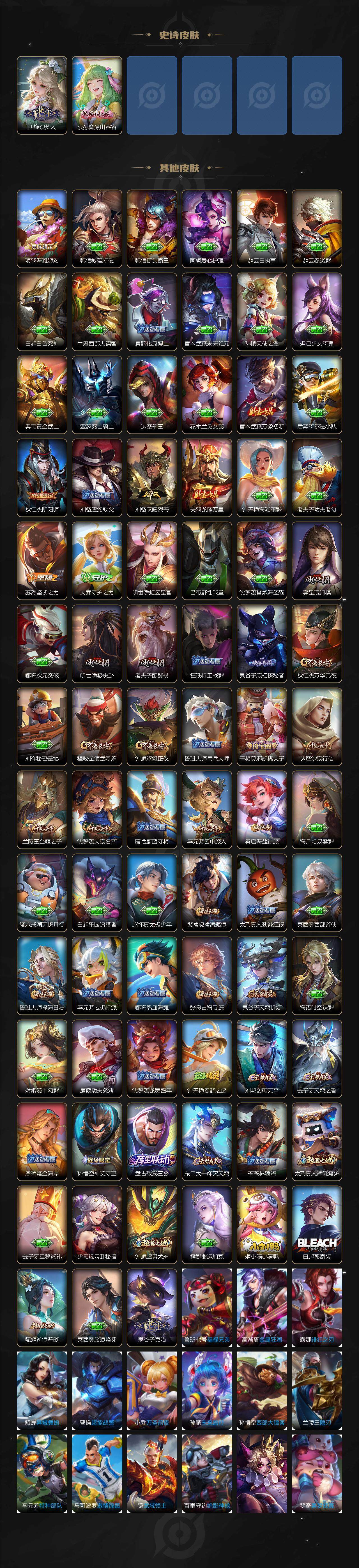 【史诗皮肤】:貂蝉圣诞恋歌,甄姬冰雪圆舞曲,王昭君偶像歌手,宫本武藏鬼剑武藏,孙尚香水果甜心,妲己魅力维加斯,妲己女仆咖啡,墨子金属风暴,曹操幽灵船长,吕布末日机甲,张飞乱世虎臣,花木兰水晶猎龙者,夏侯惇乘风破浪,雅典娜冰冠公主,安琪拉心灵骇客,蔡文姬舞动绿茵,李元芳逐浪之夏,程咬金功夫厨神,白起星夜王子,大乔猫狗日记,狄仁杰鹰眼统帅,李元芳银河之约,瑶遇见神鹿,裴擒虎李小龙,云中君纤云弄巧,嫦娥拒霜思,狂铁电玩高手,鬼谷子五谷丰年,元歌无心,梦奇顽趣,阿古朵江河有灵,姬小满妄想食味,亚连破空之剑,李白谪仙醉月,赵怀真器灵浮梦炉,黄忠百相守梦,西施织梦人,公孙离涂山容容