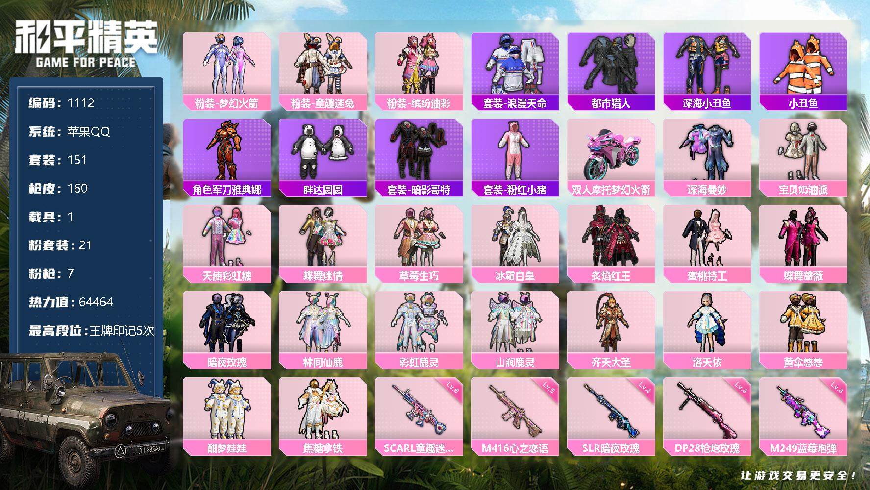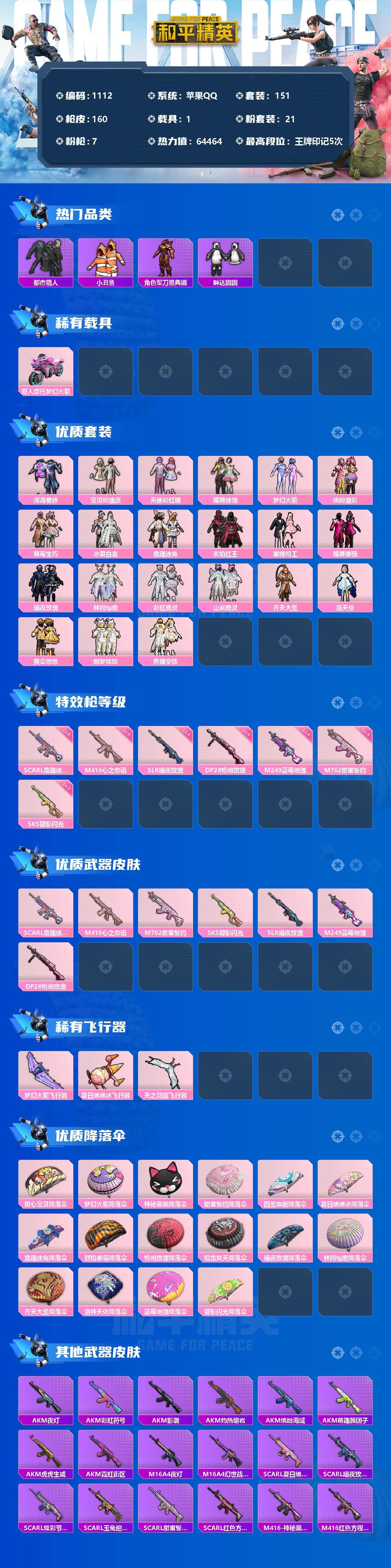 [12684714]苹果 手Q-21粉装-7特效枪-1载具-3粉色飞行器-64464热力值-5王牌印记-151套装-160枪皮 【热门品类】:粉装-梦幻火箭,粉装-童趣迷兔,粉装-缤纷油彩,套装-浪漫天命,套装-都市猎人,套装-深海小丑鱼,套装-小丑鱼,角色-军刀雅典娜,套装-胖达圆圆,套装-暗影哥特,套装-粉红小猪 【粉色载具】:双人摩托-梦幻火箭 【粉色套装】:粉装-深海曼妙,粉装-宝贝奶油派,粉装-天使彩虹糖,粉装-蝶舞迷情,粉装-梦幻火箭,粉装-缤纷油彩,粉装-草莓生巧,粉装-冰霜白皇,粉装-童趣迷兔,粉装-炙焰红王,粉装-蜜桃特工,粉装-蝶舞蔷薇,粉装-暗夜玫瑰,粉装-林间仙鹿,粉装-彩虹鹿灵,粉装-山涧鹿灵,粉装-齐天大圣,角色-洛天依,粉装-黄伞悠悠,粉装-酣梦娃娃,粉装-焦糖拿铁 【粉色枪皮等级】:SCAR-L-童趣迷兔(六级),M416-心之恋语(五级),M762-甜蜜誓约(四级),SKS-碧影闪光(三级),SLR-暗夜玫瑰(四级),M249-蓝莓炮弹(四级),DP-28-枪炮玫瑰(四级) 【粉色枪皮】:SCAR-L-童趣迷兔,M416-心之恋语,M762-甜蜜誓约,SKS-碧影闪光,SLR-暗夜玫瑰,M249-蓝莓炮弹,DP-28-枪炮玫瑰 【粉色飞行器】:梦幻火箭飞行器,夏日绵绵冰飞行器,天之羽翼飞行器 【粉色降落伞】:甜心宝贝降落伞,梦幻火箭降落伞,神秘黑猫降落伞,甜蜜誓约降落伞,四圣焕新降落伞,夏日绵绵冰降落伞,童趣迷兔降落伞,烈焰拳霸降落伞,枪炮玫瑰降落伞,焰龙焚天降落伞,暗夜玫瑰降落伞,林间仙鹿降落伞,齐天大圣降落伞,洛神天依降落伞,蓝莓炮弹降落伞,碧影闪光降落伞 【稀有枪皮】:AKM-夜灯,AKM-彩虹符号,AKM-影袭,AKM-灼热熔岩,AKM-缤纷海域,AKM-萌趣颜团子,AKM-虎虎生威,AKM-霓虹街区,M16A4-夜灯,M16A4-幻世战舞者,SCAR-L-夏日绵绵冰,SCAR-L-暗夜玫瑰,SCAR-L-炫彩节奏,SCAR-L-玉兔迎春,SCAR-L-甜蜜誓约,SCAR-L-红色方程式,M416-神秘黑猫,M416-红色方程式,M416-蓝色火焰,GROZA-异彩先驱,GROZA-彩虹符号,GROZA-影袭,GROZA-林间仙鹿,GROZA-治愈之星,GROZA-蓝莓炮弹,AUG-耀粉歌者,AUG-青春冒险家,QBZ-彩虹符号,QBZ-洛神