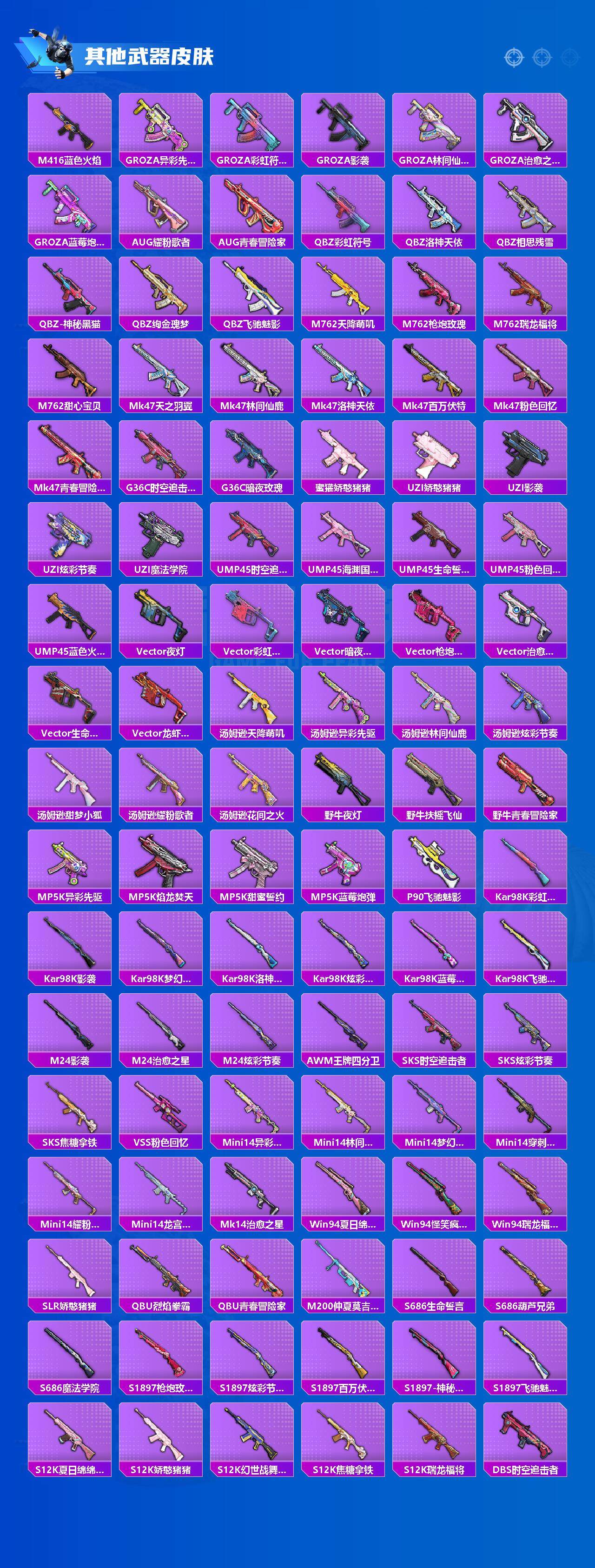 【稀有枪皮】:AKM-夜灯,AKM-彩虹符号,AKM-影袭,AKM-灼热熔岩,AKM-缤纷海域,AKM-萌趣颜团子,AKM-虎虎生威,AKM-霓虹街区,M16A4-夜灯,M16A4-幻世战舞者,SCAR-L-夏日绵绵冰,SCAR-L-暗夜玫瑰,SCAR-L-炫彩节奏,SCAR-L-玉兔迎春,SCAR-L-甜蜜誓约,SCAR-L-红色方程式,M416-神秘黑猫,M416-红色方程式,M416-蓝色火焰,GROZA-异彩先驱,GROZA-彩虹符号,GROZA-影袭,GROZA-林间仙鹿,GROZA-治愈之星,GROZA-蓝莓炮弹,AUG-耀粉歌者,AUG-青春冒险家,QBZ-彩虹符号,QBZ-洛神