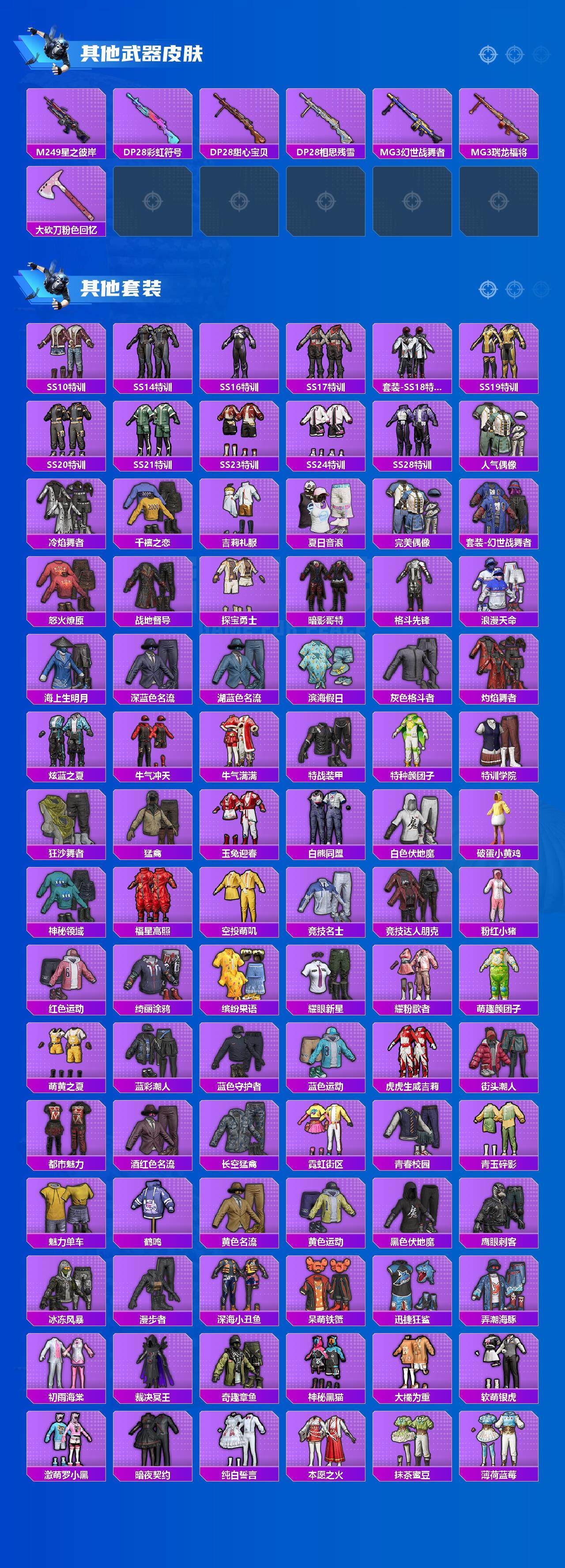 - [9946746]苹果q-有二次-小丑-金迪迦-都市猎人-寒蝎-小金鞋-蓝螳螂-第五大道-火箭少女-花间之火-智能音符-小丑鱼-兔斯基-小黄鸭-满级相思残雪UMP-菠萝头盔-14粉装-5特效枪-1满级