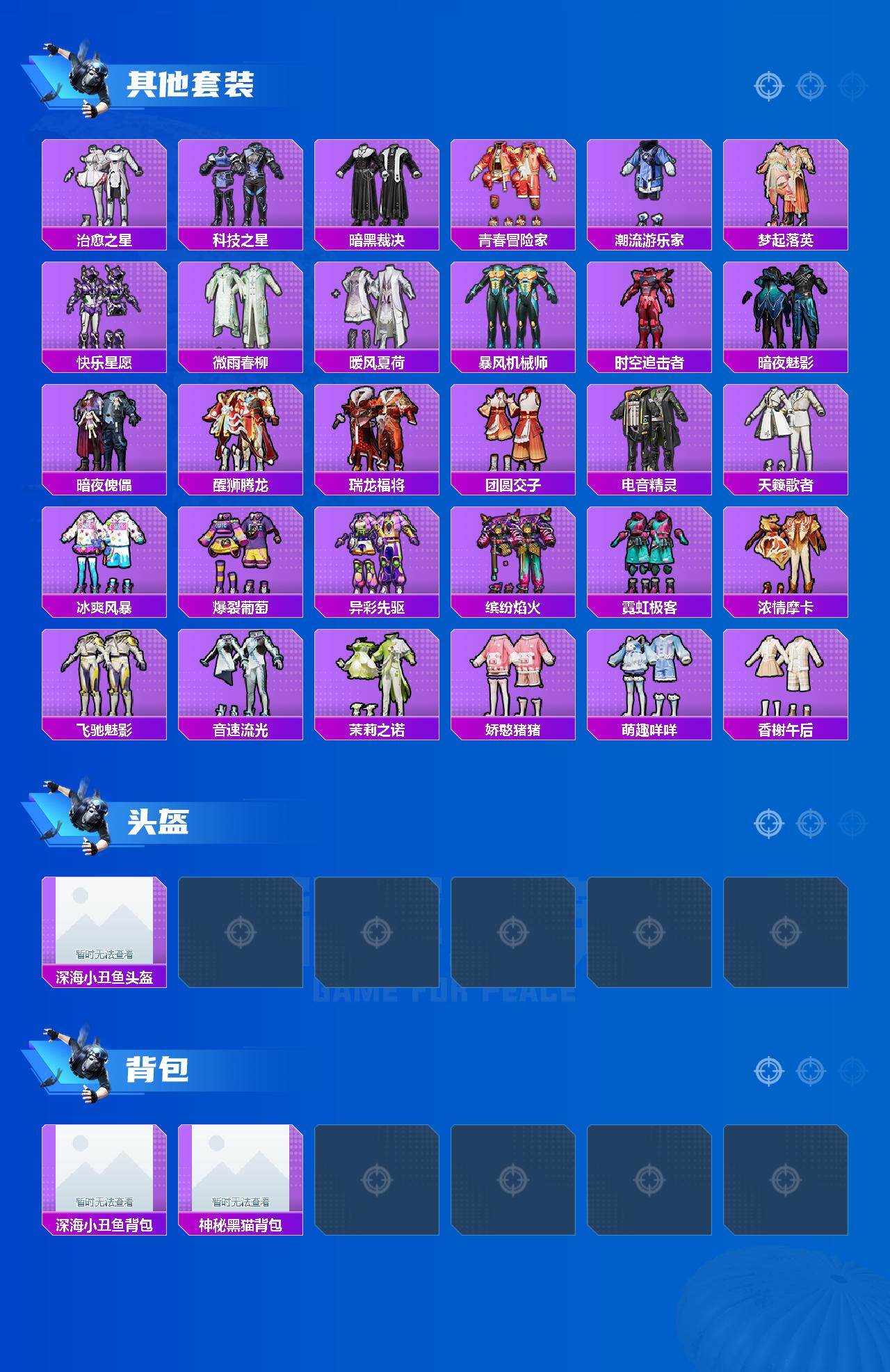 套装-浪漫天命,角色-军刀雅典娜,套装-暗影哥特,套装-粉红小猪,套装-狂沙舞者,套装-破蛋小黄鸡,套装-漫步者,套装-弄潮海豚,套装-暗夜契约,套装-纯白誓言,抹茶蜜豆套装,薄荷蓝莓套装,套装-梦起落英,套装-醒狮腾龙,套装-瑞龙福将,套装-团圆交子