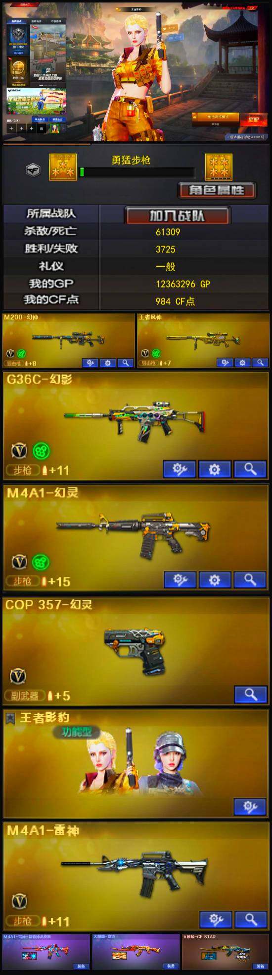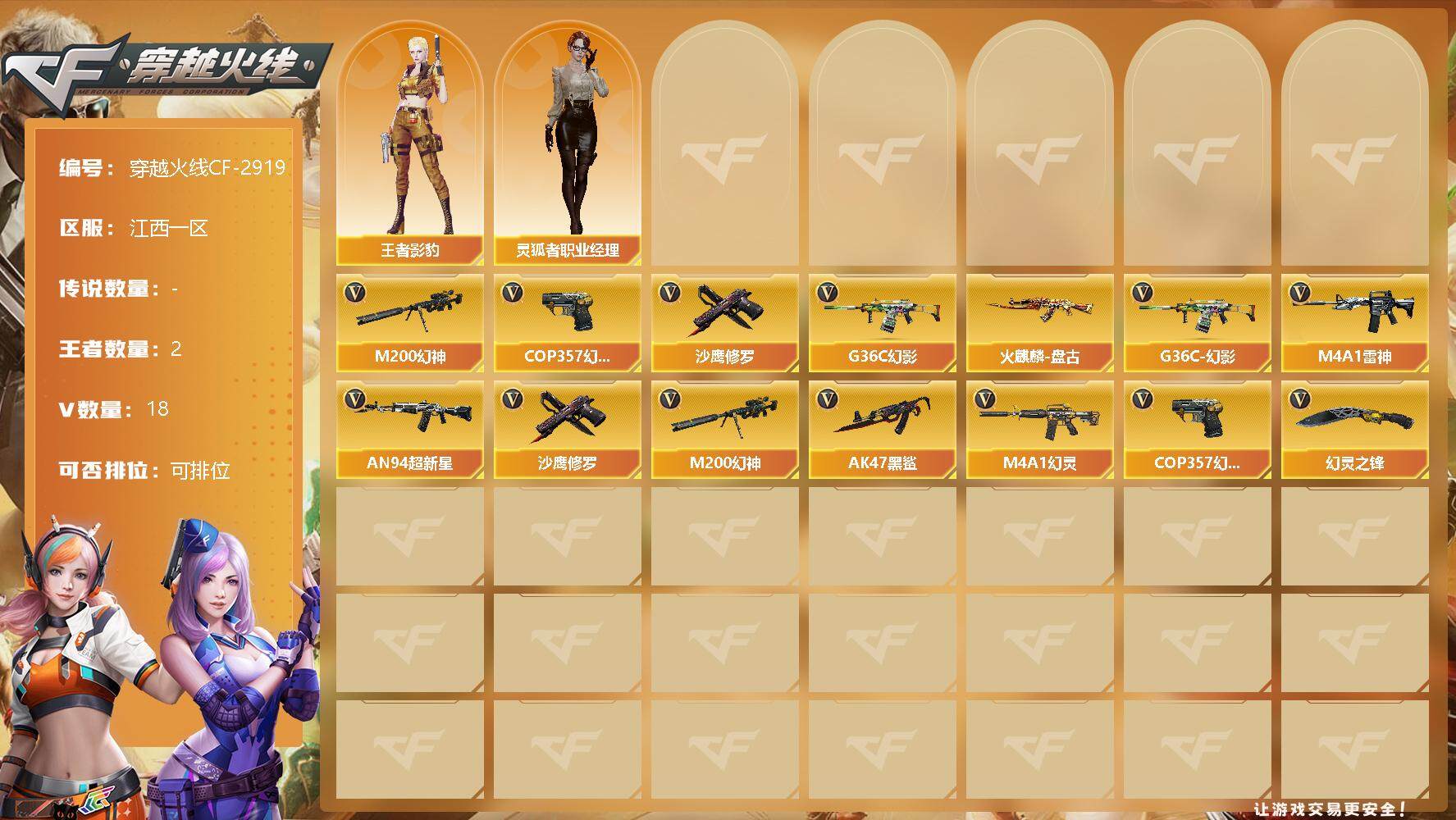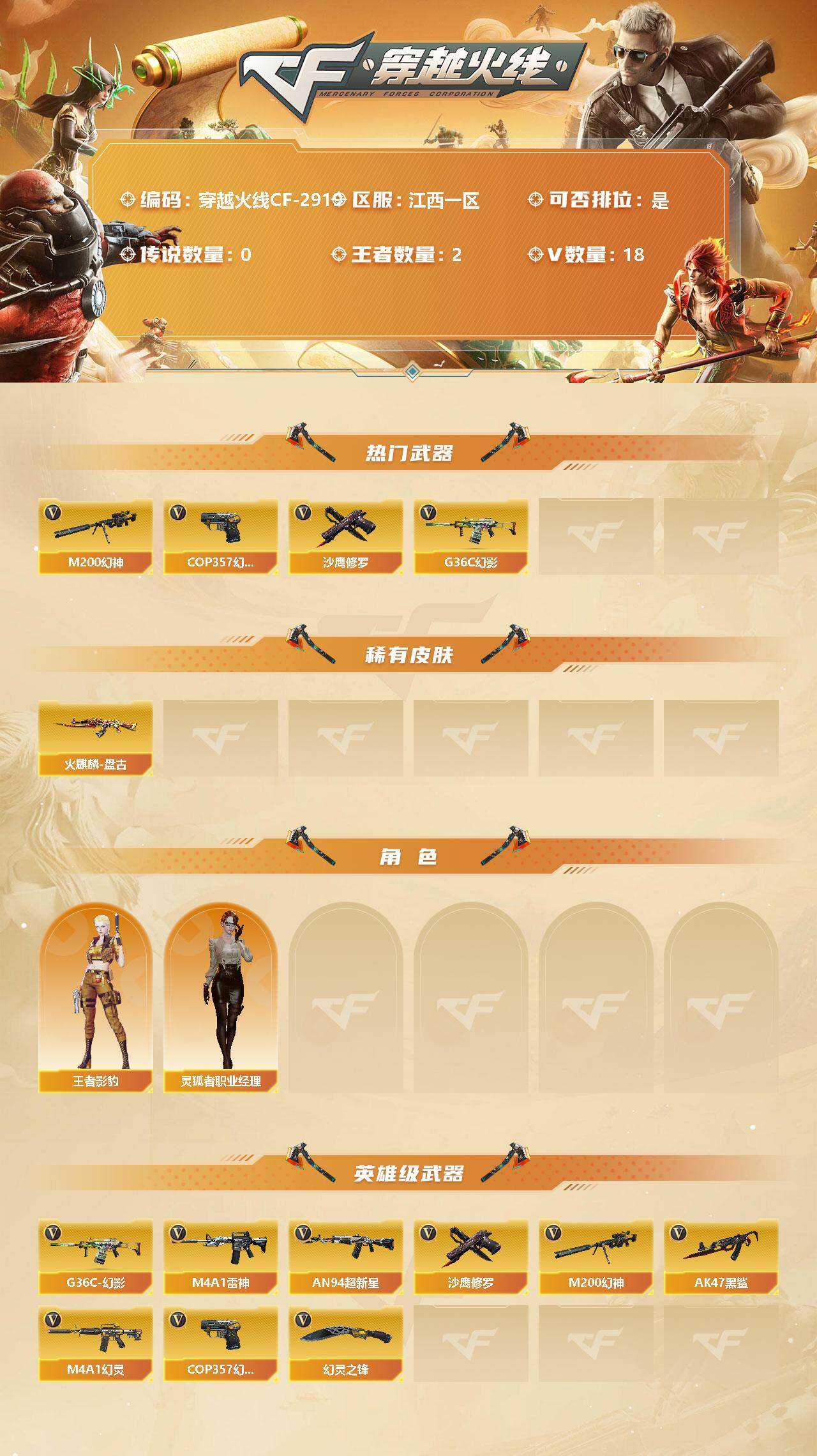 [12684716]江西一区-18V-2王者-0炫金 【热门武器】:G36C-幻影,M200-幻神,COP 357-幻灵,沙鹰-修罗*2 【稀有皮肤】:火麒麟-盘古 【角色】:王者影豹,灵狐者-职业经理 【英雄级武器】:M4A1-幻灵,COP 357-幻灵,幻灵之锋,G36C-幻影,M4A1-雷神,AN94-超新星,M200-幻神,AK47-黑鲨,沙鹰-修罗*2 【特殊枪械】: