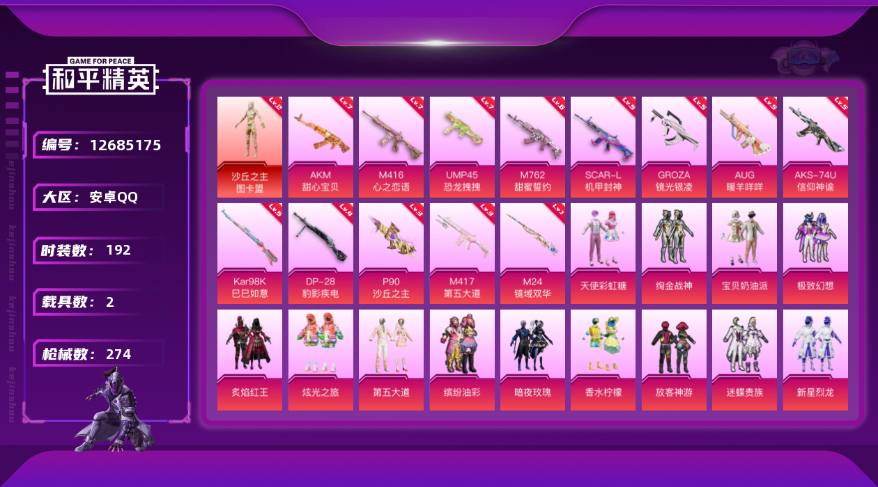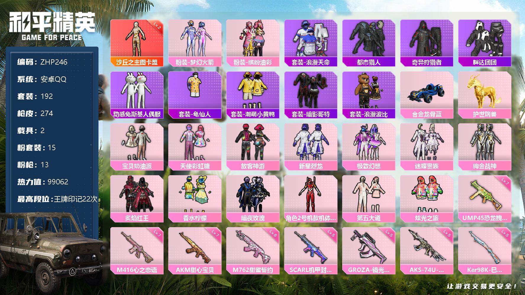 [12685175]素材身法号/绝世印记1/地铁满天赋 安卓 手Q-1神装-15粉装-13特效枪-2载具-9粉色飞行器-9.9w热力值-22王牌印记-192套装-274枪皮【红色神装等级】:沙丘之主-图卡盟(二级)【热门品类】:粉装-梦幻火箭,粉装-缤纷油彩,套装-浪漫天命,套装-都市猎人,套装-奇异狩猎者,套装-胖达团团,套装-动感兔斯基人偶服,套装-龟仙人,套装-潮萌小黄鸭,套装-暗影哥特,套装-浪漫波比【粉色载具】:合金龙骨(蓝),护世瑞兽【粉色套装】:粉装-宝贝奶油派,粉装-天使彩虹糖,粉装-梦幻火箭,粉装-缤纷油彩,粉装-放客神游,粉装-新星烈龙,粉装-极致幻想,粉装-迷蝶贵族,粉装-绚金战神,粉装-炙焰红王,粉装-香水柠檬,粉装-暗夜玫瑰,角色-2号机款机体服,粉装-第五大道,粉装-炫光之旅【粉色枪皮等级】:AKM-甜心宝贝(七级),SCAR-L-机甲封神(五级),M416-心之恋语(七级),GROZA-镜光银凌(五级),AUG-暖羊咩咩(五级),M762-甜蜜誓约(六级),UMP45-恐龙拽拽(七级),AKS-74U-信仰神谕(五级),P90-沙丘之主(三级),Kar98K-巳巳如意(五级),M24-镜域双华(一级),M417-第五大道(三级),DP-28-豹影疾电(四级)【粉色飞行器】:酣梦熊熊飞行器,梦幻火箭飞行器,心之恋语飞行翼,沙丘之主天马,龙翔九天飞行器,凤舞九天飞行器,万象金身飞行器,月下星之子飞行器