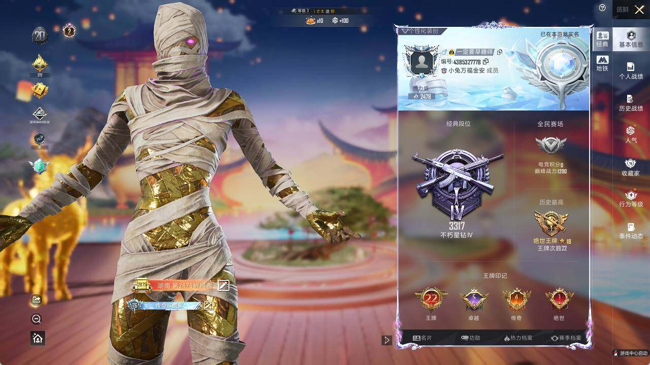 - PX_2095059-实名: 可修改 贵族等级: V7 英雄数: 124 皮肤数: 114 传说皮: 冠军飞将,黄金白羊座,猫影幻舞,超时空战士-狄仁杰,山海·苍雷引,乘龙·淬吴钩 限定皮: 御风骁将,龙胆,烈魂,孙行者,五谷丰年,神器·万象笔,山海·玄木吟