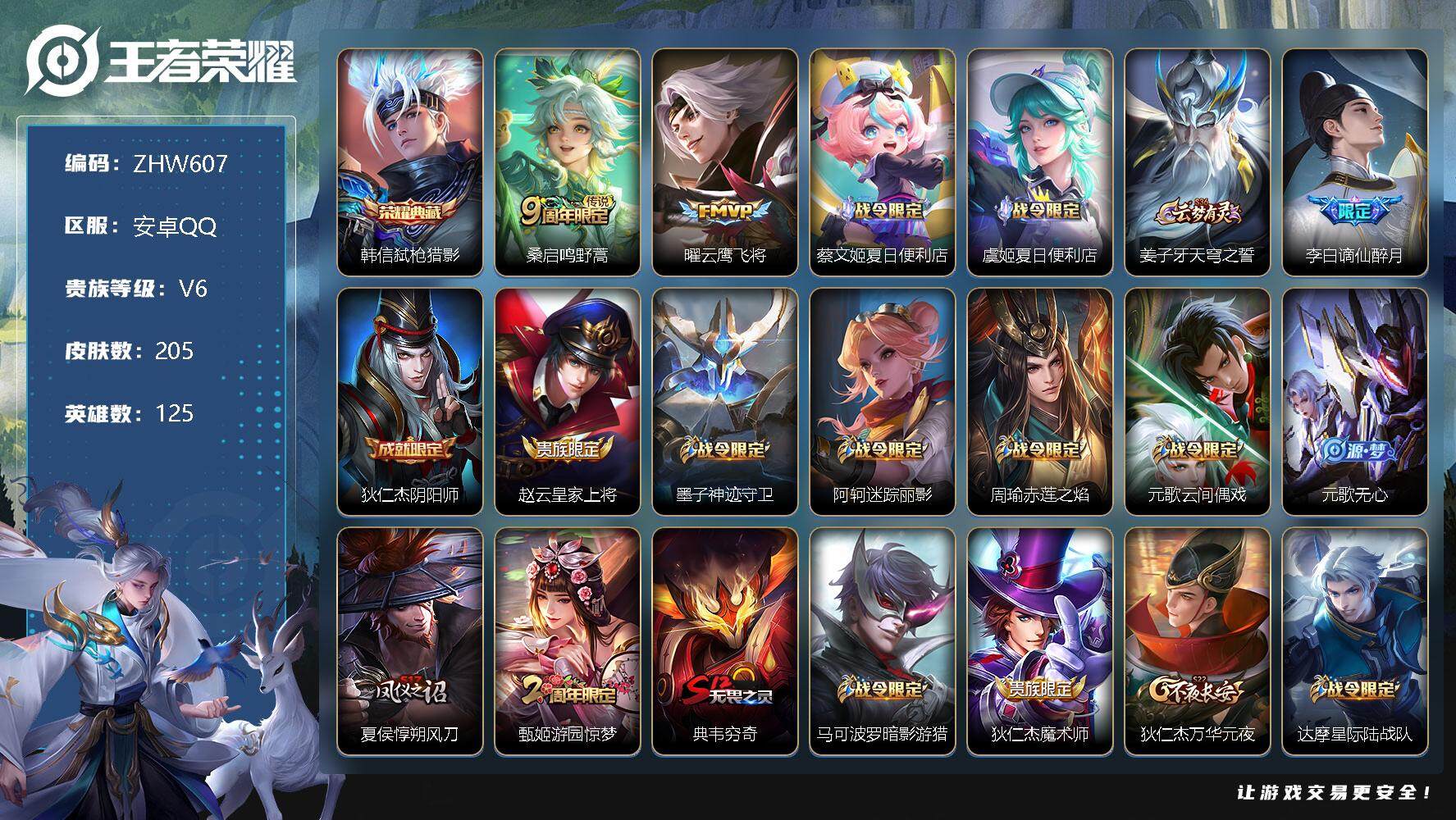 [12685050]安卓Q-V6-最强王者段位-125英雄-205皮肤-1典藏-2传说-58史诗 【荣耀典藏】:韩信弑枪猎影 【传说皮肤】:桑启鸣野蒿,曜云鹰飞将 【限定皮肤】:蔡文姬夏日便利店,虞姬夏日便利店,姜子牙天穹之誓,李白谪仙醉月,狄仁杰阴阳师,赵云皇家上将,墨子神迹守卫,阿轲迷踪丽影,周瑜赤莲之焰,元歌云间偶戏,元歌无心,夏侯惇朔风刀,甄姬游园惊梦,典韦穷奇,马可波罗暗影游猎,狄仁杰魔术师,狄仁杰万华元夜,达摩星际陆战队,达摩沙漠行僧,项羽海滩派对,老夫子醍醐杖,老夫子航海奇遇记,程咬金演武夺筹,刘邦夺宝奇兵,韩信傲雪梅枪,兰陵王驯魔猎人,亚瑟潮玩骑士王,孙悟空至尊宝,牛魔御旌,李元芳银河之约,李元芳云中旅人,钟馗驱傩正仪,干将莫邪胡桃夹子,雅典娜单词大作战,雅典娜黎明之约,鬼谷子原初探秘者,苏烈千军破阵,弈星混沌棋,沈梦溪星空之诺,沈梦溪大漠名商,明世隐疑决卦,裴擒虎李小龙,裴擒虎擒涛扼浪,狂铁御狮,米莱狄御霄,米莱狄胡桃异想国,云中君纤云弄巧,盾山御銮,猪八戒西部大镖客,上官婉儿梁祝,蒙犽狂想玩偶喵,鲁班大师探海日志,桑启海盐诗旅,阿古朵江河有灵,张良古海寻踪,鬼谷子天穹祈灯,姬小满妄想食味,刘邦剑破天穹,周瑜熔金海岸 【赛季限定】:夏侯惇朔风刀,典韦穷奇,狄仁杰万华元夜,达摩沙漠行僧,老夫子醍醐杖,程咬金演武夺筹,张良古海寻踪,牛魔御旌,李元芳云中旅人,钟馗驱傩正仪,雅典娜黎明之约,鬼谷子原初探秘者,苏烈千军破阵,弈星混沌棋,沈梦溪大漠名商,明世隐疑决卦,裴擒虎擒涛扼浪,狂铁御狮,米莱狄御霄,盾山御銮,鲁班大师探海日志,桑启海盐诗旅,鬼谷子天穹祈灯,刘邦剑破天穹,姜子牙天穹之誓 【战令限定】:墨子神迹守卫,蔡文姬夏日便利店,虞姬夏日便利店,阿轲迷踪丽影,周瑜赤莲之焰,元歌云间偶戏,马可波罗暗影游猎,达摩星际陆战队,老夫子航海奇遇记,刘邦夺宝奇兵,兰陵王驯魔猎人,亚瑟潮玩骑士王,李元芳银河之约,雅典娜单词大作战,沈梦溪星空之诺,米莱狄胡桃异想国,猪八戒西部大镖客,蒙犽狂想玩偶喵 【史诗皮肤】:赵云皇家上将,赵云未来纪元,貂蝉圣诞恋歌,狄仁杰魔术师,廉颇地狱岩魂,宫本武藏鬼剑武藏,孙尚香水果甜心,妲己魅力维加斯,墨子金属风暴,曹操幽灵船长,孙悟空至尊宝,花木兰水晶猎龙者,刘邦德古拉伯爵,夏侯惇乘风破浪,小乔缤纷独角兽,甄姬游园惊梦,亚瑟心灵战警,安琪拉心灵骇客,百里守约